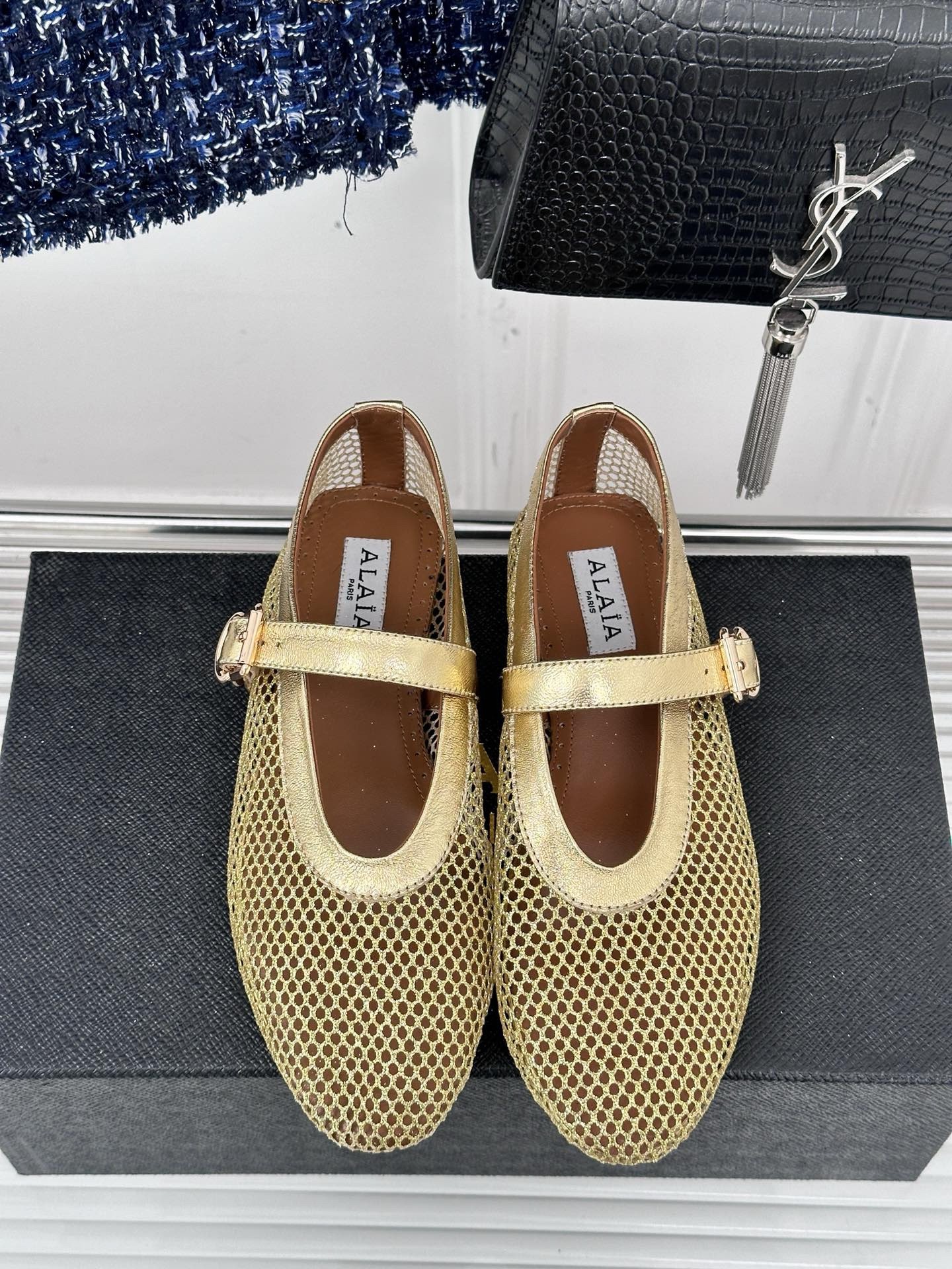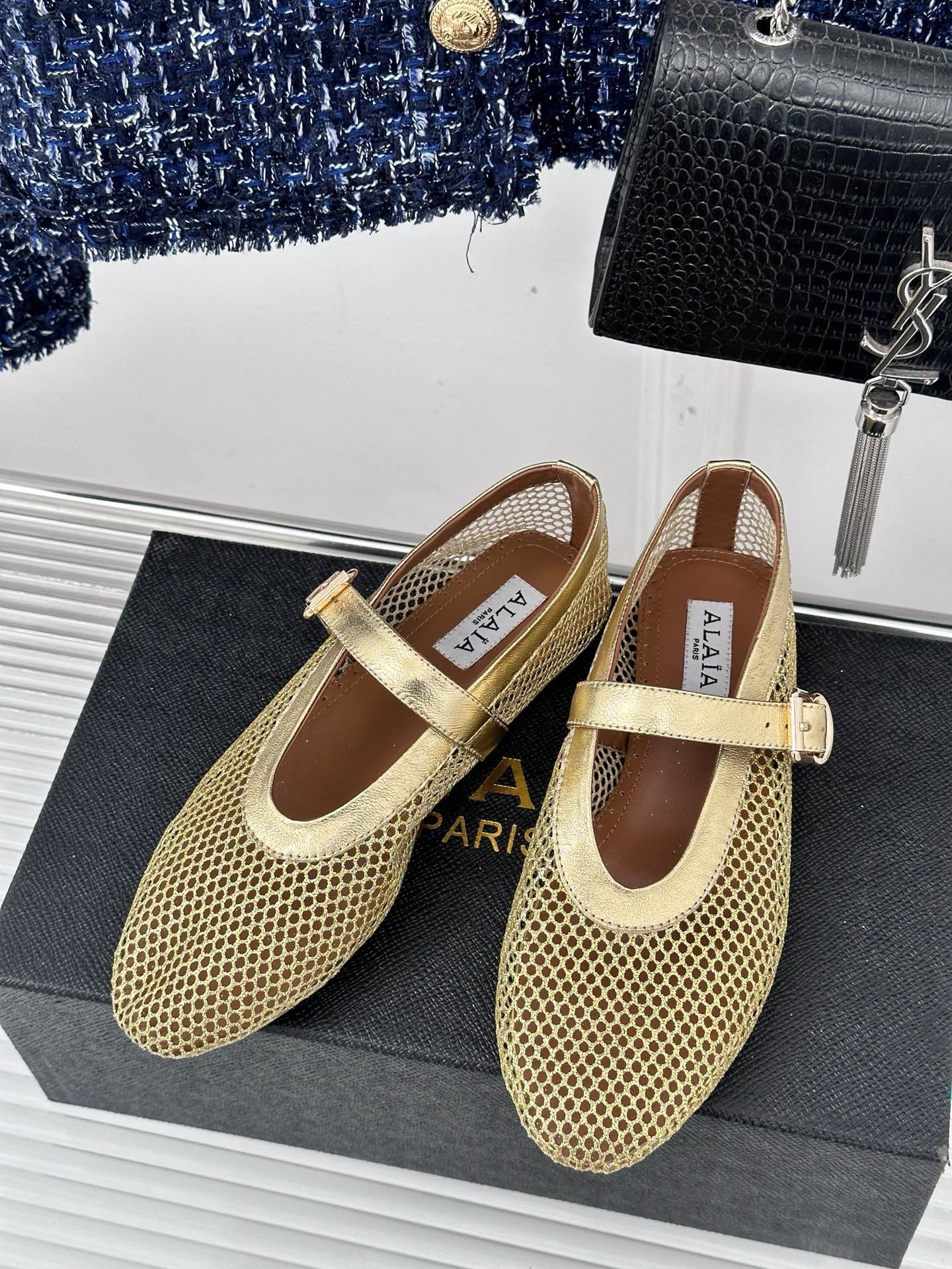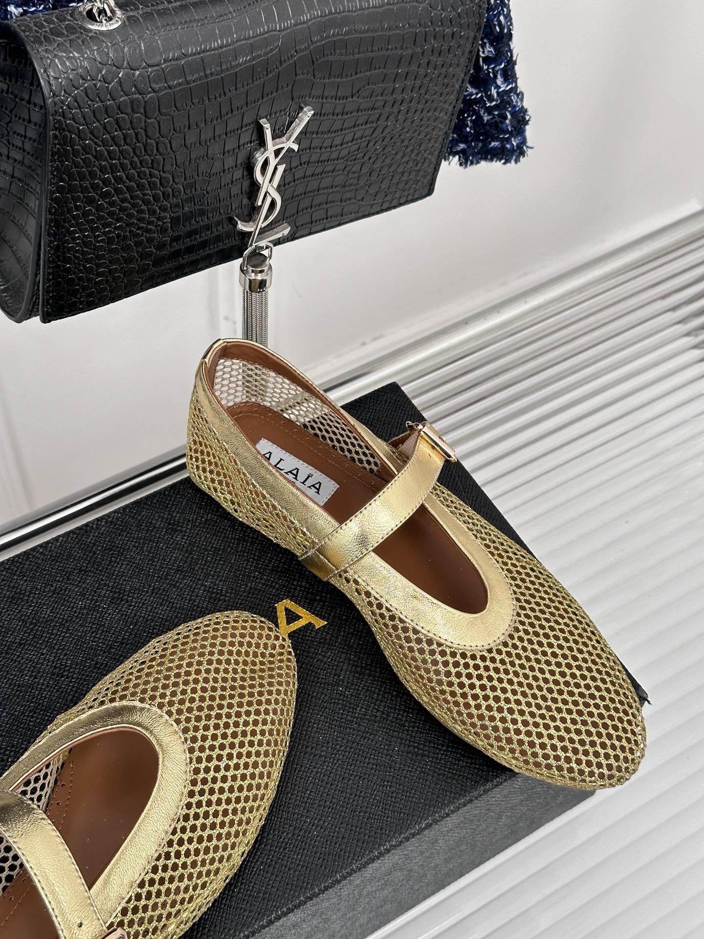 Alaïa gives the humble ballet flats a modern update. This pair has been crafted from mesh reinforced with glossy metallic leather straps. They have classic round toes.