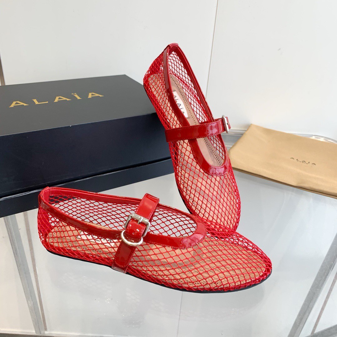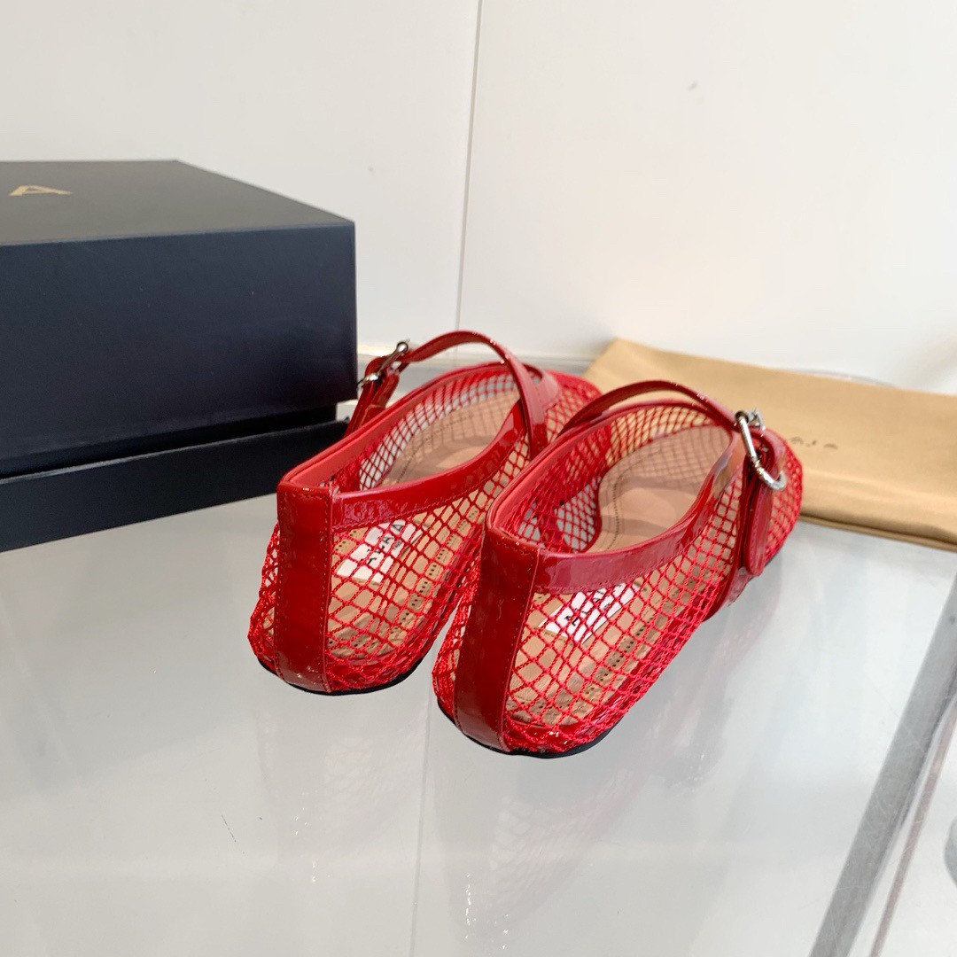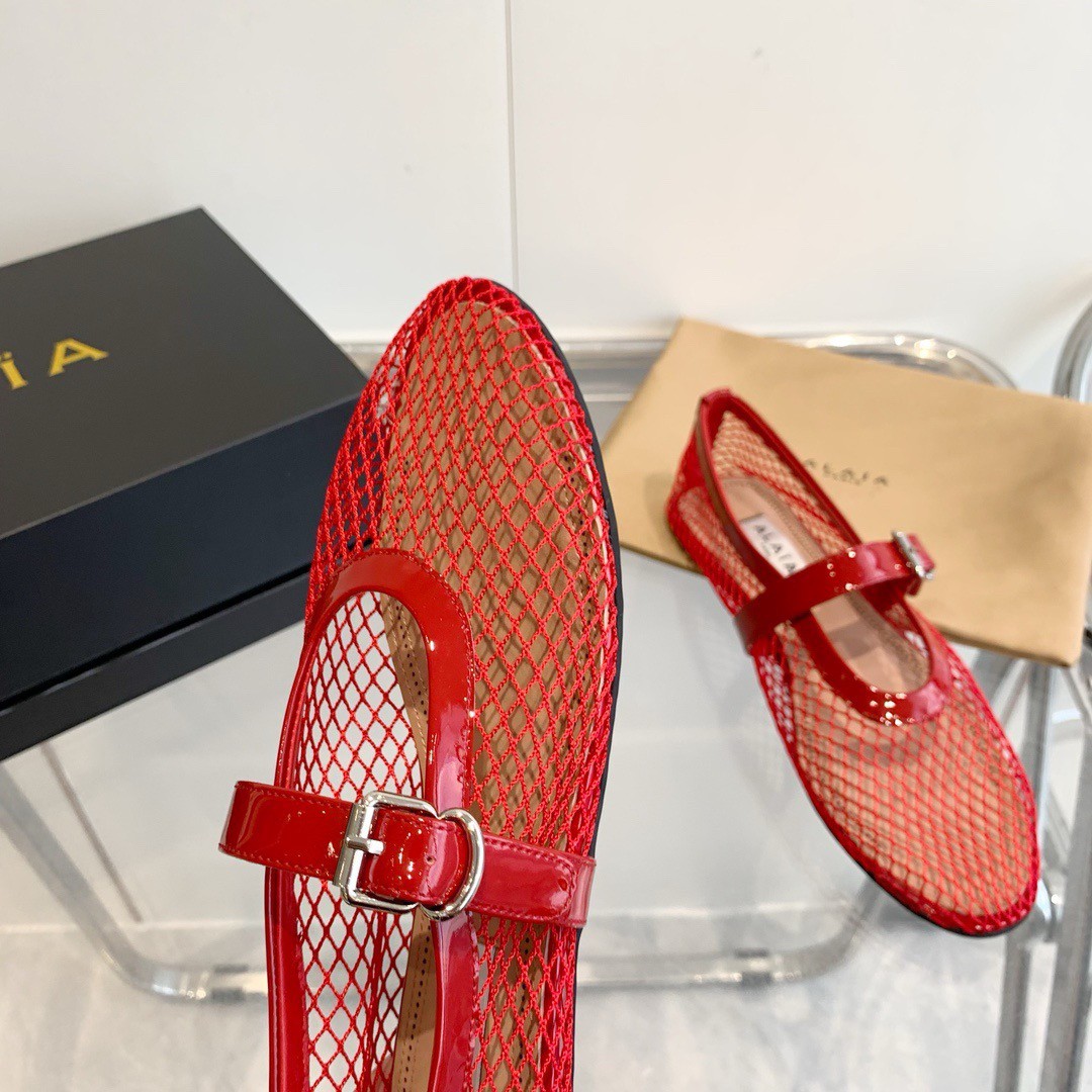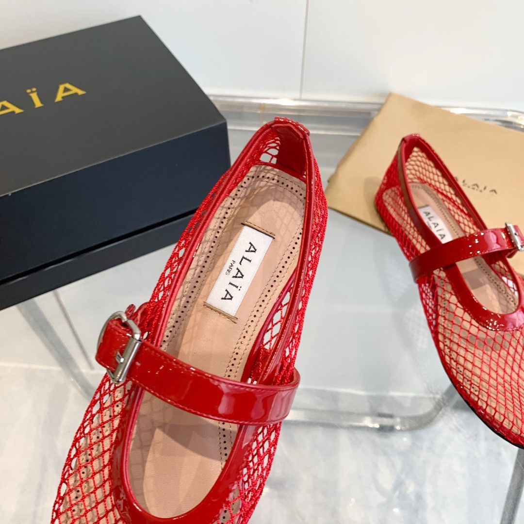 Alaïa gives the humble ballet flats a modern update. This pair has been crafted from mesh reinforced with glossy patent-leather straps. They have classic round toes.