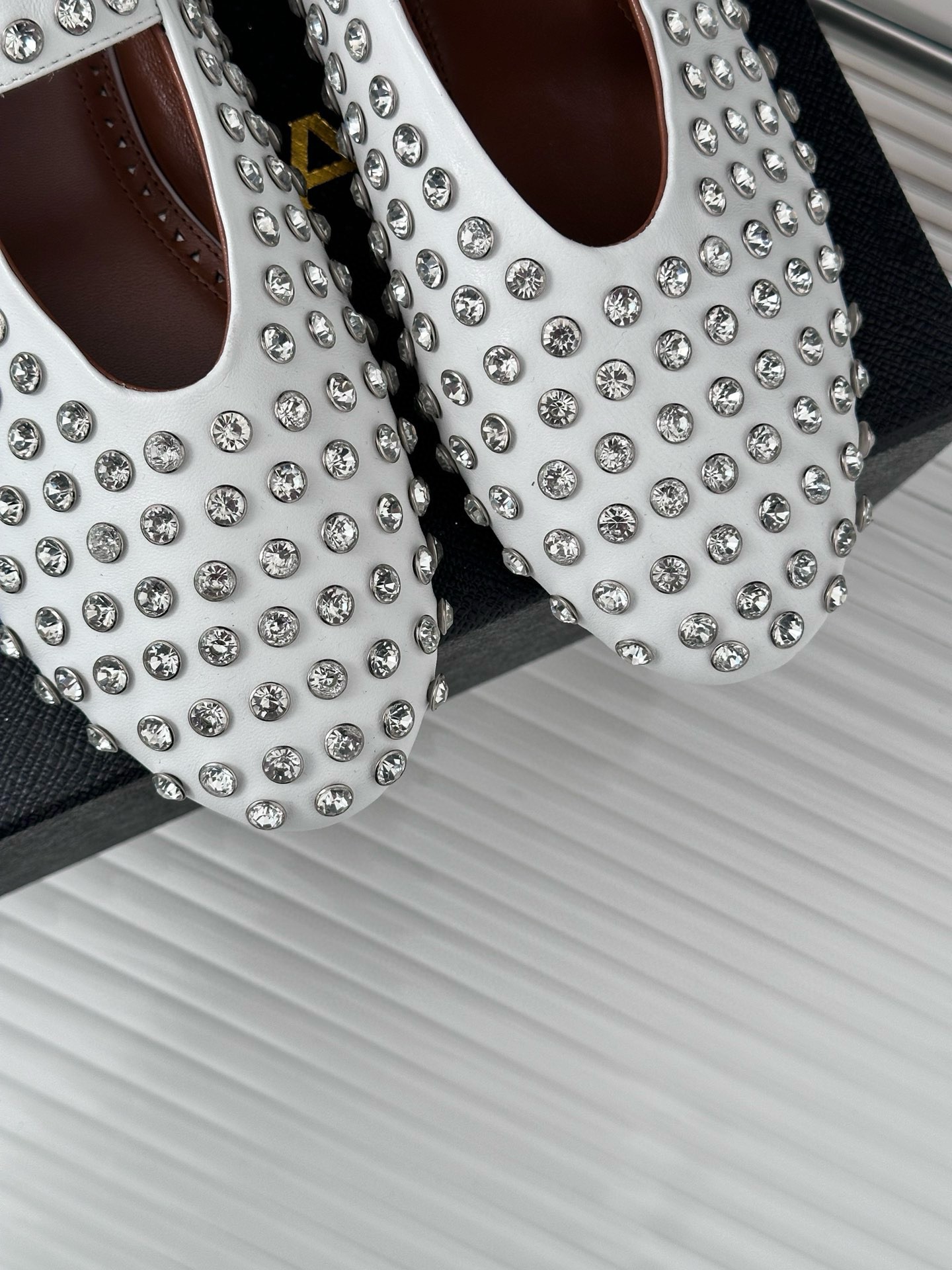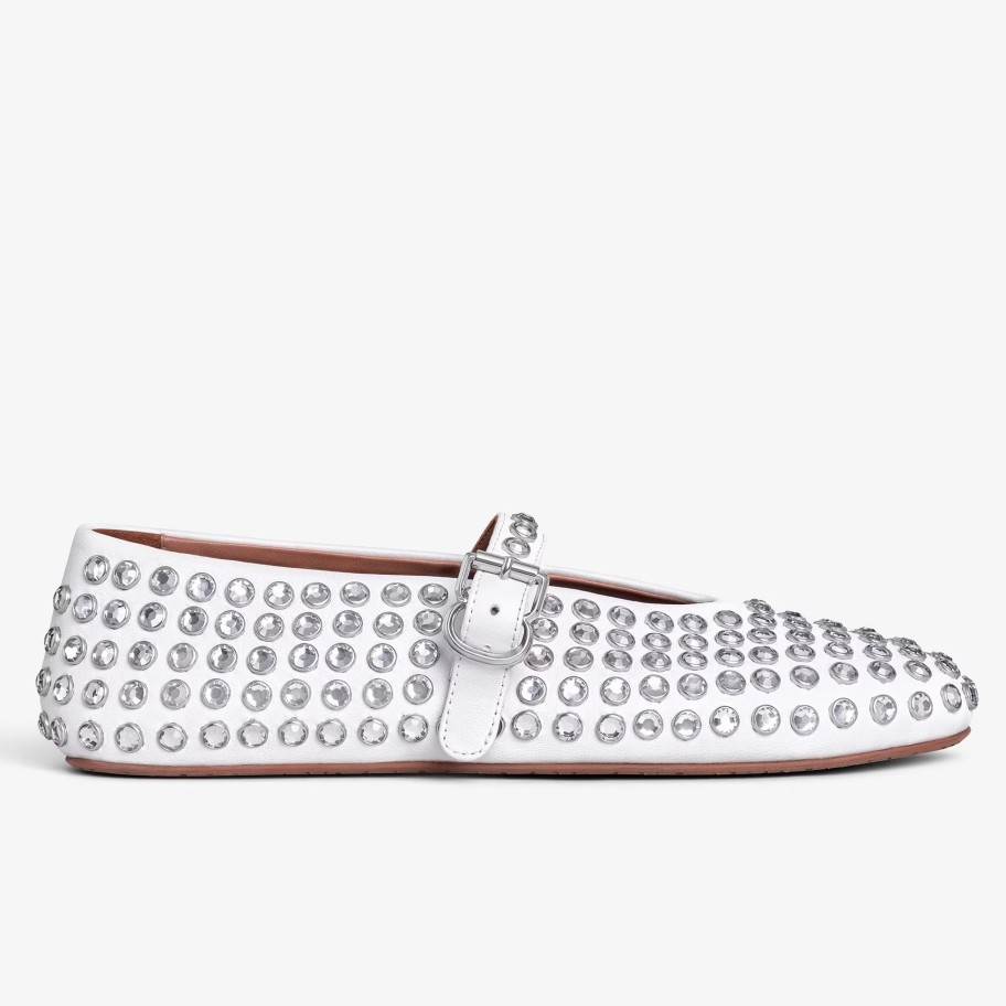 Alaïa’s ballet flats are covered in bezel-set crystals that are faceted to sparkle from every angle. They’ve been made from lambskin and have exaggerated round toes and a buckle-fastening strap to secure the arch. Keep them in focus with high hemlines.