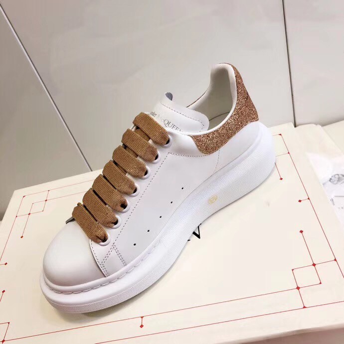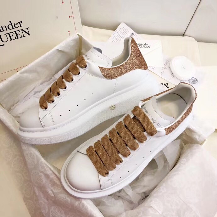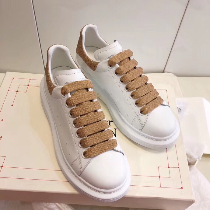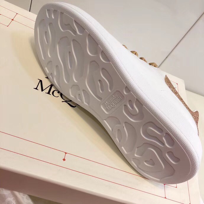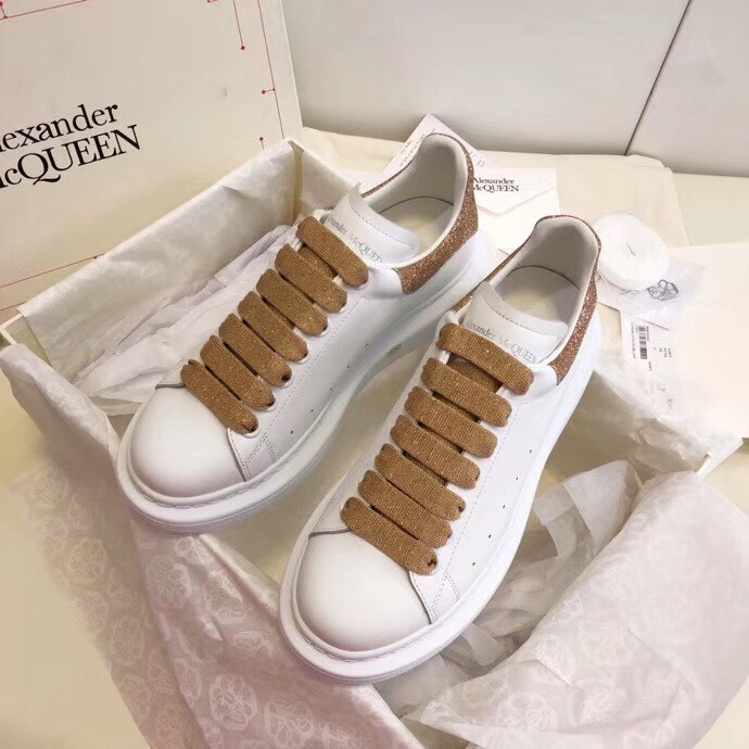 Strong fashion currency among the street style set, the signature platform sneakers from Alexander McQueen are updated with glitter-coated heel counters. Crafted from white leather, they sit on chunky rubber outsoles with built-in wedges for height and comfort – a defining feature of the cult silhouette.