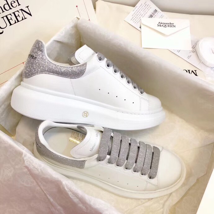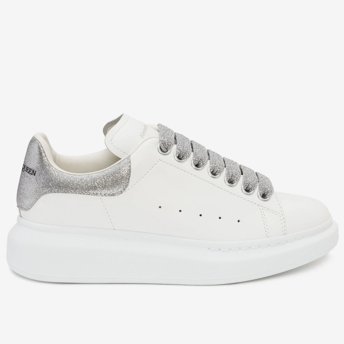 Strong fashion currency among the street style set, the signature platform sneakers from Alexander McQueen are updated with glitter-coated heel counters. Crafted from white leather, they sit on chunky rubber outsoles with built-in wedges for height and comfort – a defining feature of the cult silhouette.