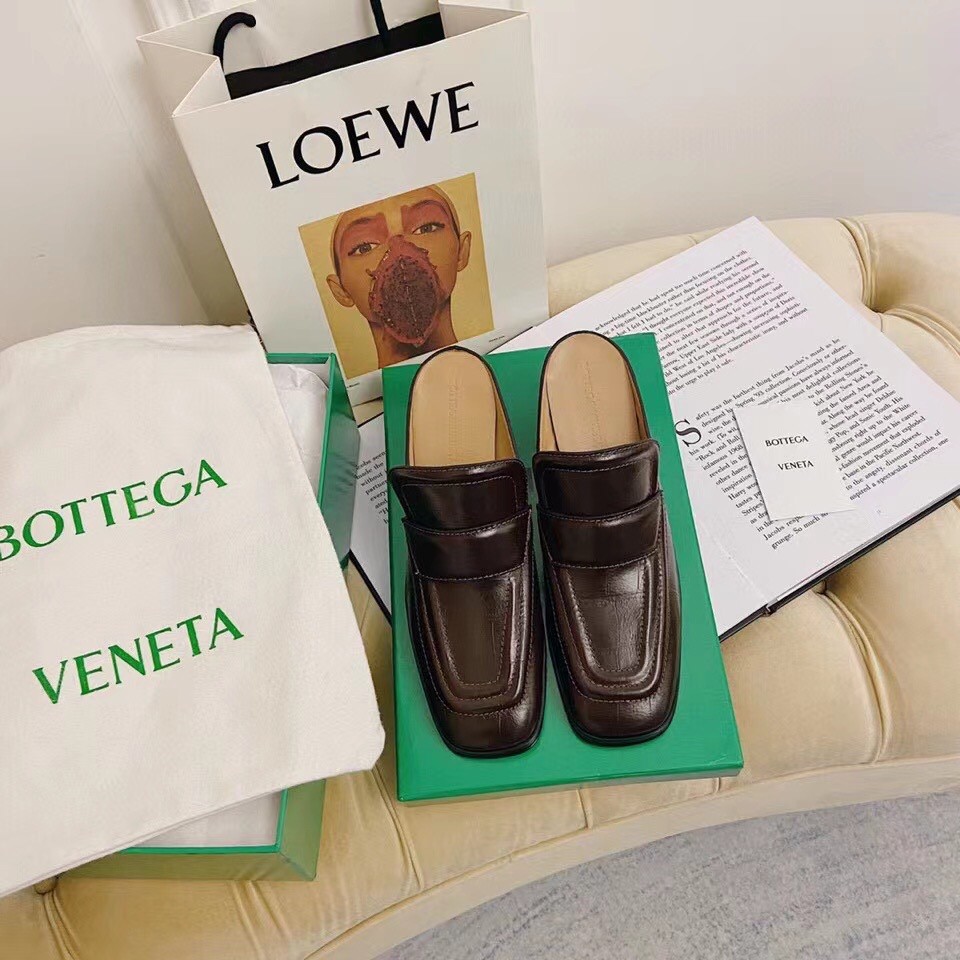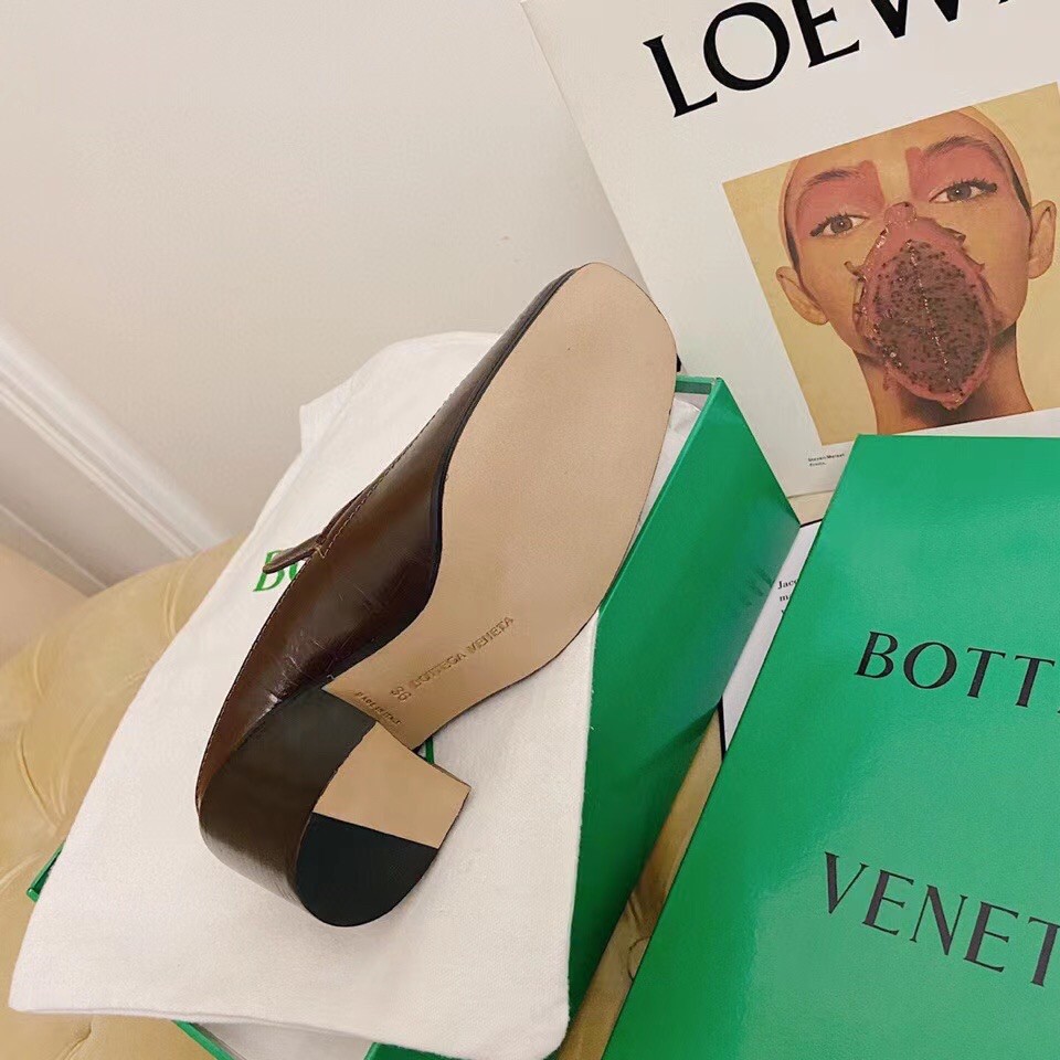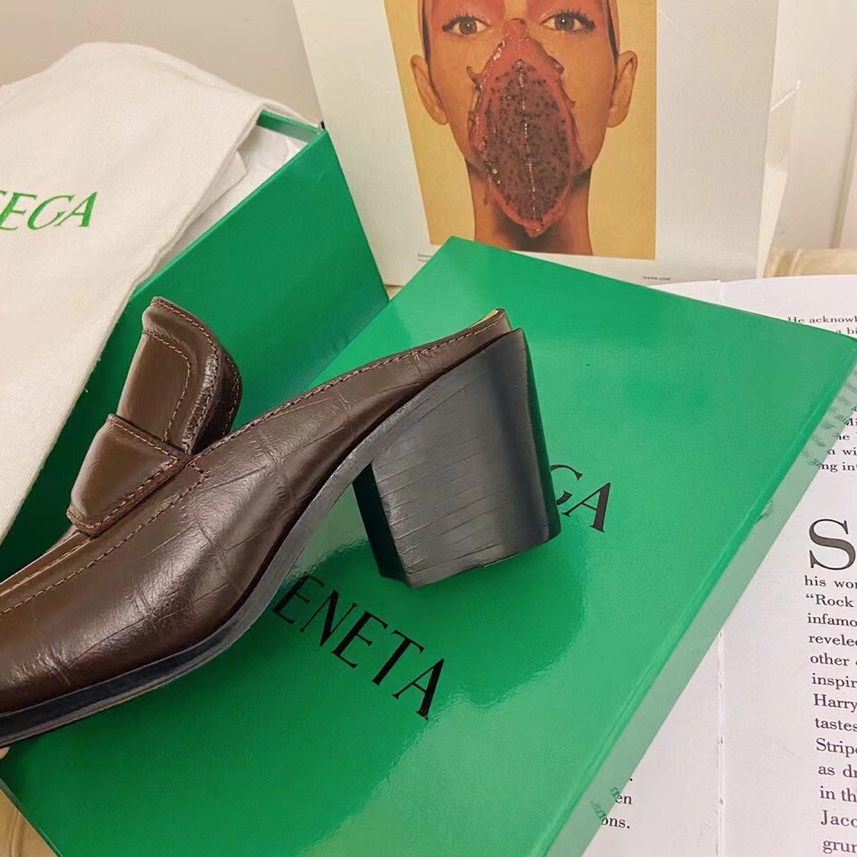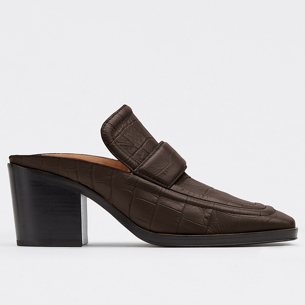 Bottega Veneta presents its take on one of the season’s key shoe silhouettes: loafer-inspired mules. In calfskin leather embossed with a crocodile effect, this pair features high vamps with raised detailing in the label’s signature triangular lines.