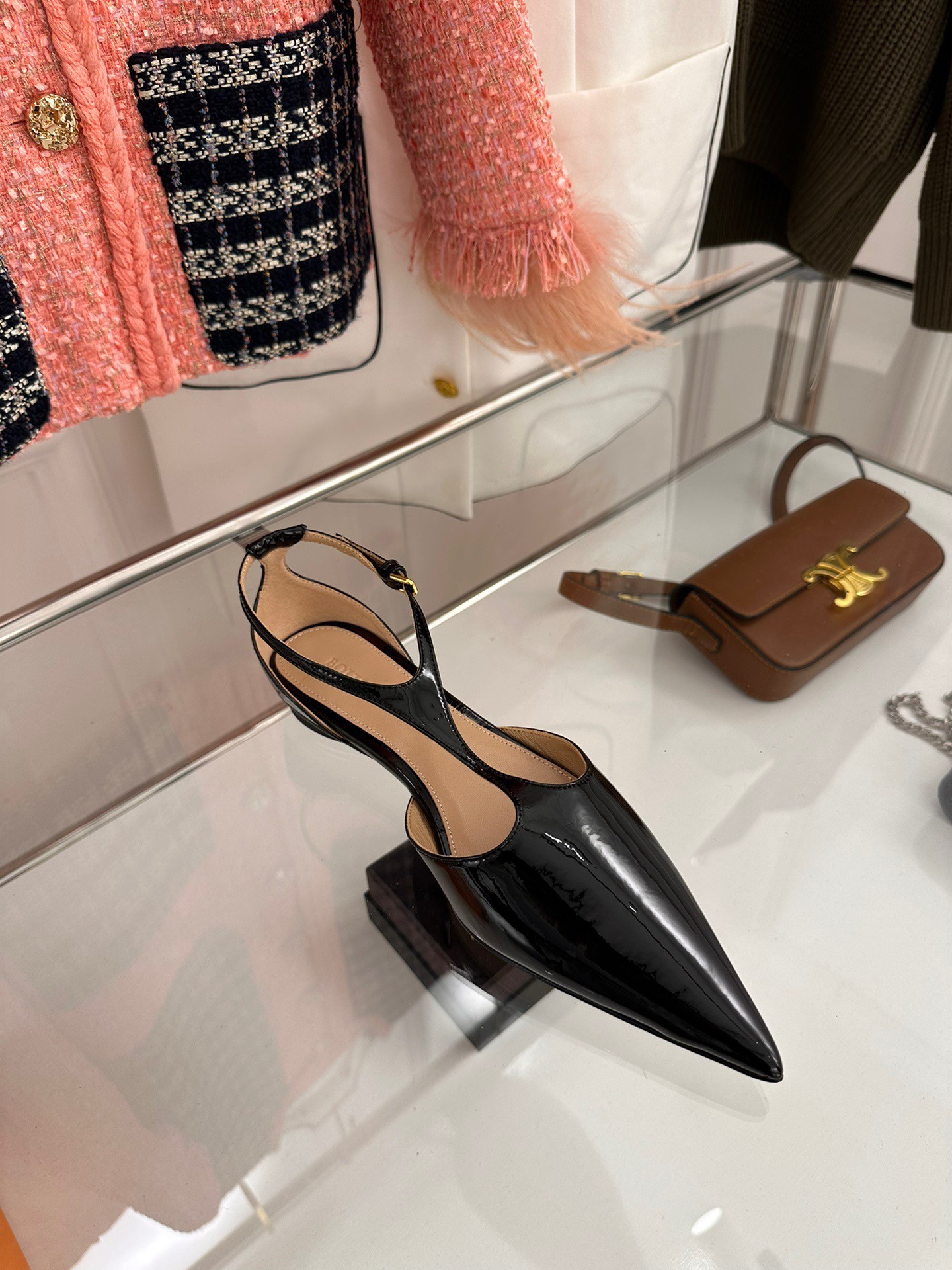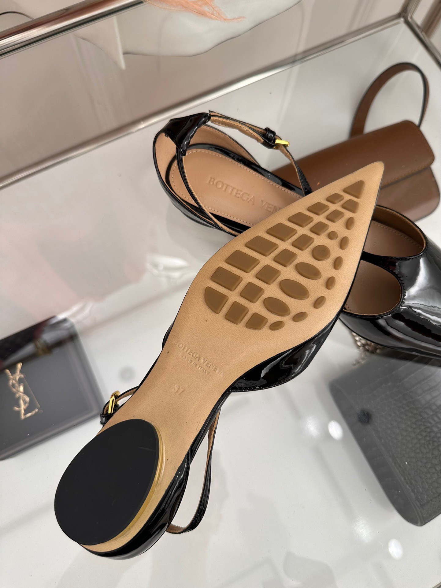 A signature shape for Bottega Veneta, these t-bar flats are laminated for additional shine. In glossy patent calfskin, they have a sleek, elongated feel and are kept in place by the strap at the back.