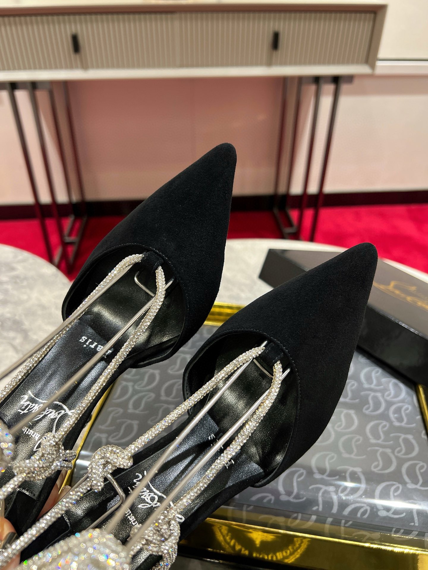 The architectural Astrid Lace Strassita pump enchants with sophisticated lines. This Maison Christian Louboutin model is crafted in black veau velours and suede calf leather. It features a pointed toe and an 85 mm heel adorned with silver strass. Long sequin laces tie around the ankle adding a hint of glamour.