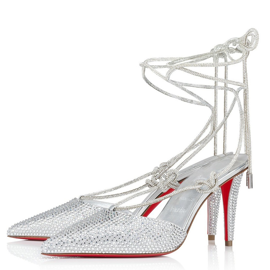 The architectural Astrid Lace Strassita pump enchants with sophisticated lines. This Maison Christian Louboutin model is crafted in mirror-effect silver suede calf leather. Its pointed toe and 85 mm heel are completely covered in silver strass. Long sequin laces tie around the ankle adding a hint of glamour.