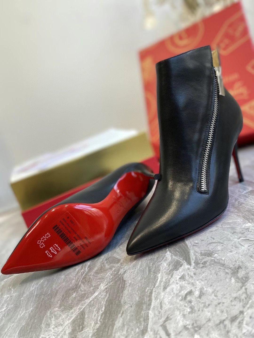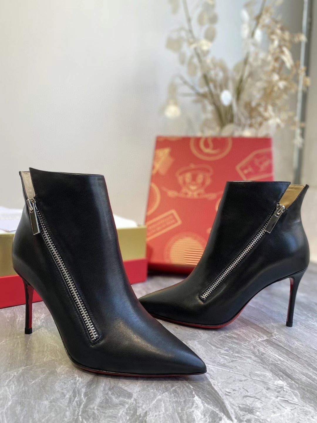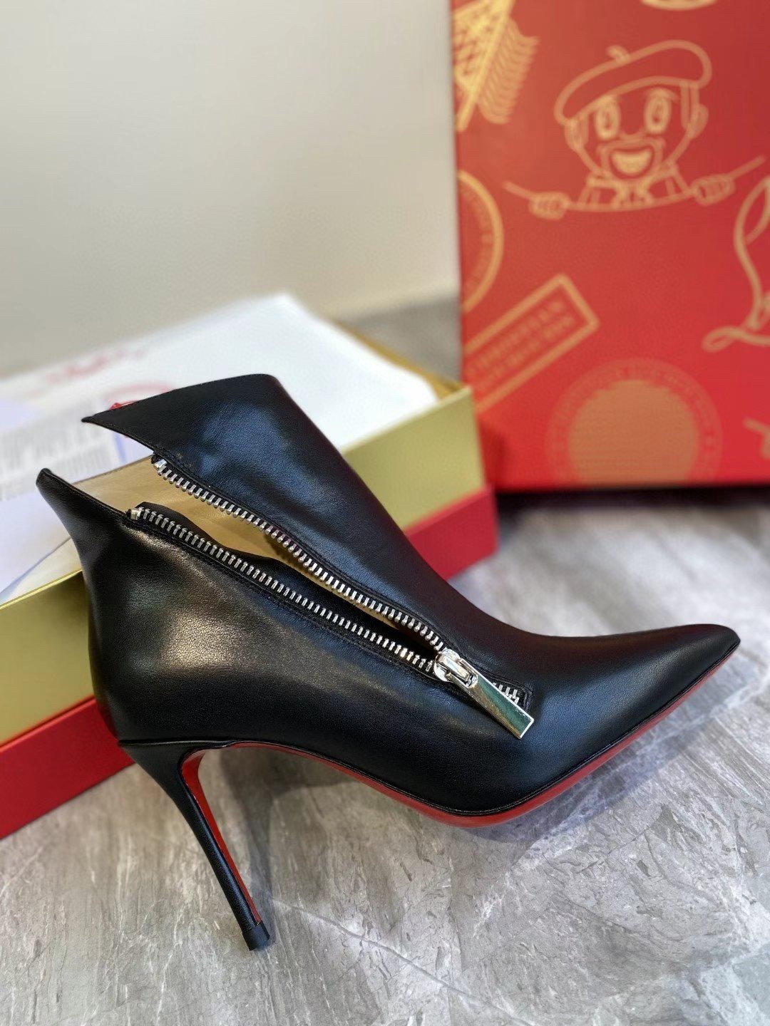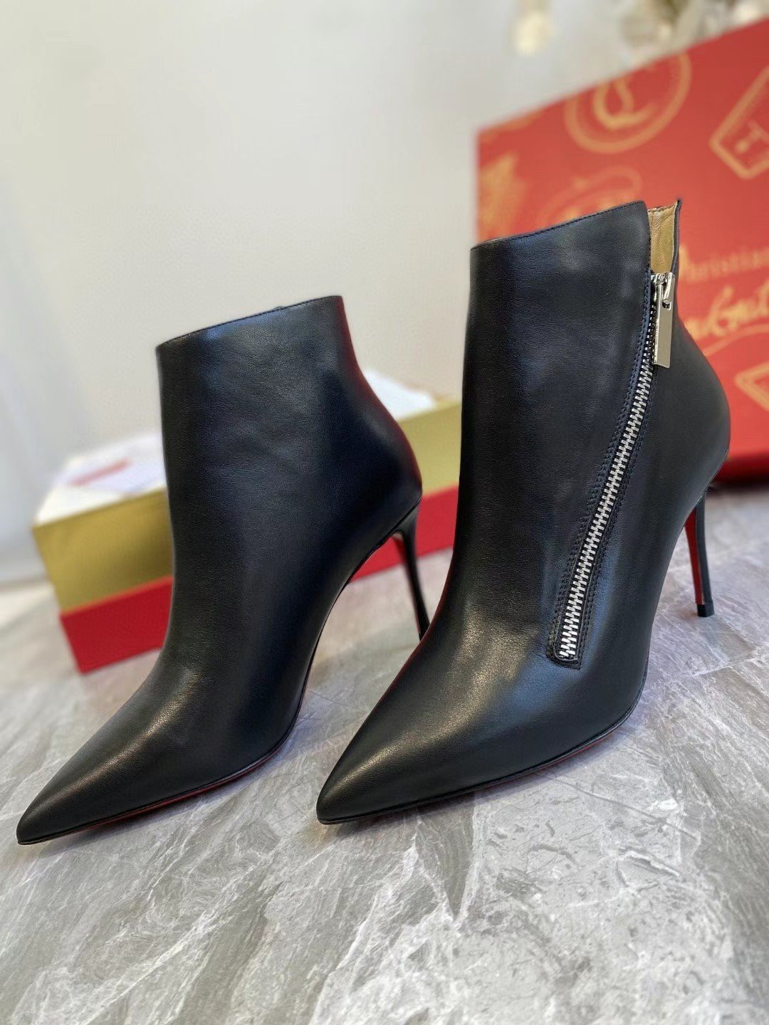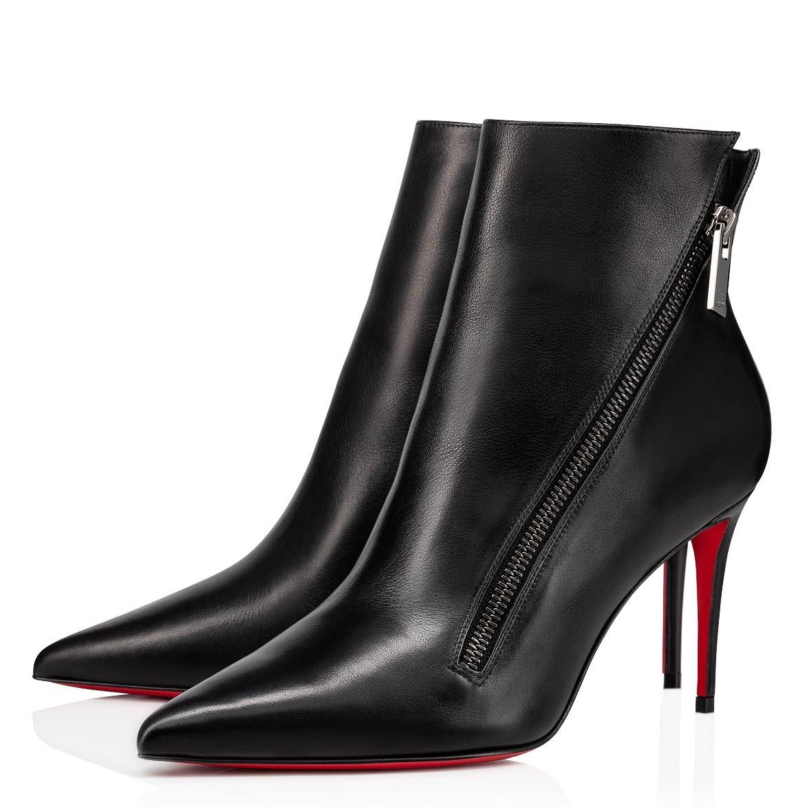The Birkigate ankle boot is embellished with a side zip that enhances its sleek and sophisticated lines. Its upper is made entirely of black calfskin, has a pointed toe and a minimalist style, all set on a slender 85 mm heel. The great elegance of this shoe is enhanced by delicate finishes that express Maison Christian Louboutin expertise.
