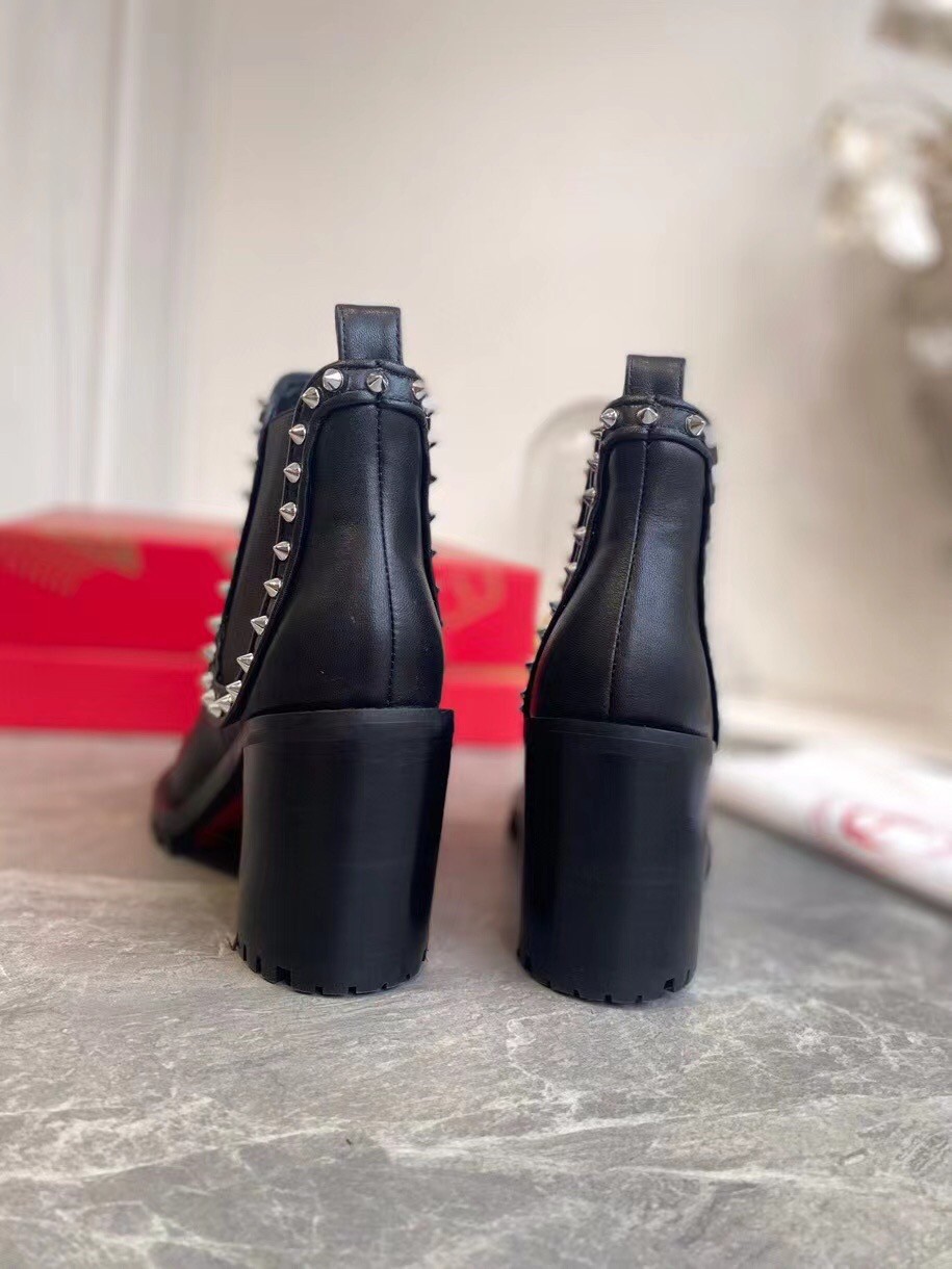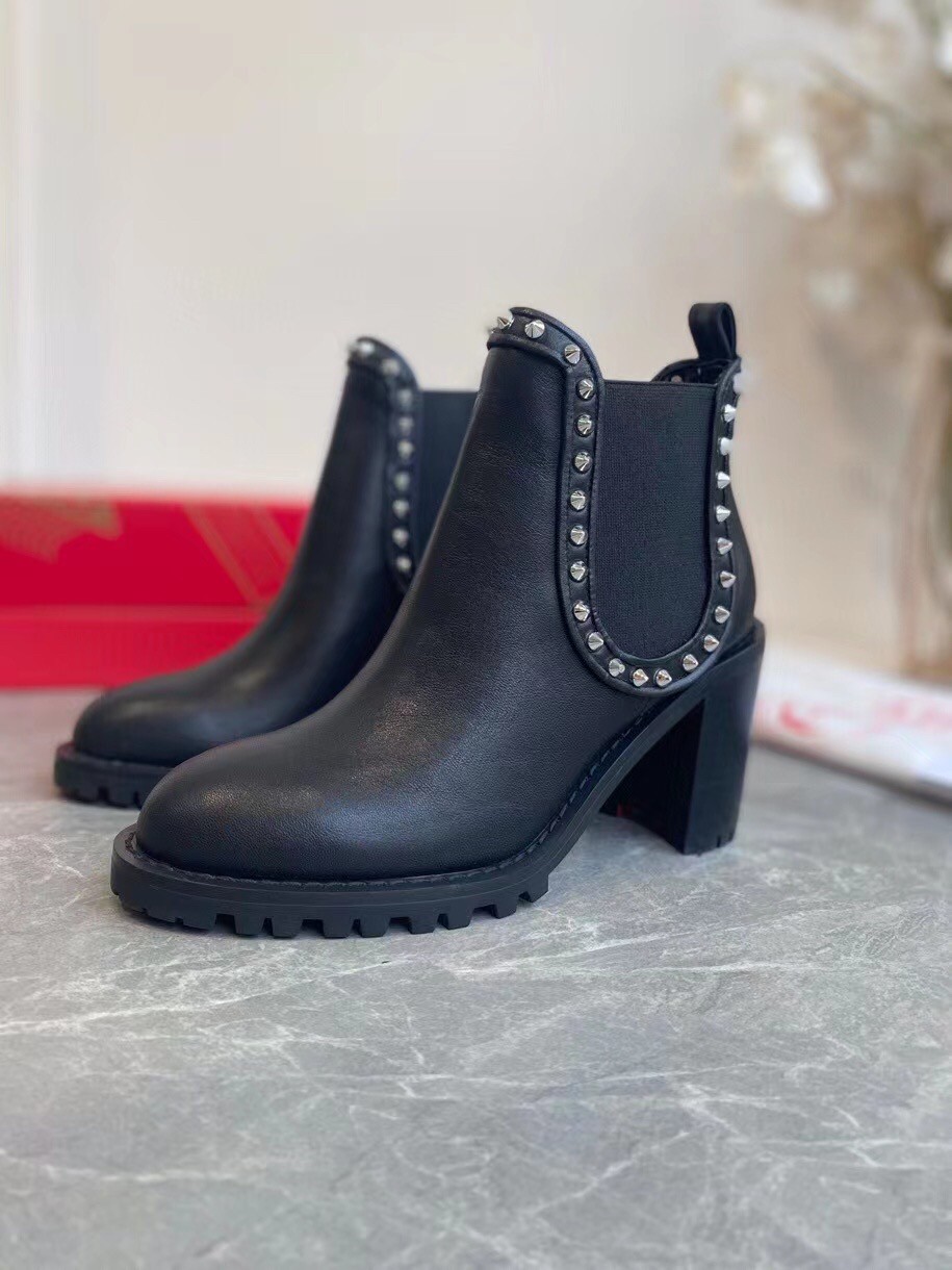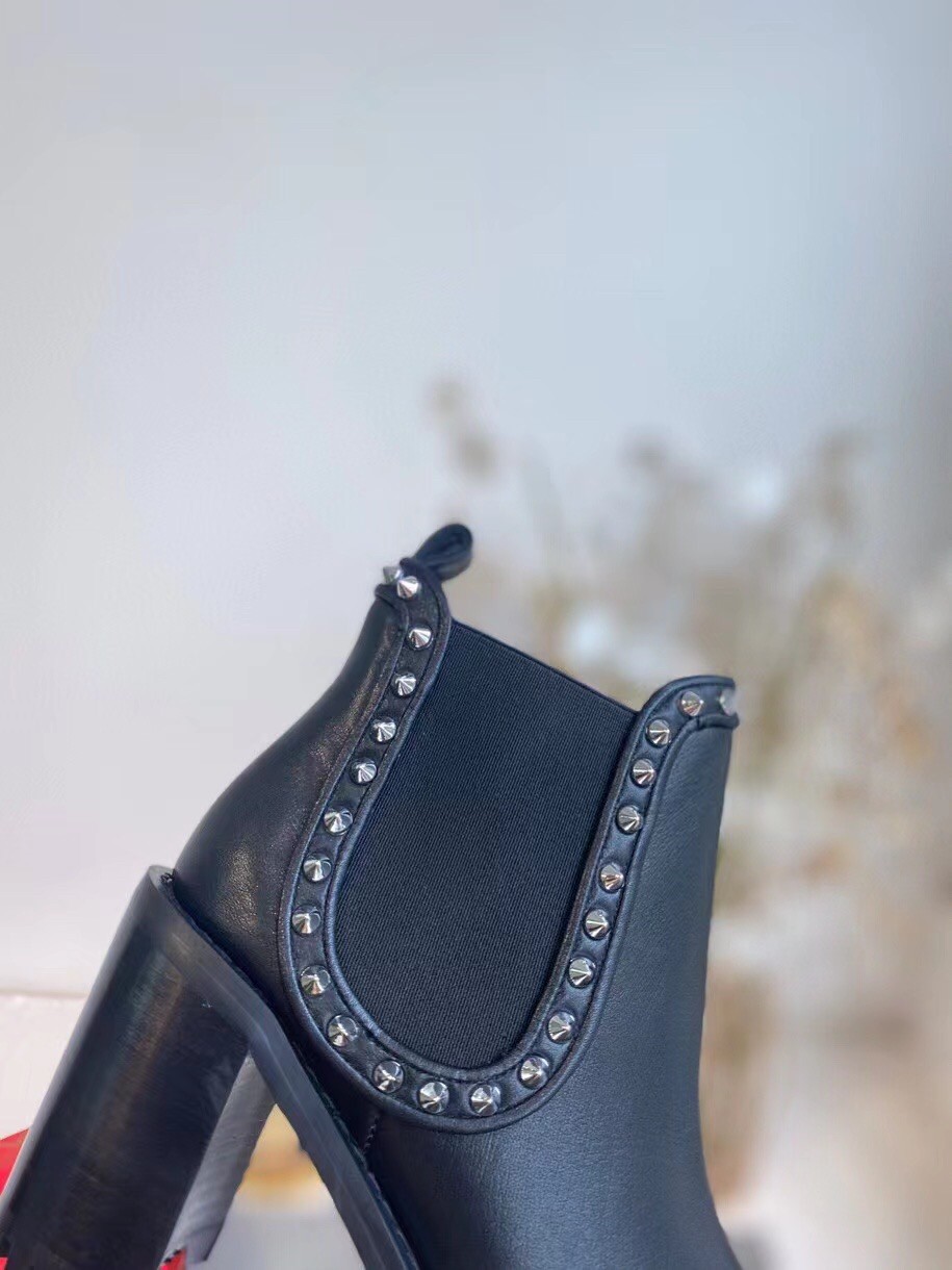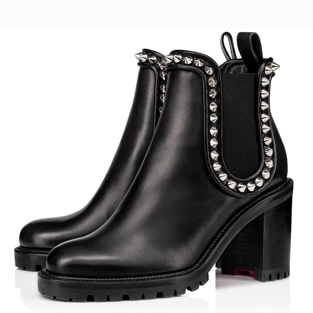 The modern and elegant Capahutta boot has seductive rounded lines. This leather boot is adorned with an elastic band on the side. It is embellished with silver Maison Christian Louboutin signature spikes to add a bold note. This shoe sits on a 70 mm heel and has a tone-on-tone grosgrain border around the sole.
