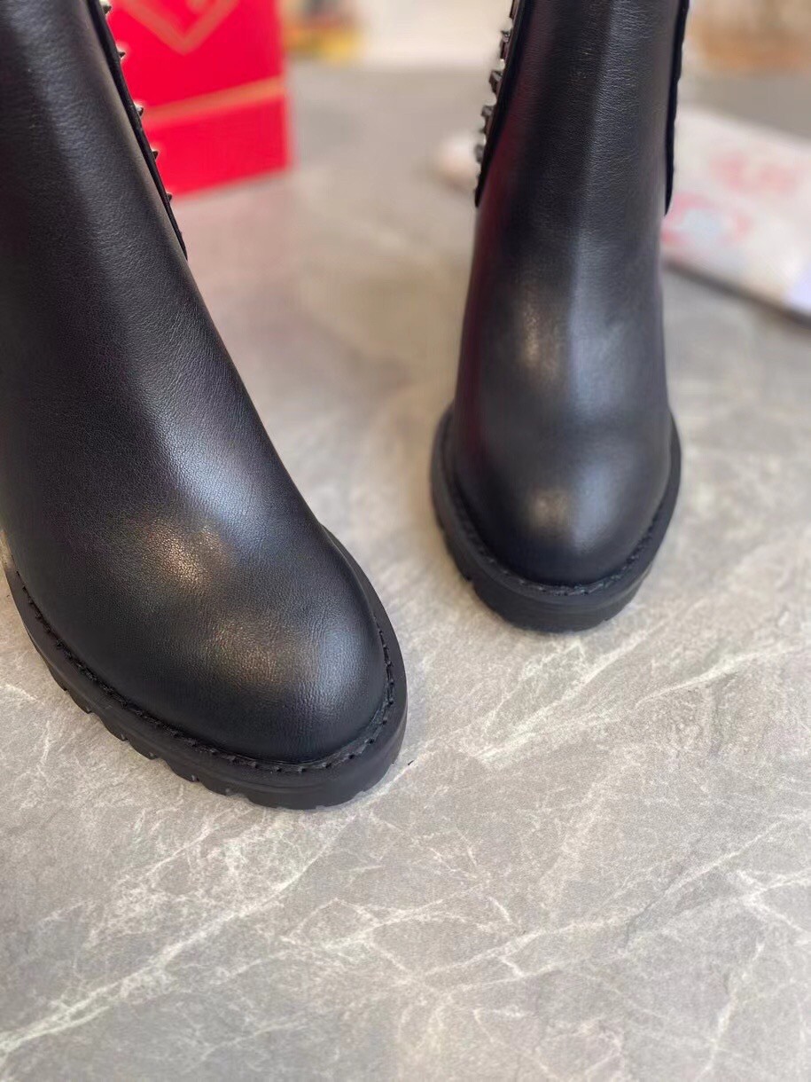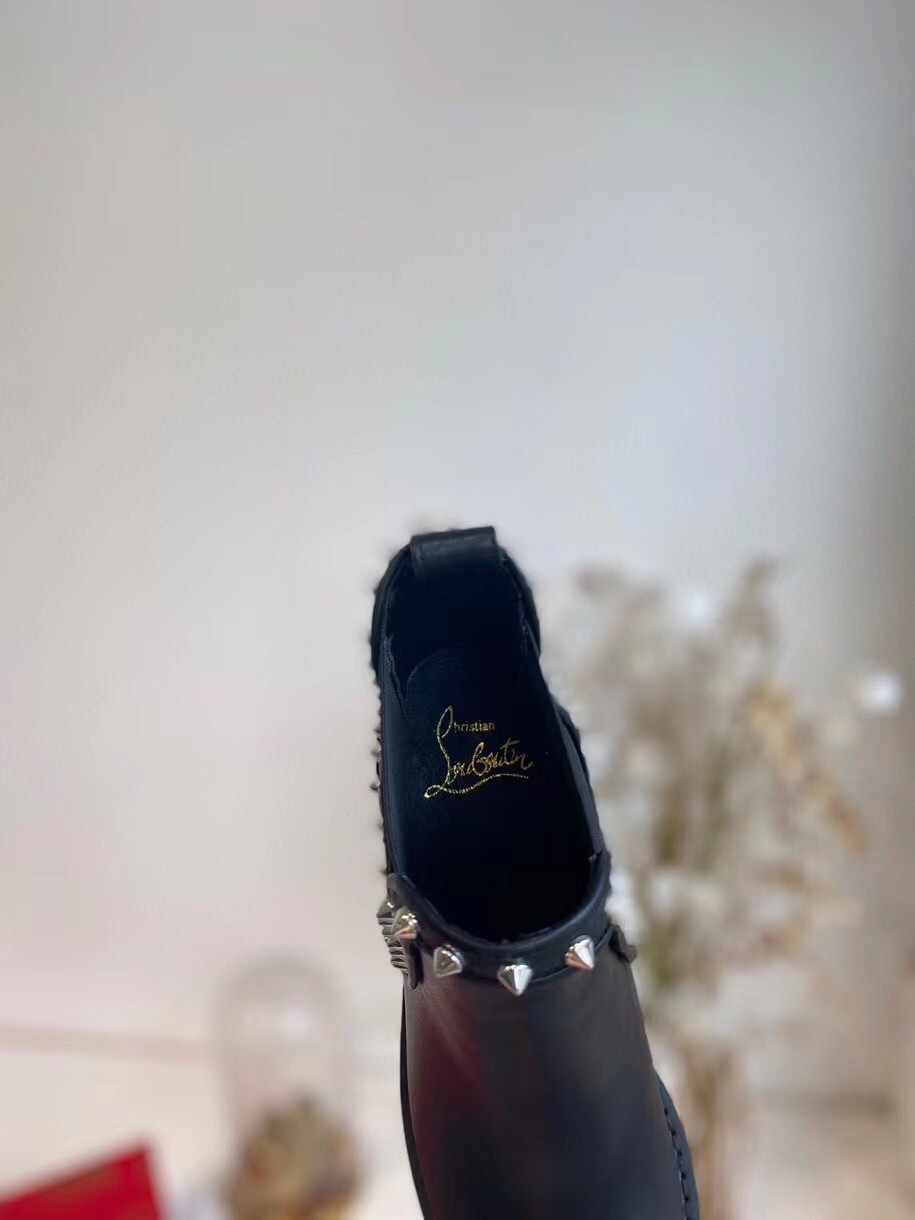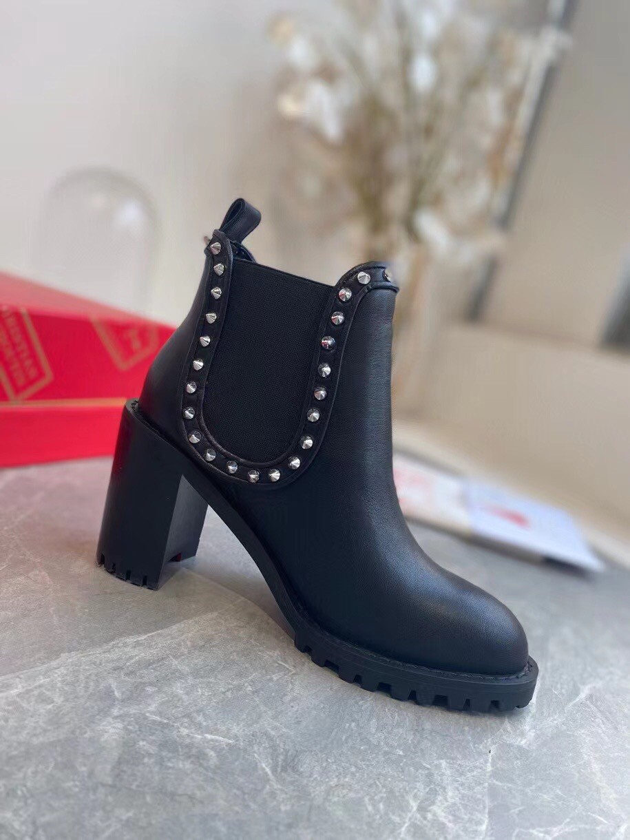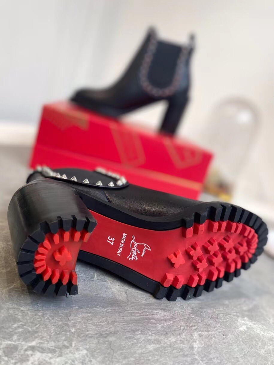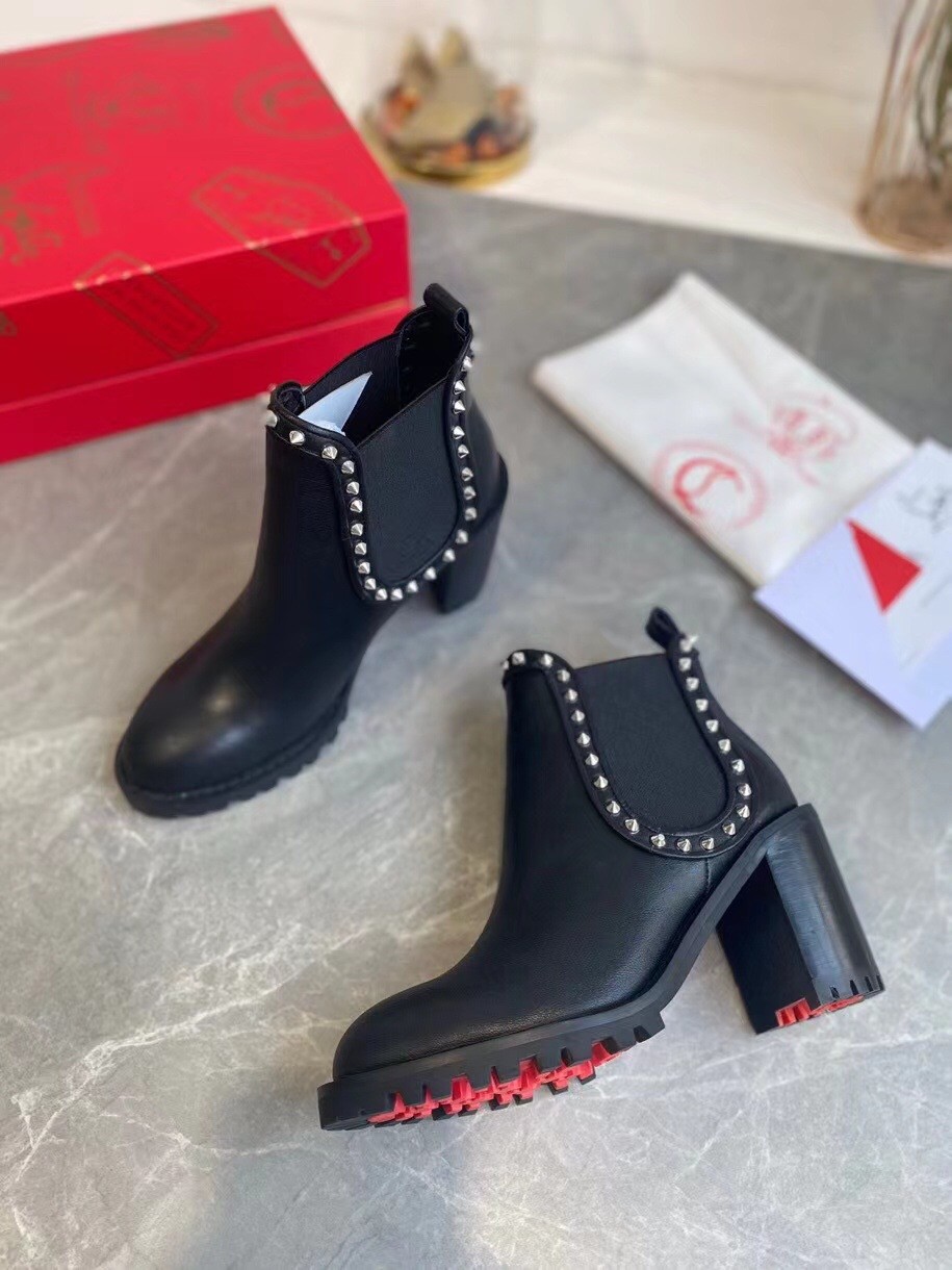 The modern and elegant Capahutta boot has seductive rounded lines. This leather boot is adorned with an elastic band on the side. It is embellished with silver Maison Christian Louboutin signature spikes to add a bold note. This shoe sits on a 70 mm heel and has a tone-on-tone grosgrain border around the sole.