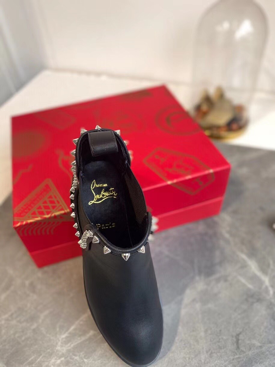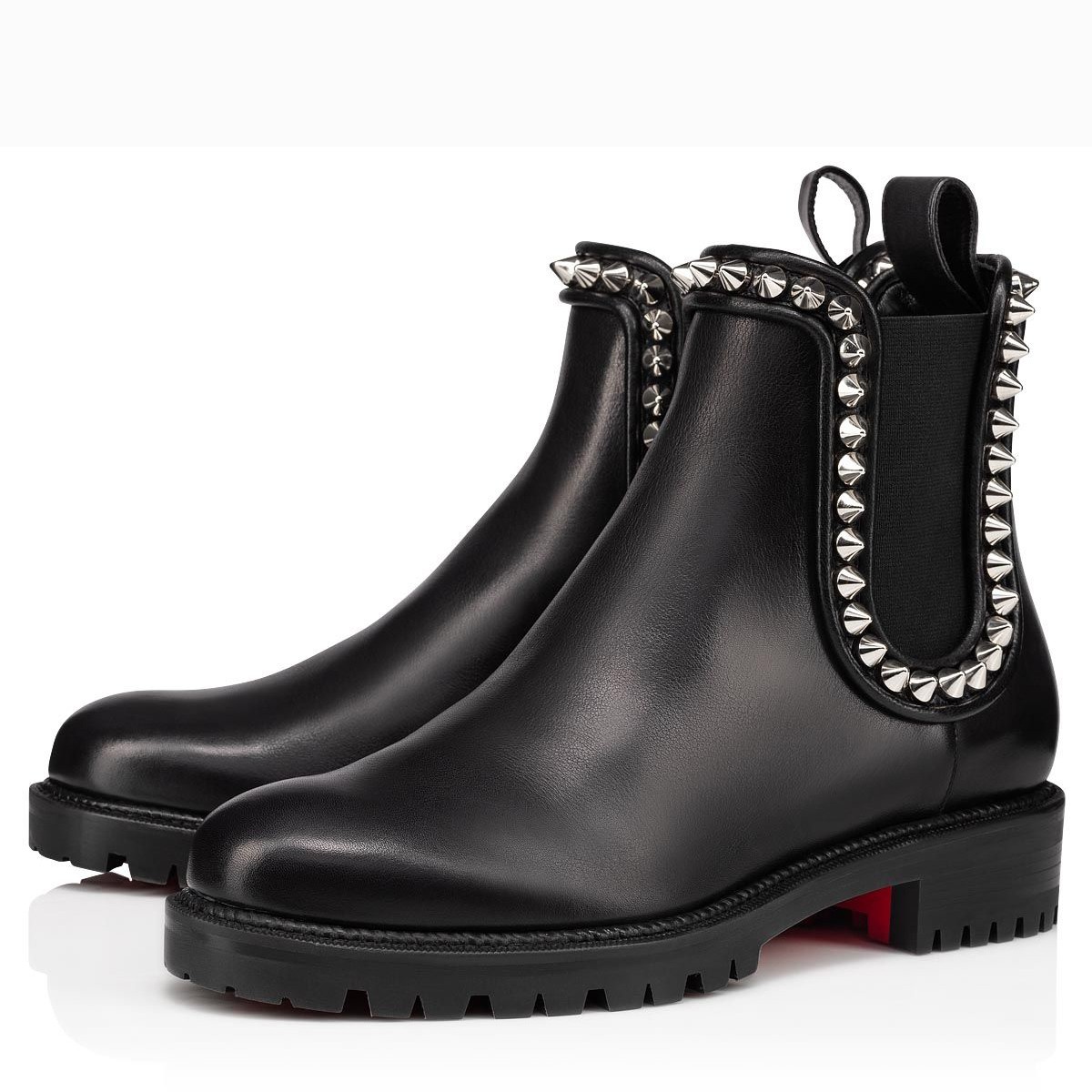 The modern and elegant Capahutta boot has seductive rounded lines. This leather boot is adorned with an elastic band on the side. It is embellished with silver Maison Christian Louboutin signature spikes to add a bold note. This city shoe has a tone-on-tone grosgrain border around its notched sole.