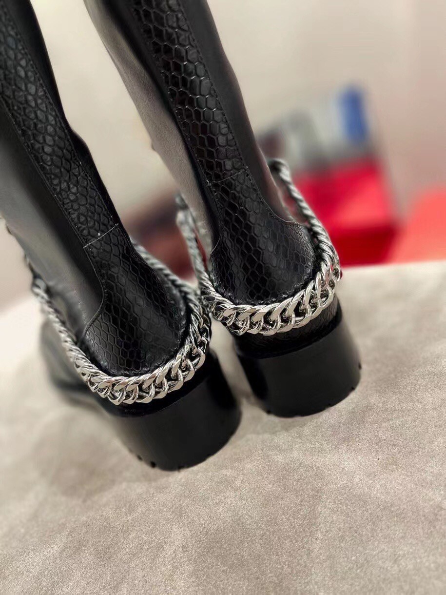 The Maison Christian Louboutin Horse Guarda boot is inspired by the military world, and catches the eye with its refined elements which give it a daring charm. This calfskin model has a matt and shiny Jurassic finish at the front and the quarters. The back is embellished with a silver chain that matches the hooks that hold the elastic fastening the boot.