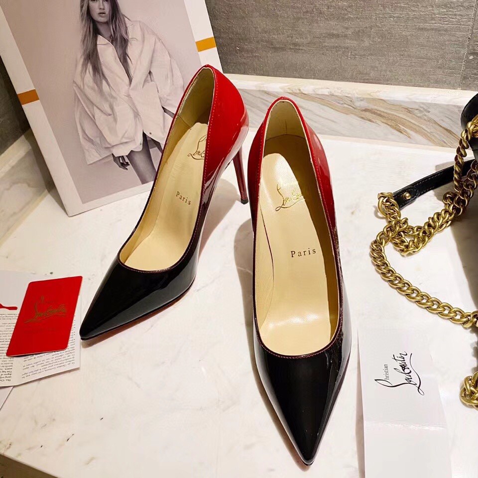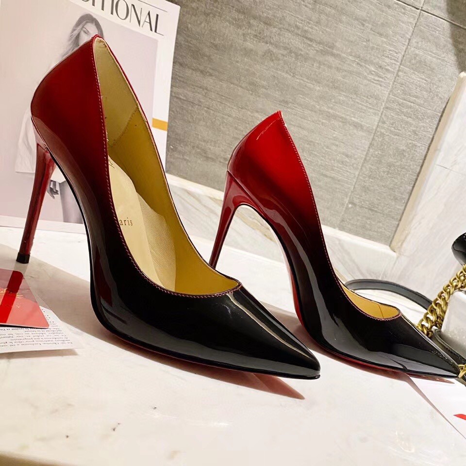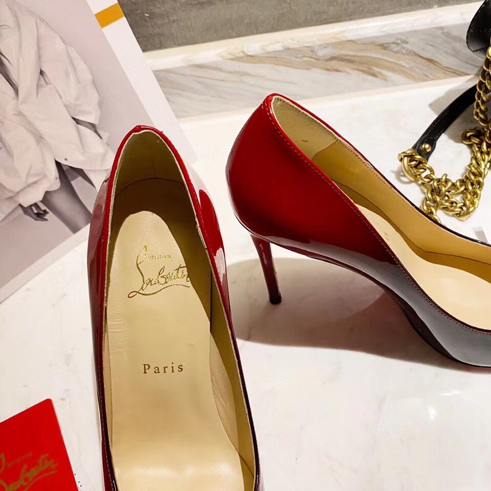 An iconic model, the Kate pump is cloaked in patent leather in the legendary black-to-red color gradient, highlighting its elegant curves. Mounted on a 100mm heel, it raises the slender silhouette with accuracy, revealing with each step the savoir-faire of the Maison Christian Louboutin.