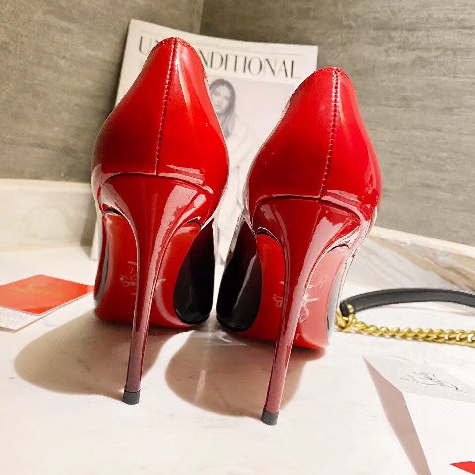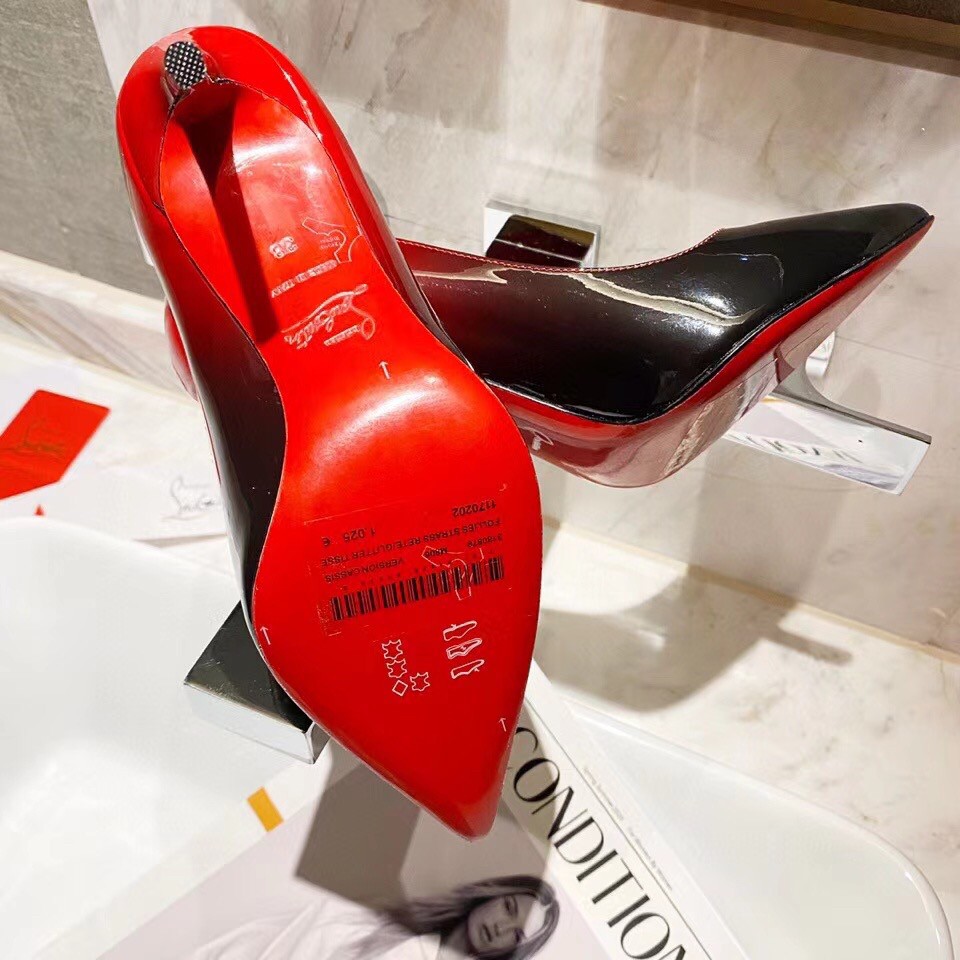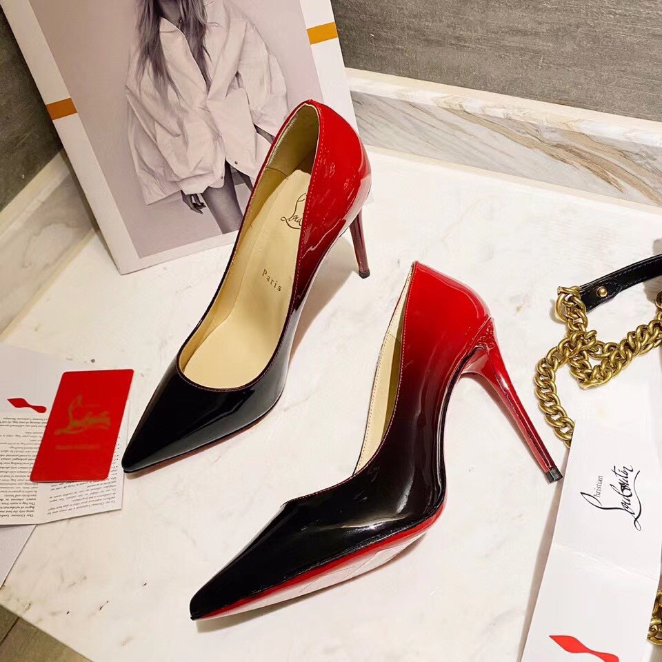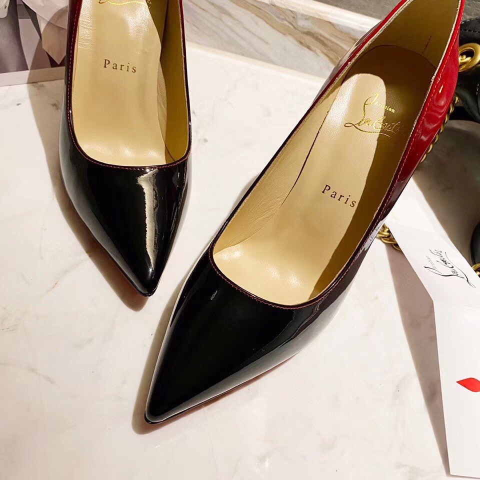 An iconic model, the Kate pump is cloaked in patent leather in the legendary black-to-red color gradient, highlighting its elegant curves. Mounted on a 100mm heel, it raises the slender silhouette with accuracy, revealing with each step the savoir-faire of the Maison Christian Louboutin.