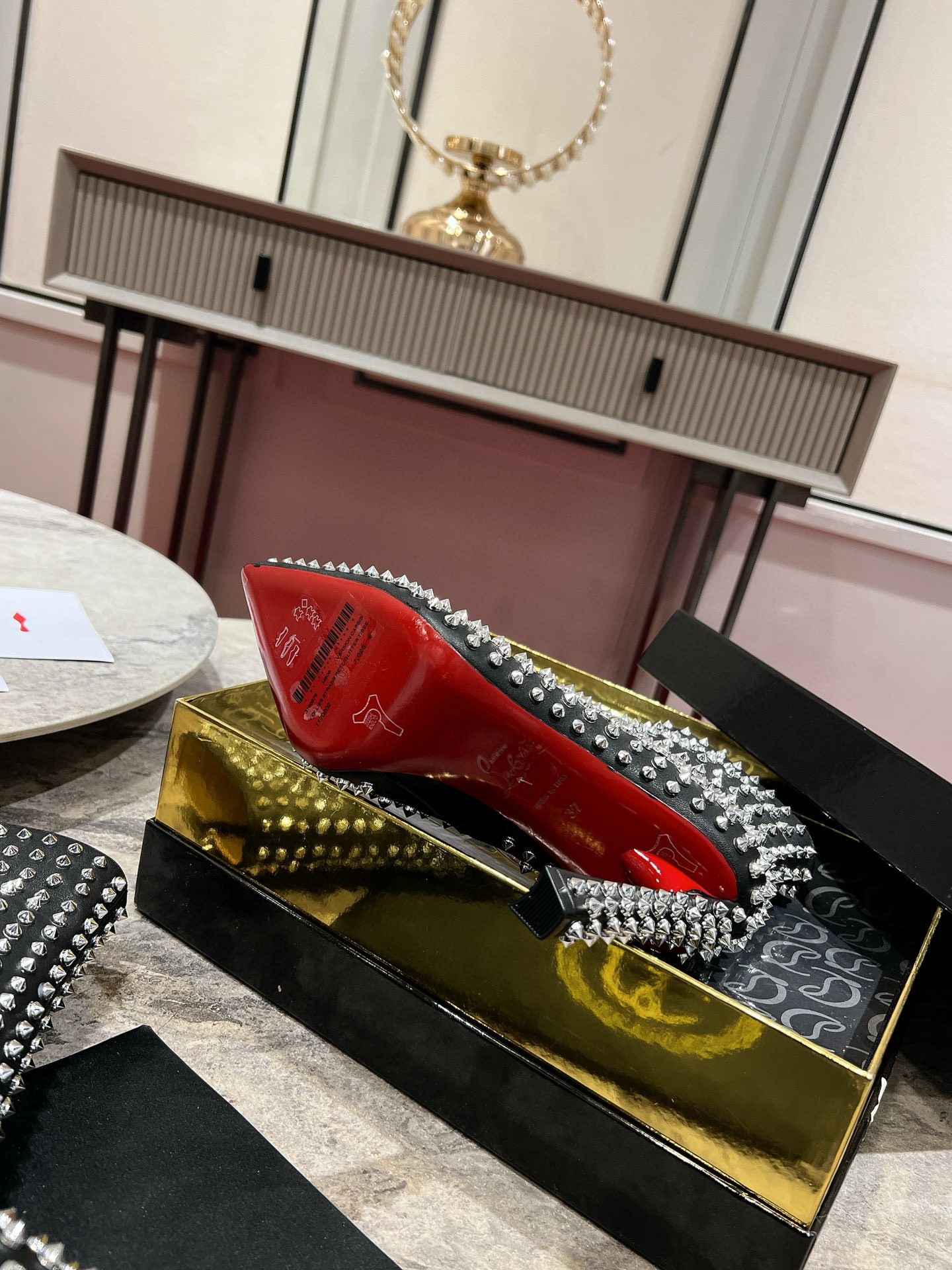 The Condora Booty has a pointed toe like a bird’s beak. This sophisticated boot in black leather comes high on the ankle. It features a 100 mm angled heel and is adorned with Maison Christian Louboutin’s signature spikes.