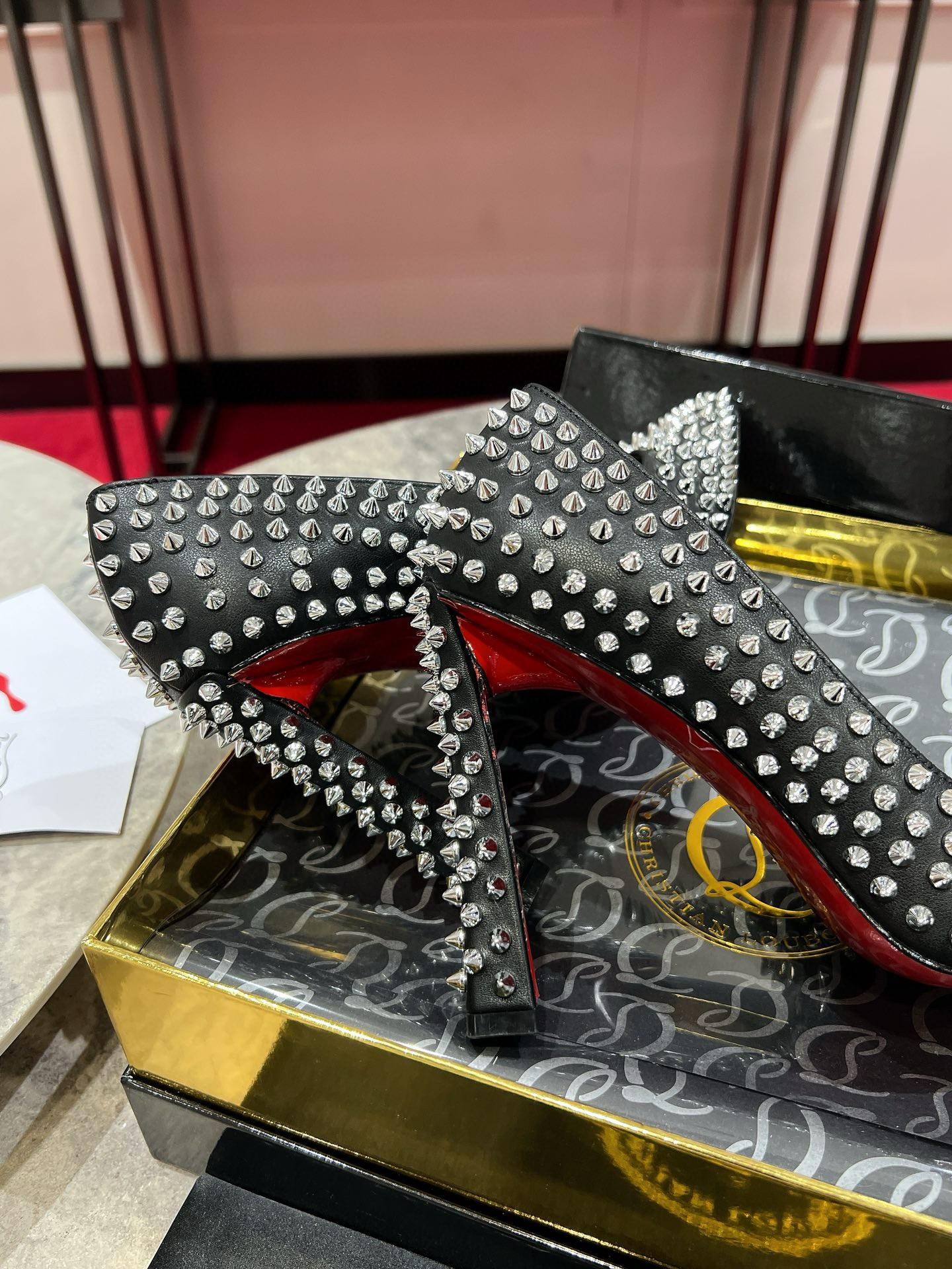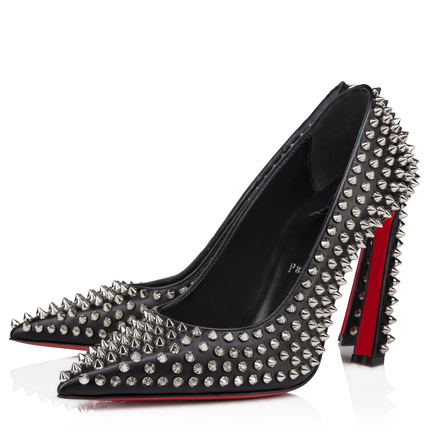 The Condora Spikes pump has a pointed toe like a bird’s beak. This sophisticated style in black nappa leather has a daring low-cut vamp revealing the foot. It has an 100 mm slanted heel and signature metal spikes showcasing Maison Christian Louboutin’s innovative creativity.