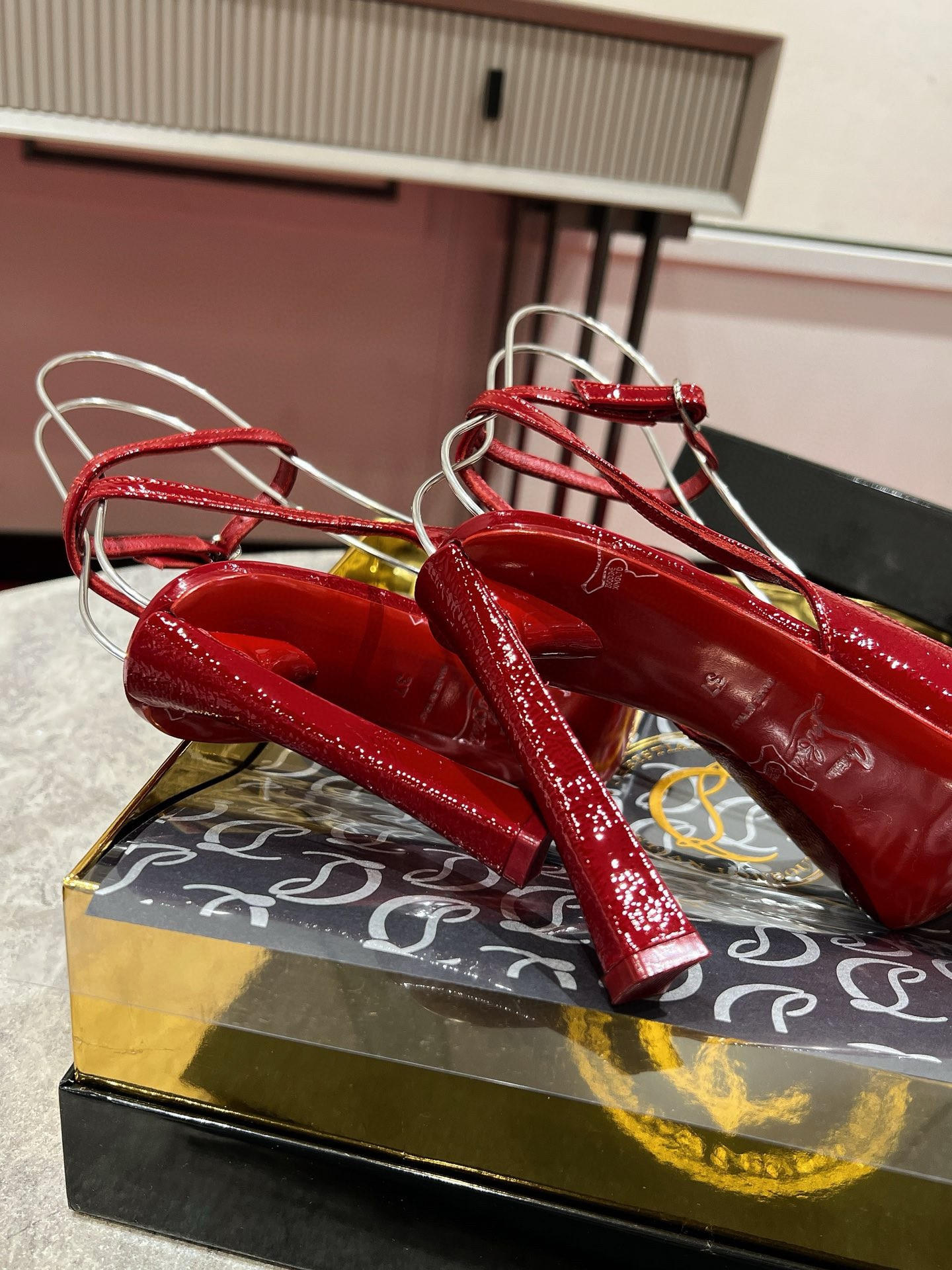 The Condora Strap pump has a pointed toe reminiscent of a bird’s beak. This sophisticated style in Loubi red patent calf leather features an audacious vamp revealing the foot. It is distinguished by a 100 mm bevelled heel, showcasing Maison Christian Louboutin’s innovative creativity. The delicate, slender ankle strap evokes elegance. The “Vog patent leather” material, being more flexible, offers better suppleness. Its wrinkled effect may have slight variations between the photo and the product.
