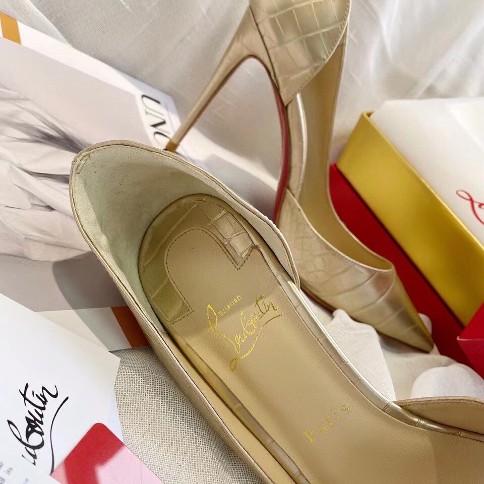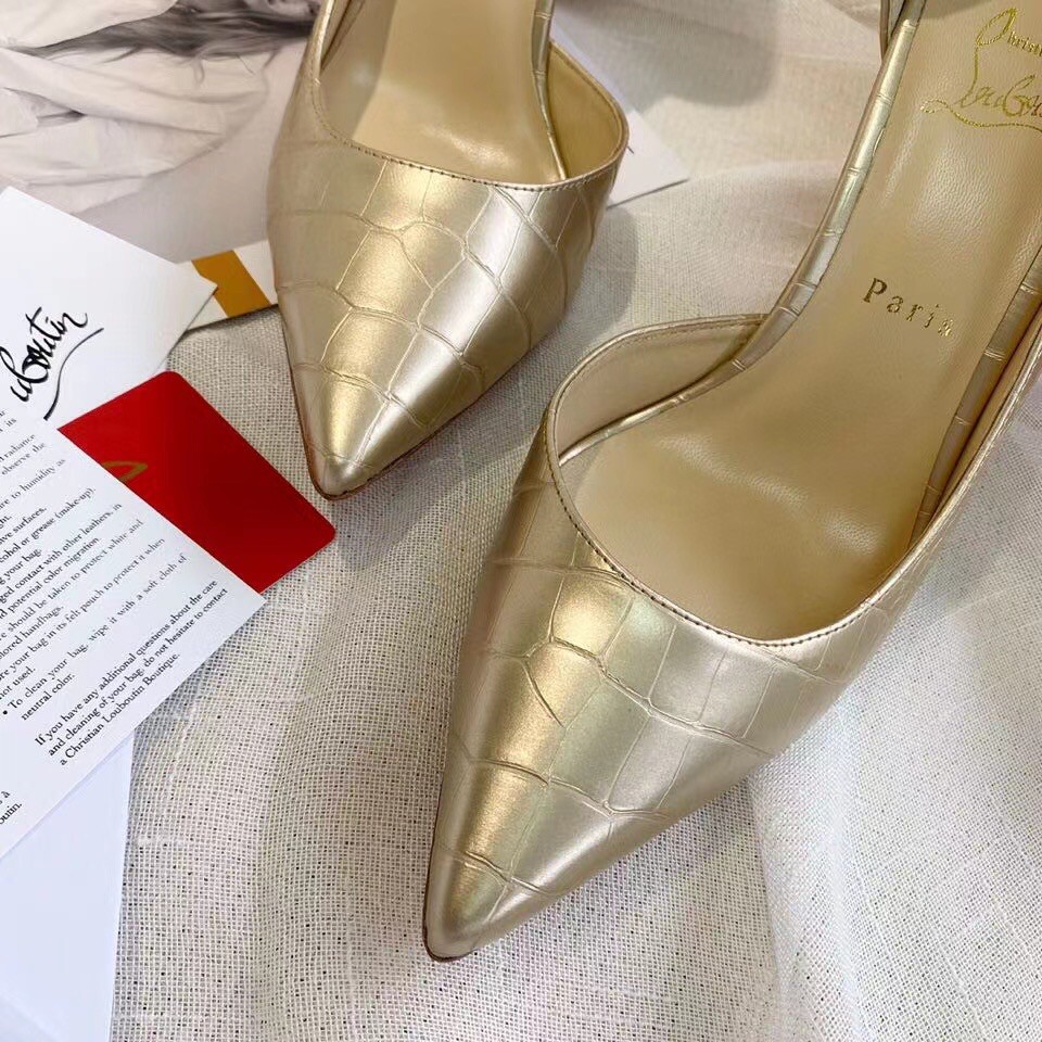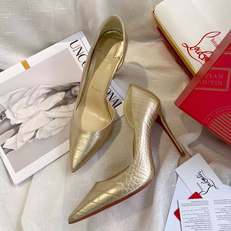 The Iriza is a classic court shoe with a twist. It features a demi d’Orsay pump construction, which offers a revealing glimpse of the foot along the inner section of the shoe. This season, the Iriza has been reworked in silver-tone Cocco Metallo Platine crocodile-print embossed leather from the Loubi Uni collection, inspired by sophistication, Oxford and Cambridge. The statuesque yet wearable 100 mm wrapped stiletto heel continues this preppy theme.