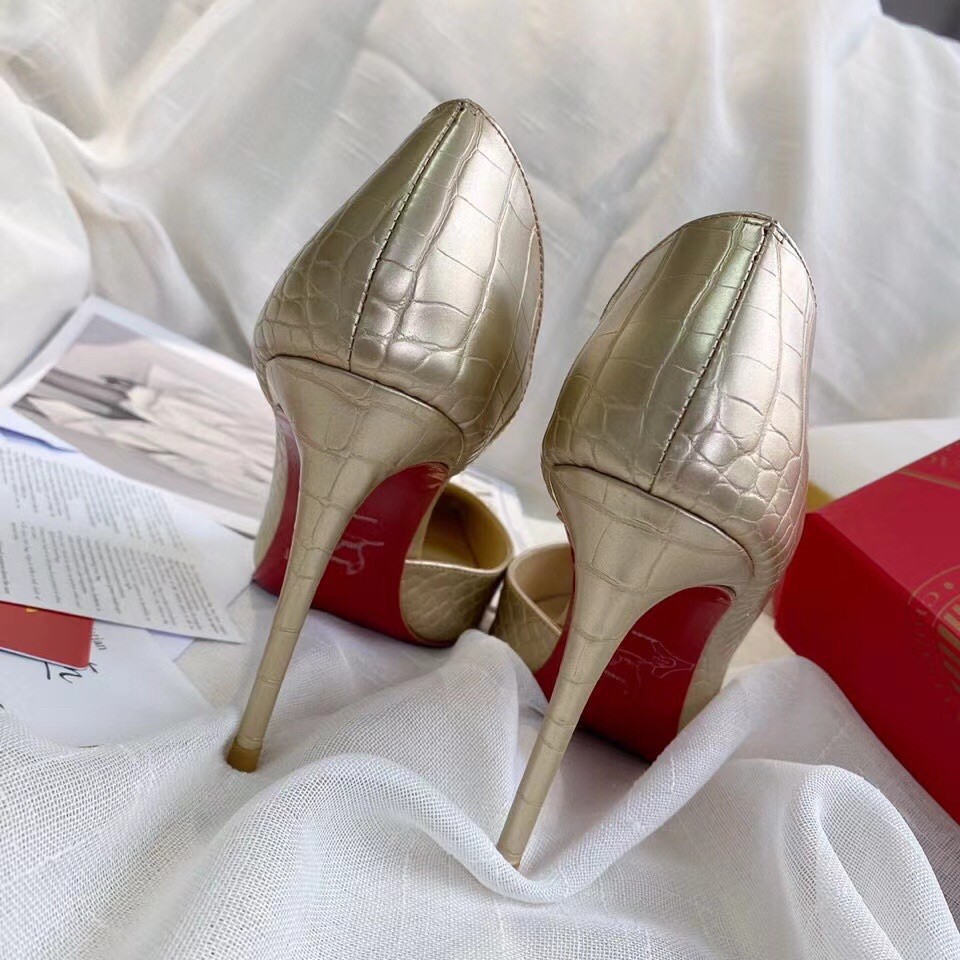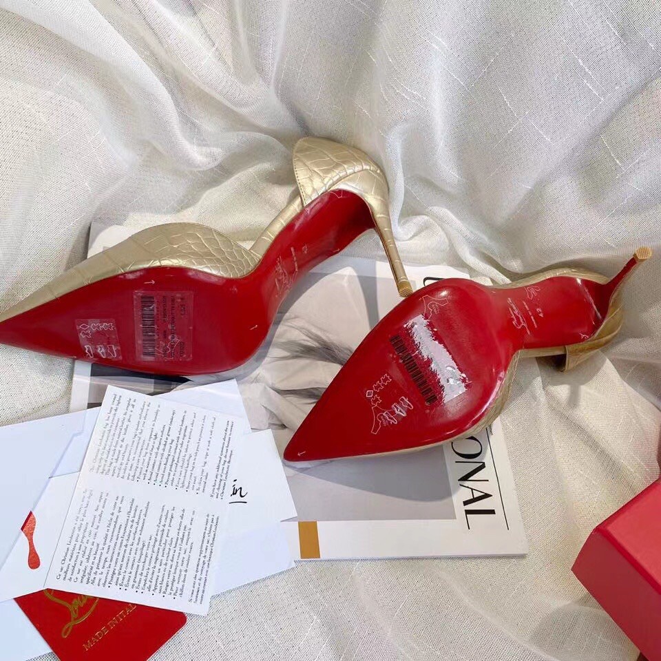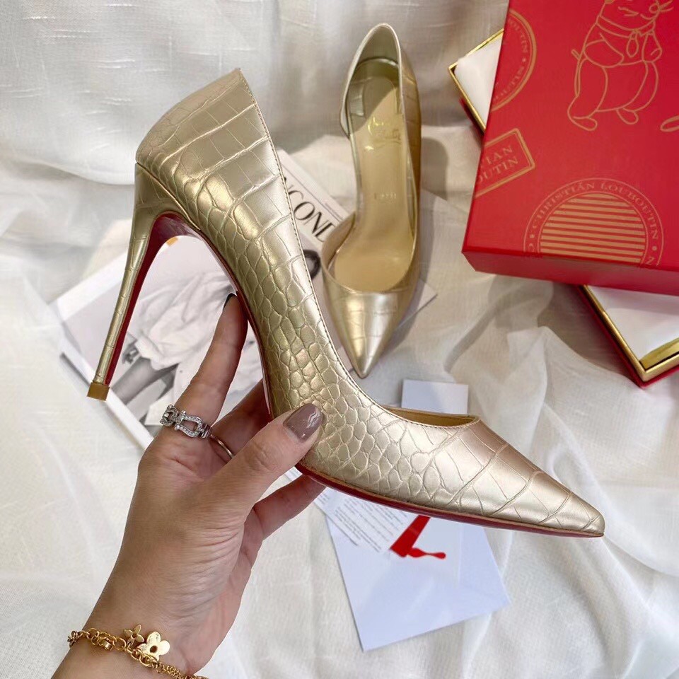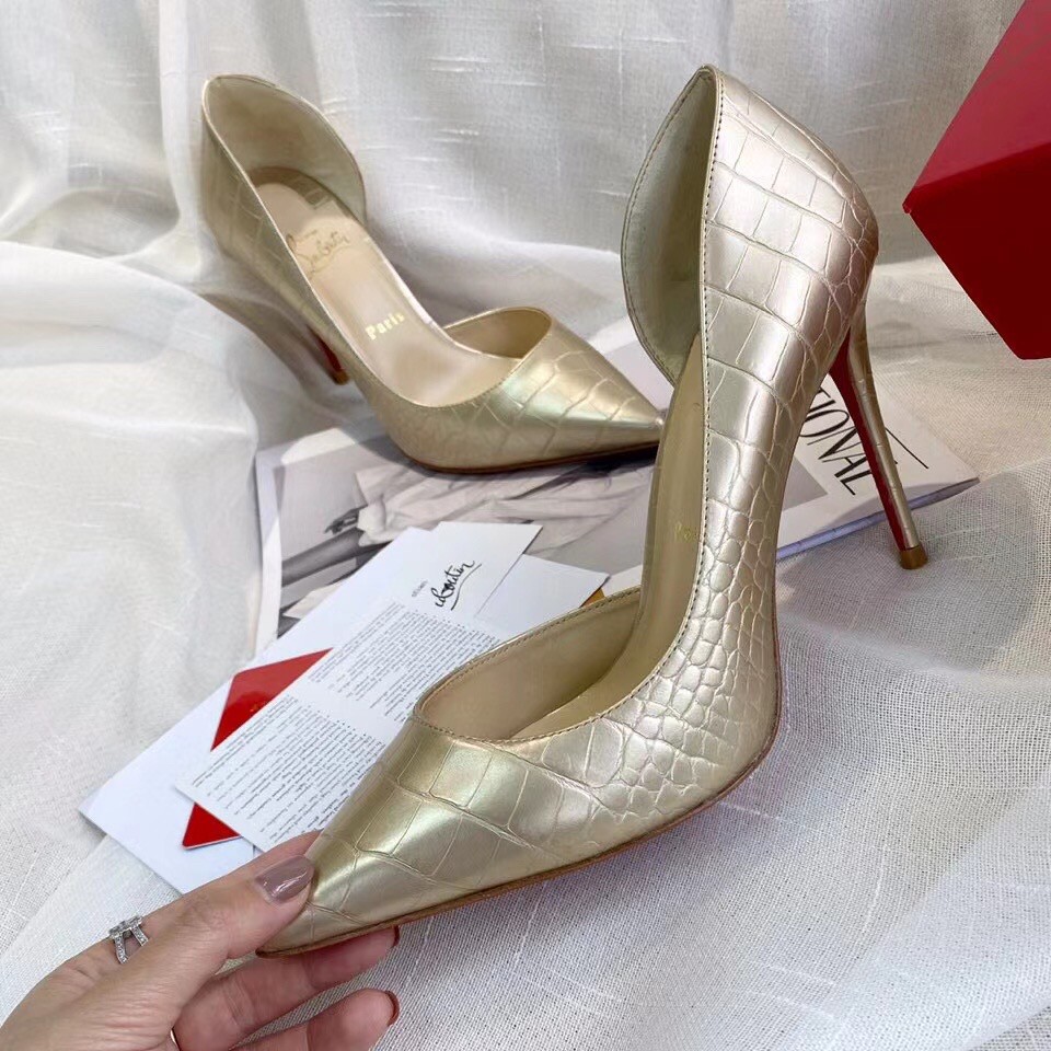 The Iriza is a classic court shoe with a twist. It features a demi d’Orsay pump construction, which offers a revealing glimpse of the foot along the inner section of the shoe. This season, the Iriza has been reworked in silver-tone Cocco Metallo Platine crocodile-print embossed leather from the Loubi Uni collection, inspired by sophistication, Oxford and Cambridge. The statuesque yet wearable 100 mm wrapped stiletto heel continues this preppy theme.