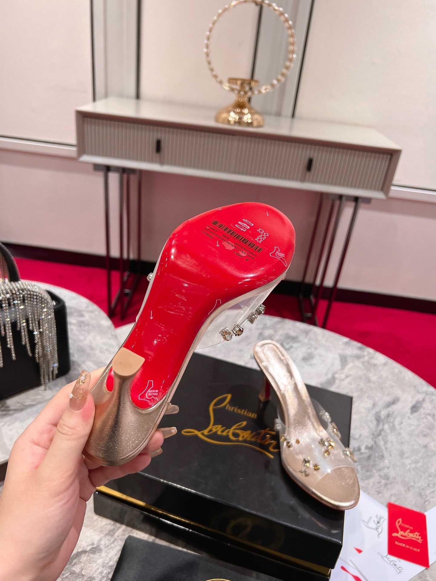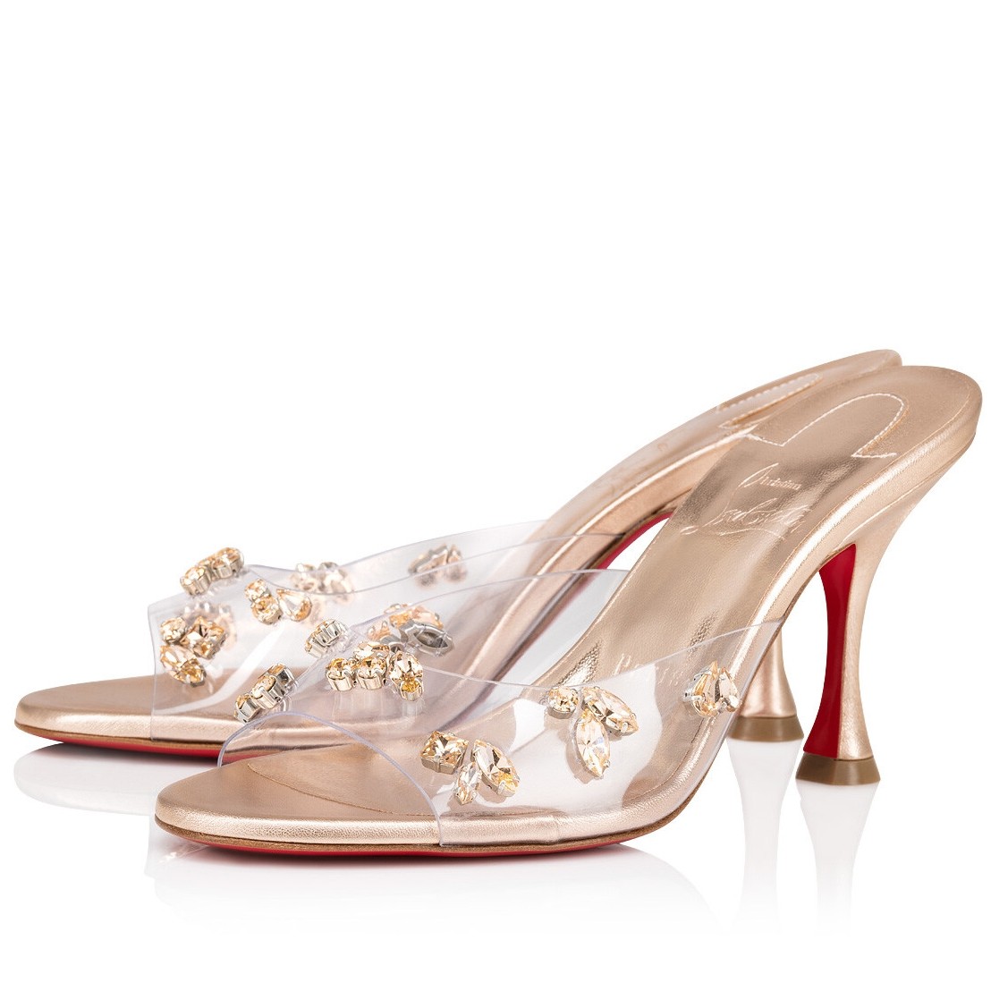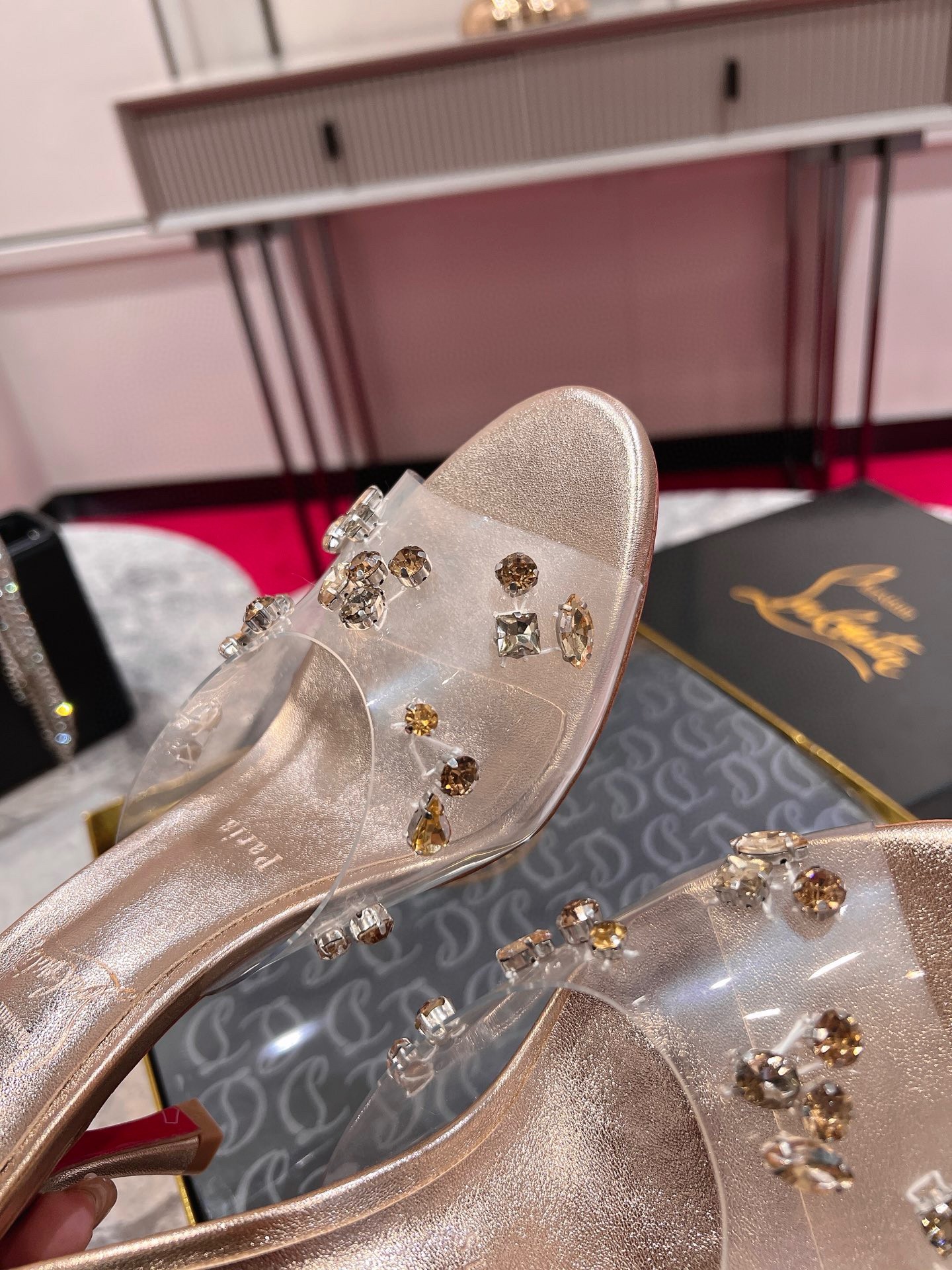 The tapered lines and daring low-cut vamp on the Degraqueen mule showcase Maison Christian Louboutin’s innovative creativity. This model in nappa leather features an 85 mm slanted heel. It is part of the Strass Up capsule and has a transparent PVC upper adorned with silver jewel-like strass for a sophisticated finish.