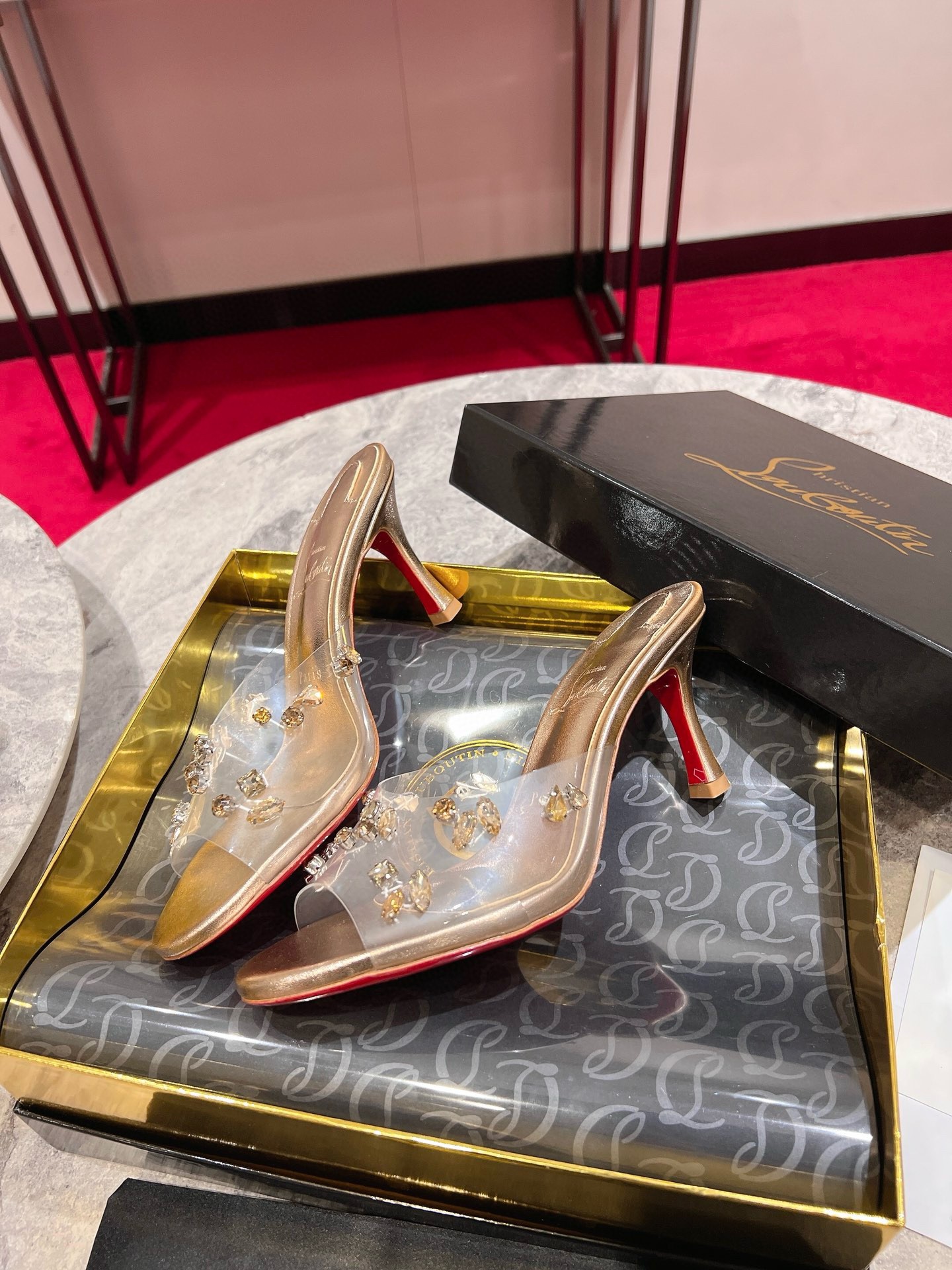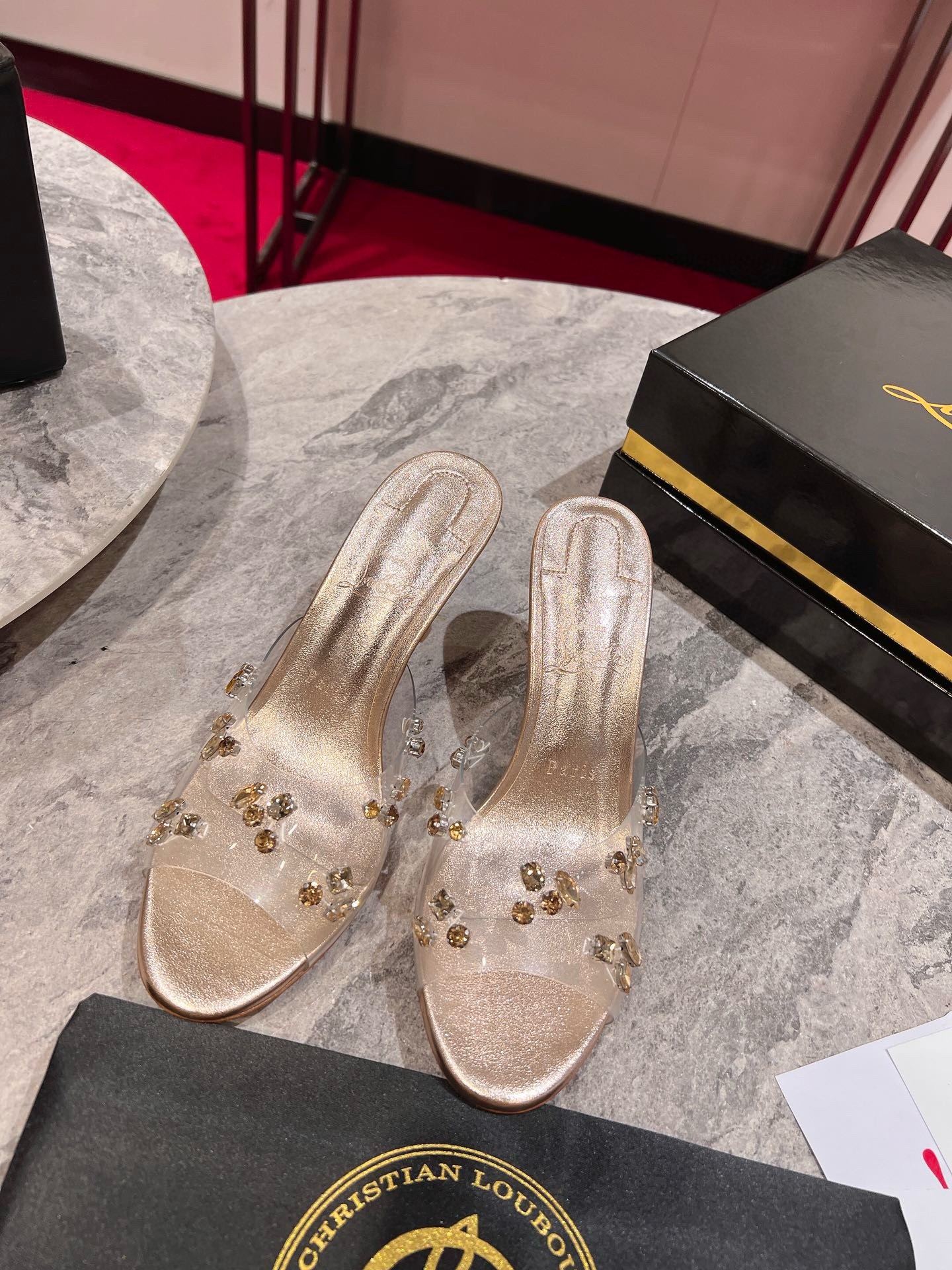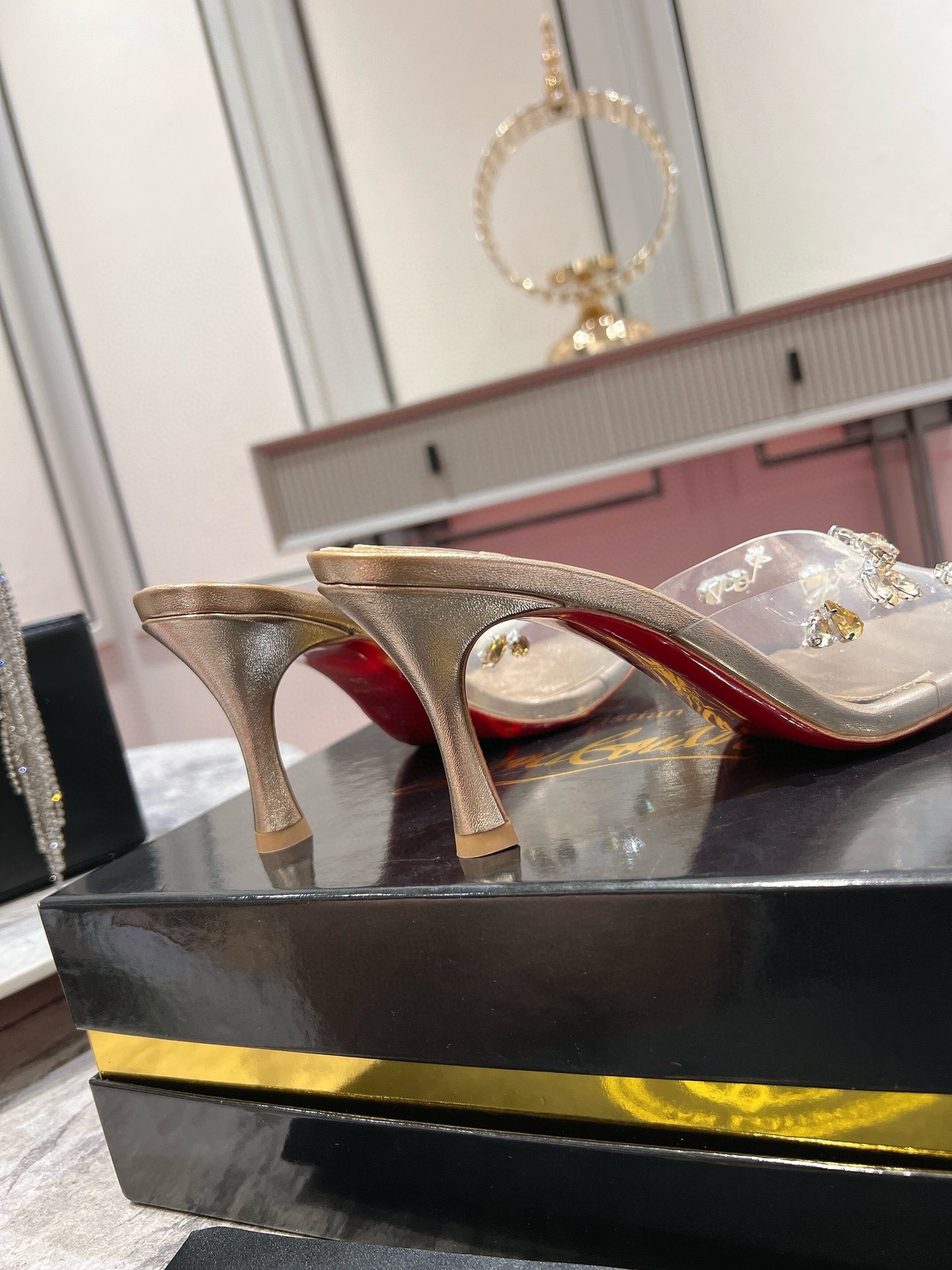 The tapered lines and daring low-cut vamp on the Degraqueen mule showcase Maison Christian Louboutin’s innovative creativity. This model in nappa leather features an 85 mm slanted heel. It is part of the Strass Up capsule and has a transparent PVC upper adorned with silver jewel-like strass for a sophisticated finish.
