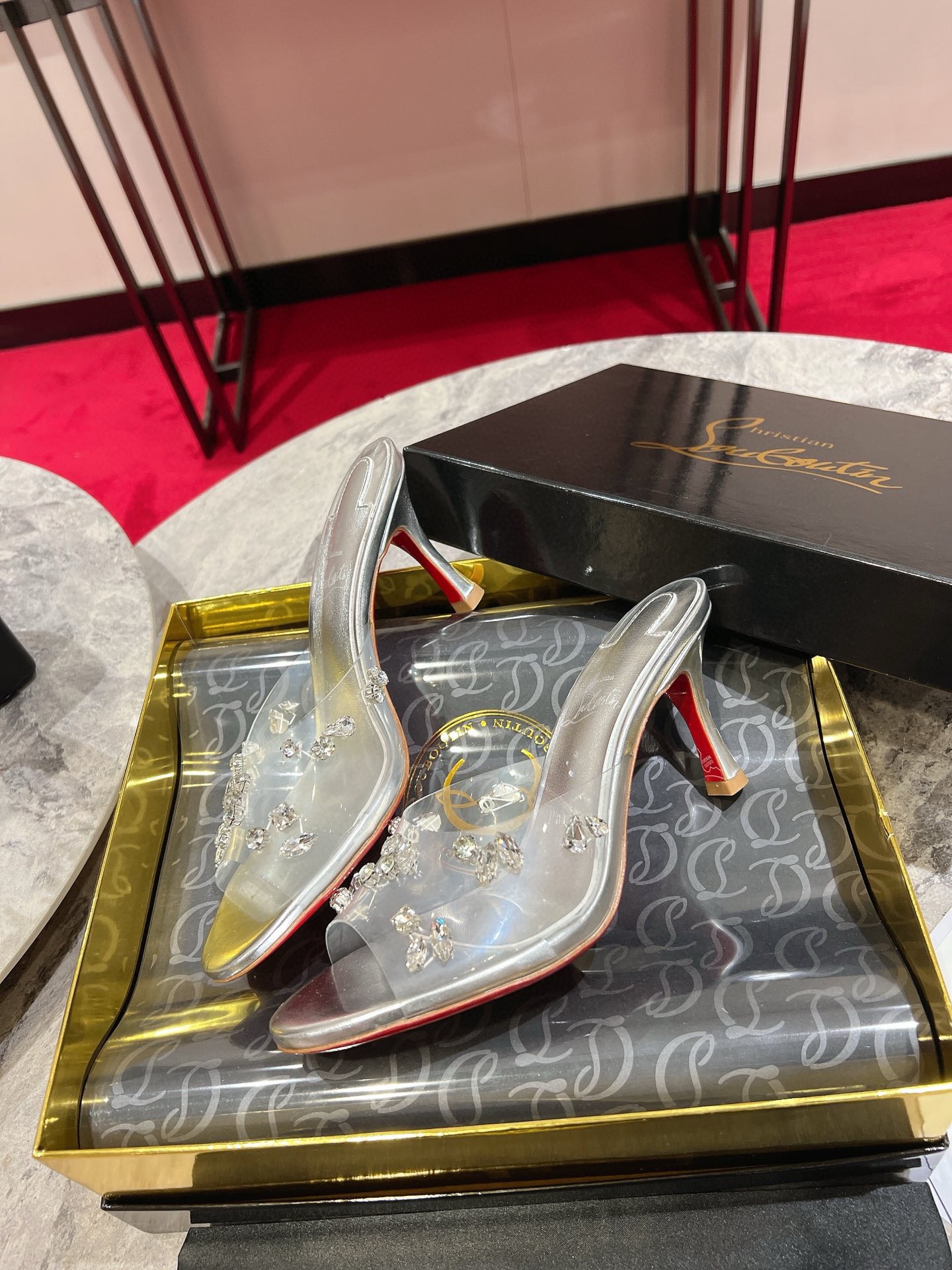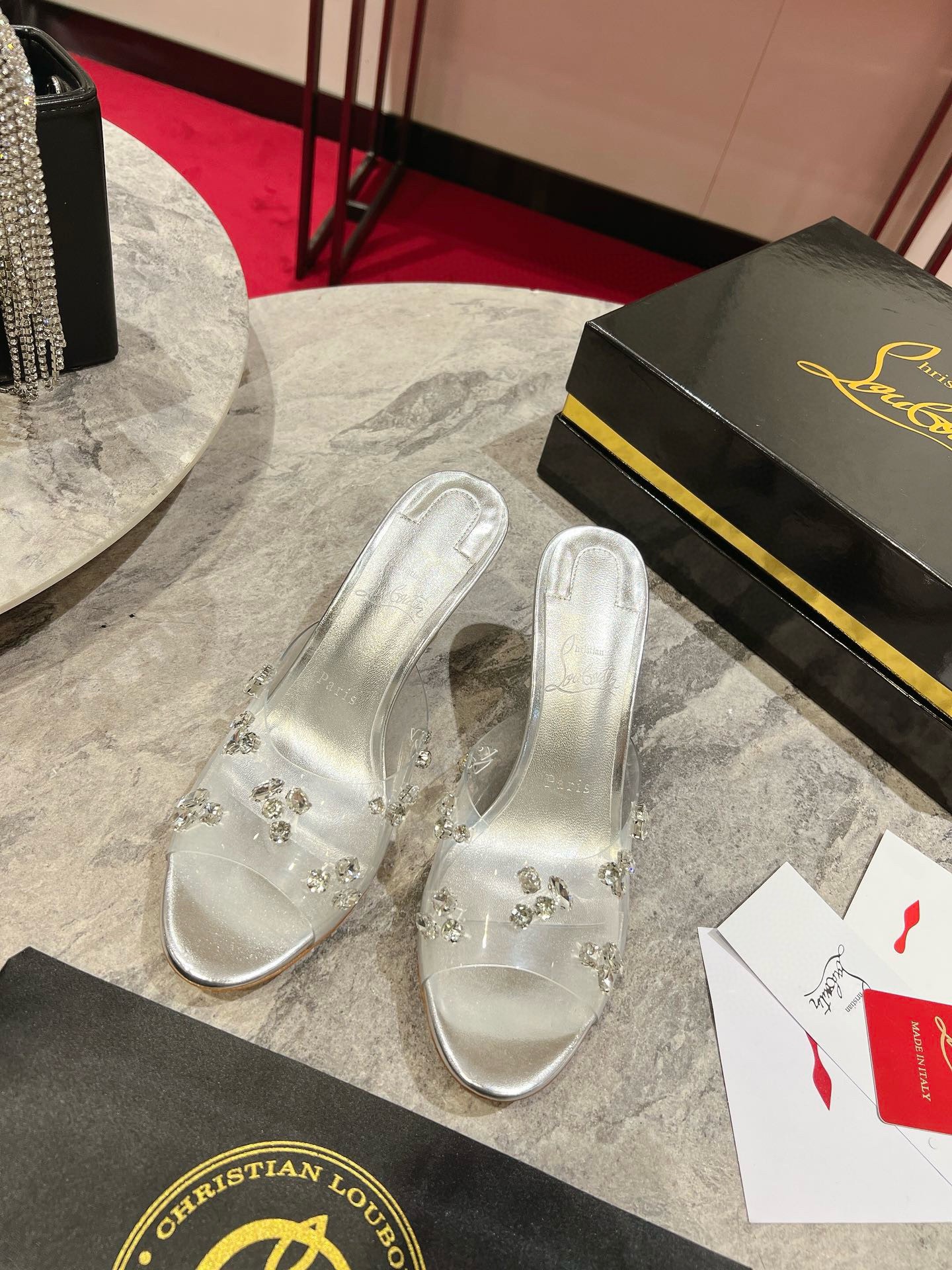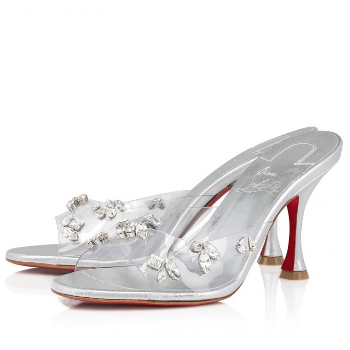 The tapered lines and daring low-cut vamp on the Degraqueen mule showcase Maison Christian Louboutin’s innovative creativity. This model in nappa leather features an 85 mm slanted heel. It is part of the Strass Up capsule and has a transparent PVC upper adorned with silver jewel-like strass for a sophisticated finish.