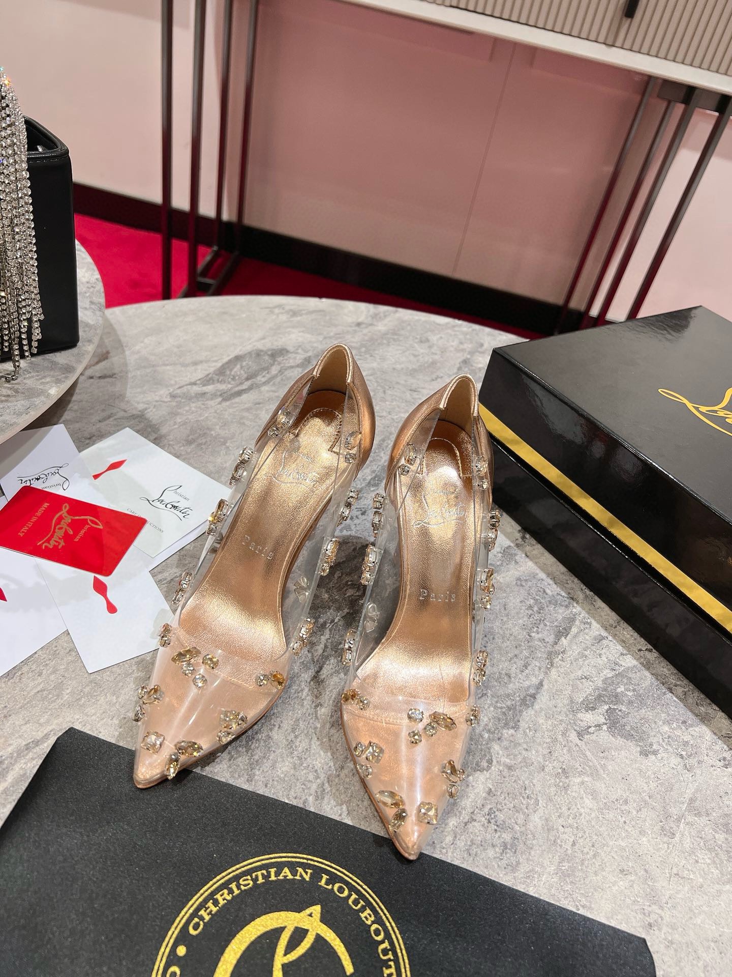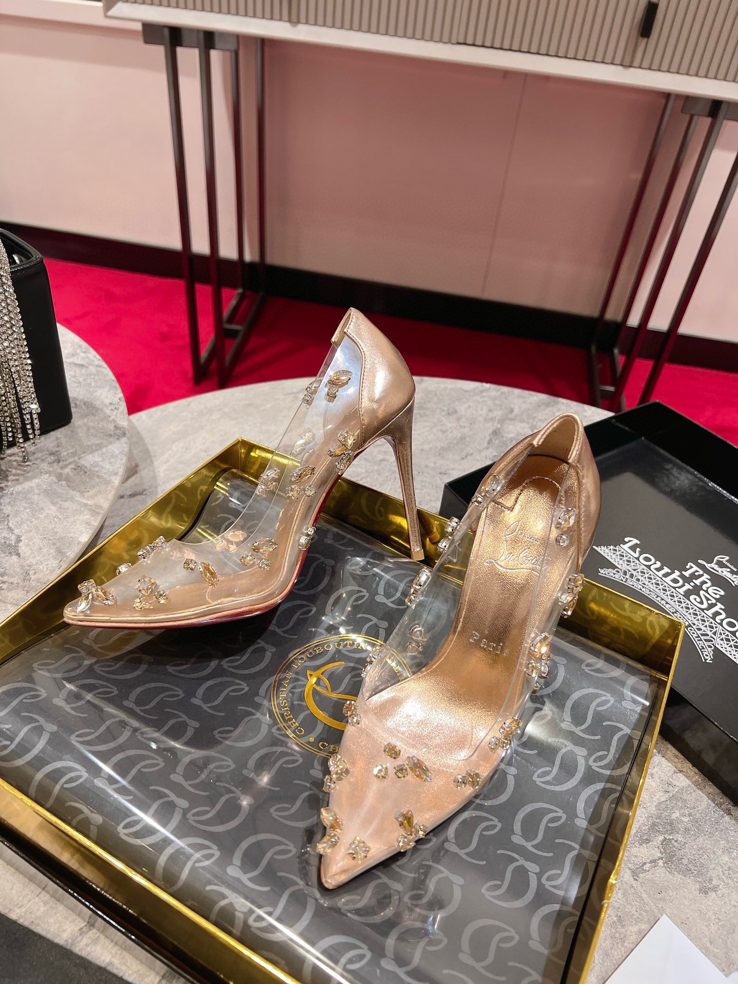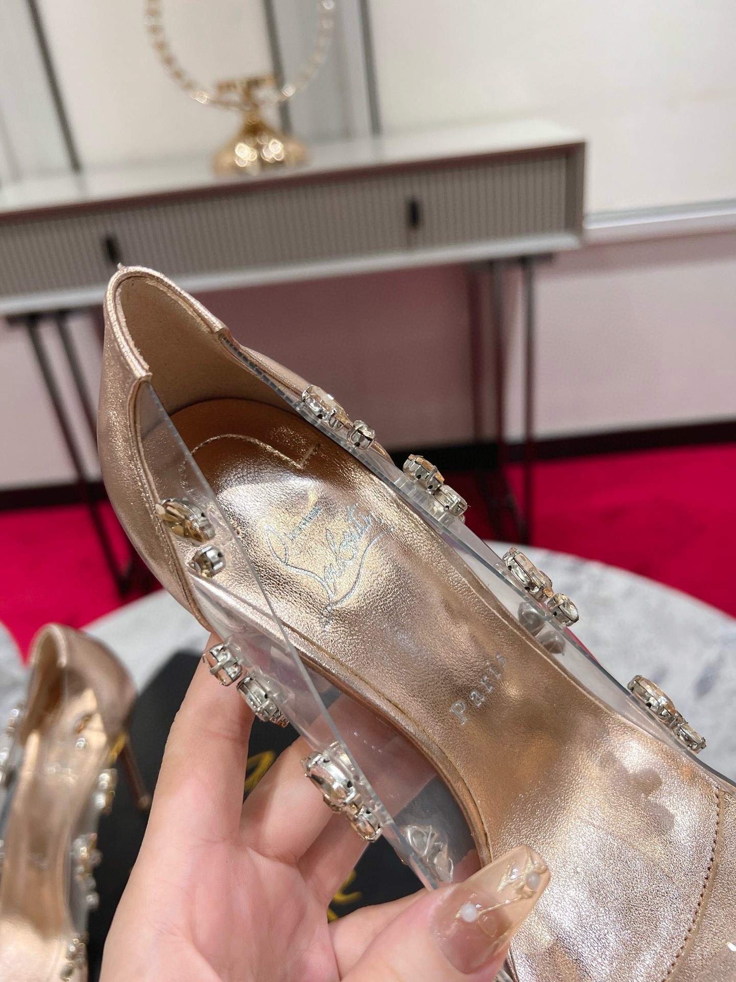 A new twist on the Degrasstrass pump, the Degraqueen pump features the same 85 mm stiletto heel, transparent PVC upper, and a pointed open toe. As part of the Strass Up collection, this modern model is adorned with Maison Christian Louboutin’s latest take on jewels and strass – bigger, bolder crystals, each handsewn onto the PVC upper. The heel and lining are crafted in nappa laminata leather.