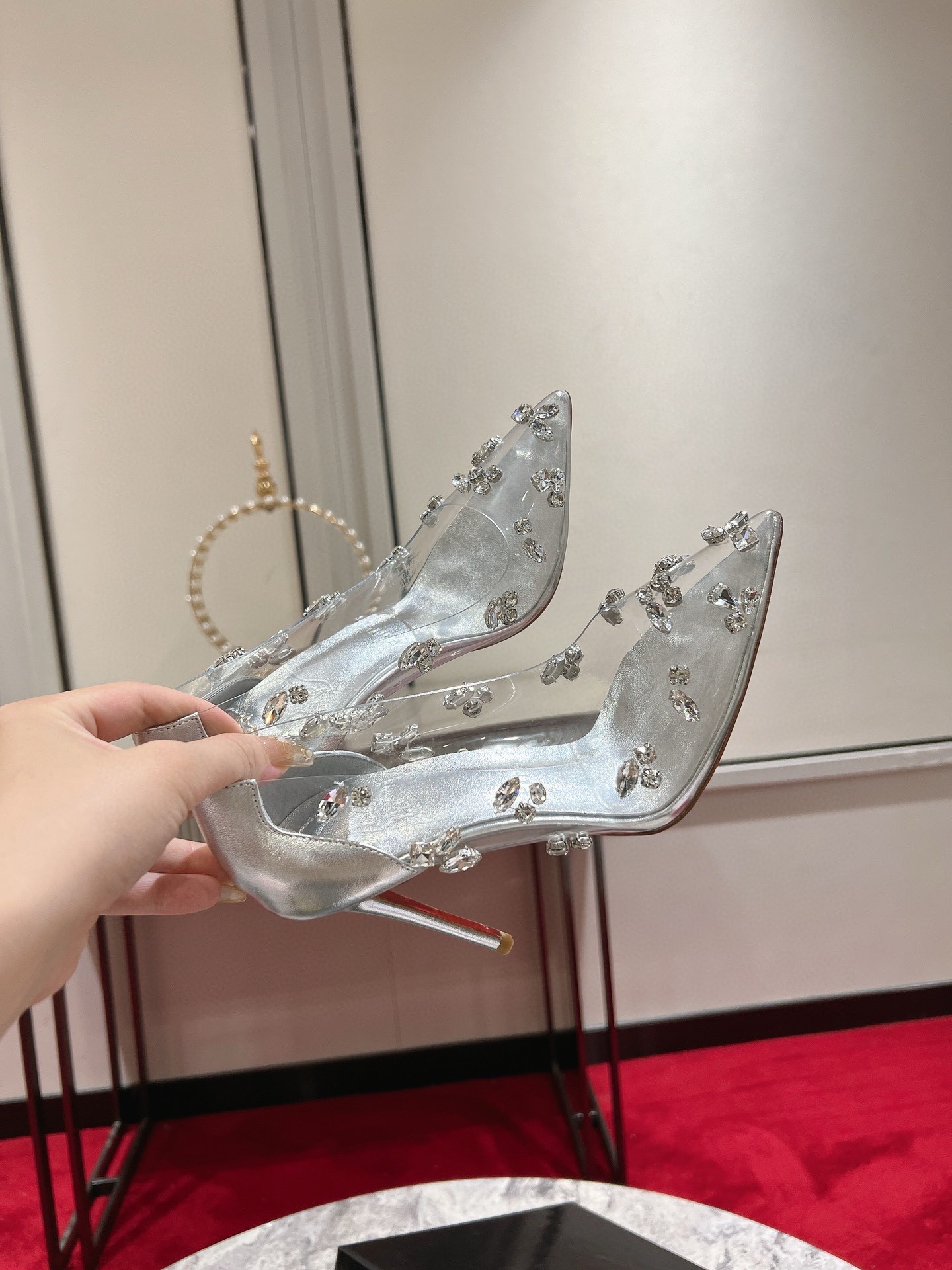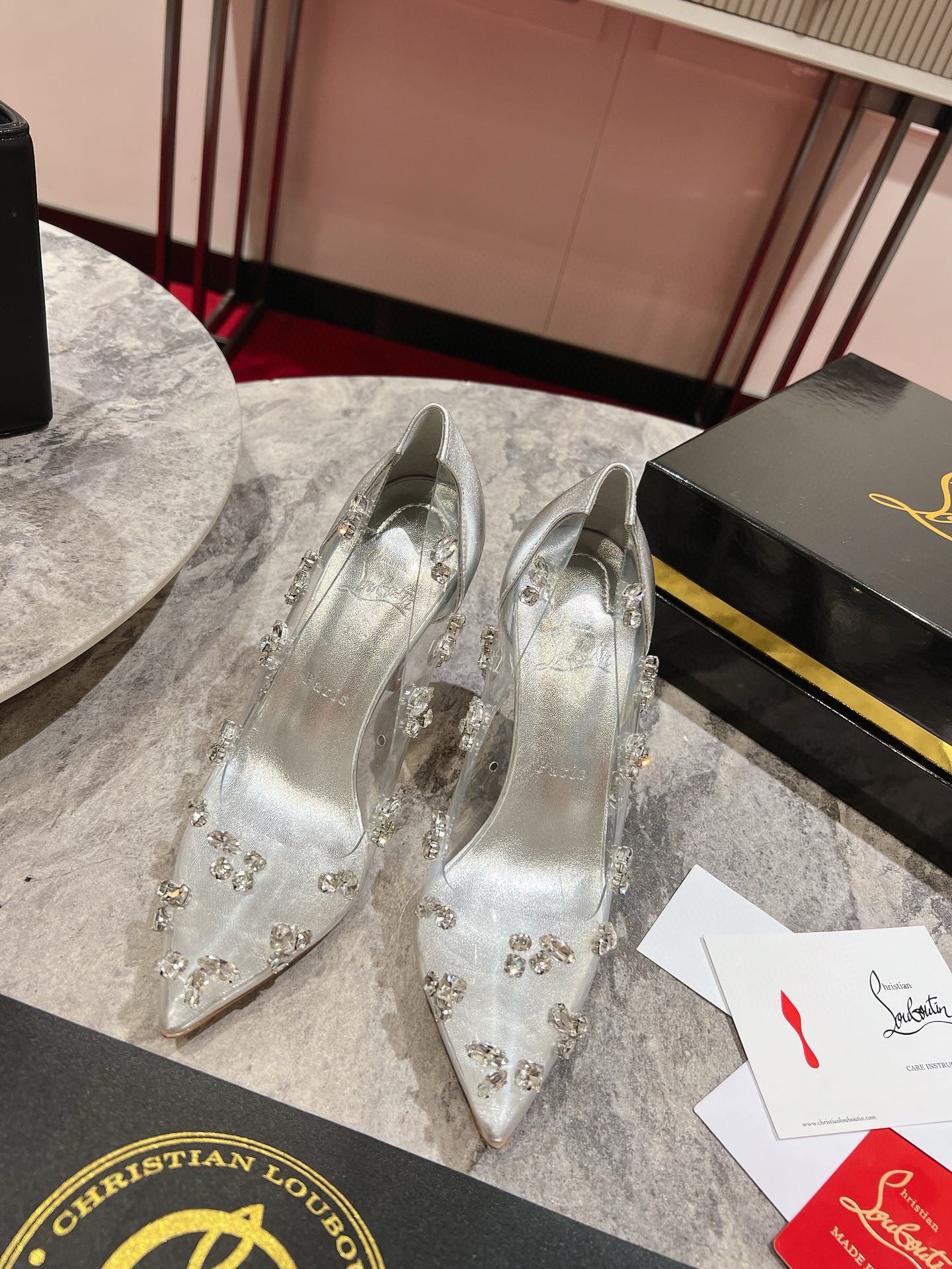 A new twist on the Degrasstrass pump, the Degraqueen pump features the same 85 mm stiletto heel, transparent PVC upper, and a pointed open toe. As part of the Strass Up collection, this modern model is adorned with Maison Christian Louboutin’s latest take on jewels and strass – bigger, bolder crystals, each handsewn onto the PVC upper. The heel and lining are crafted in nappa laminata leather.