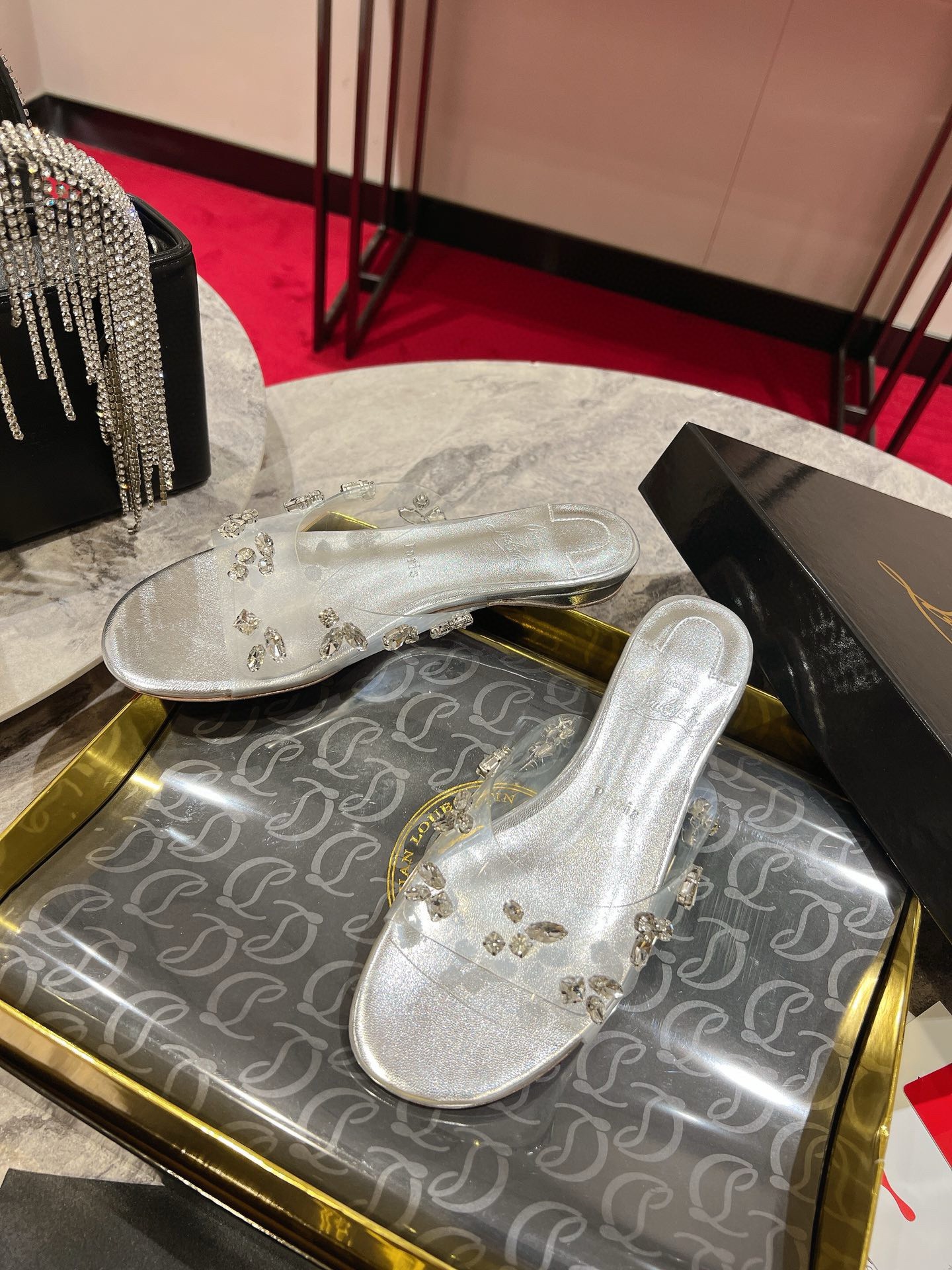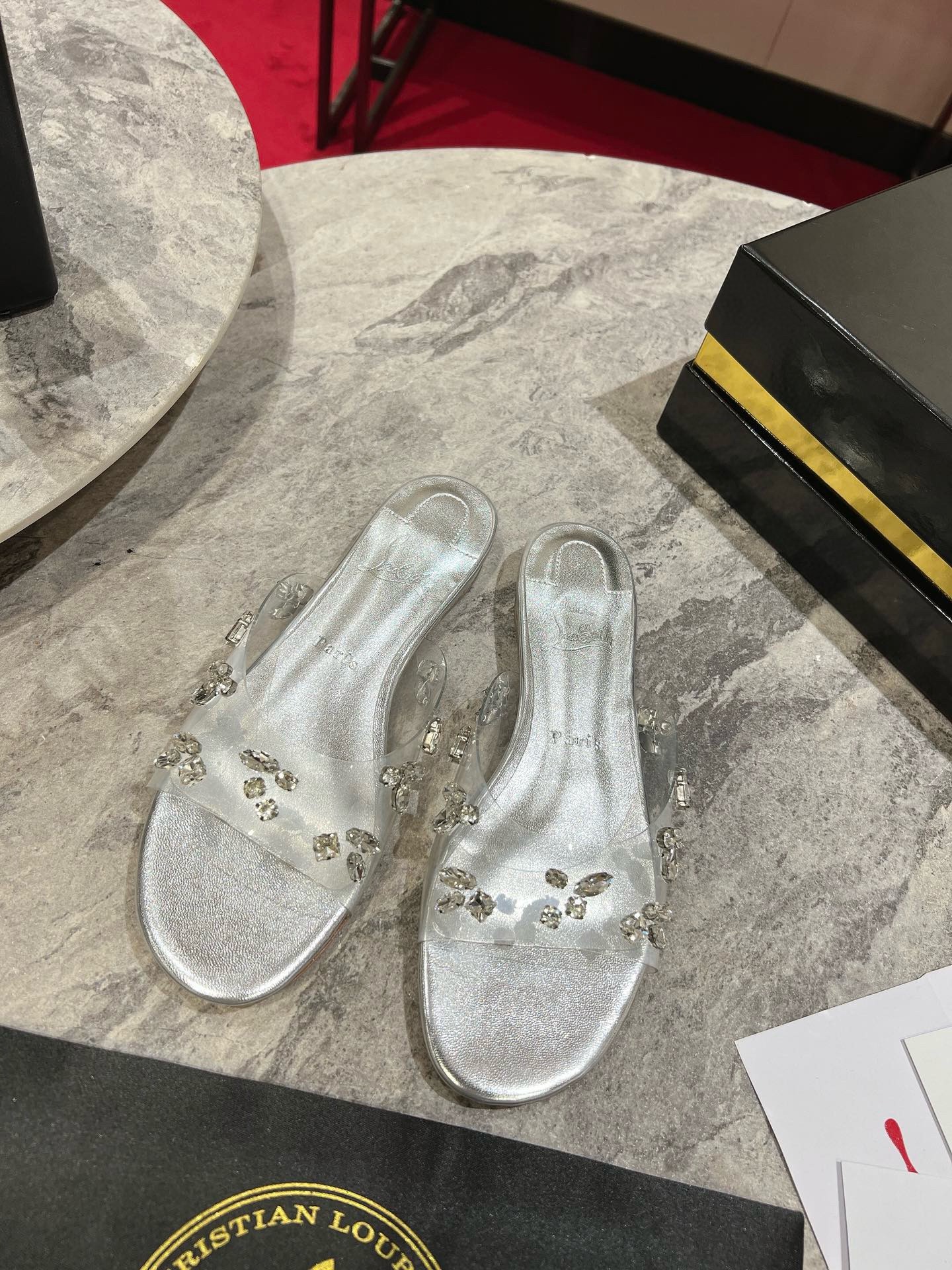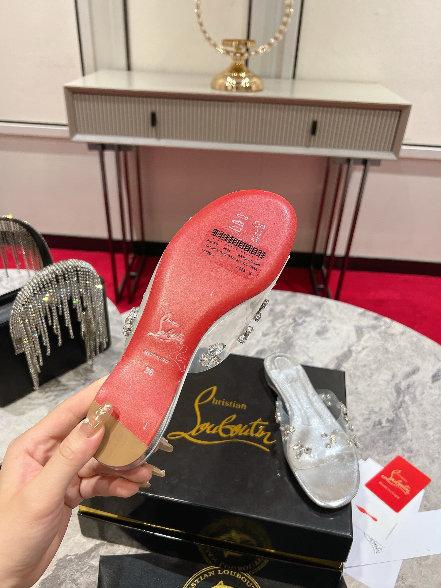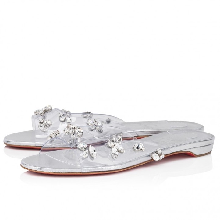 A new twist on the Degrasstrass pump, the Degraqueenie mule features a very slight heel, transparent PVC upper, and elegant open toe. As part of the Strass Up collection, this modern model is adorned with Maison Christian Louboutin’s latest take on jewels and strass – bigger, bolder crystals, each handsewn onto the PVC upper. The heel and lining are crafted in silver nappa laminata leather.