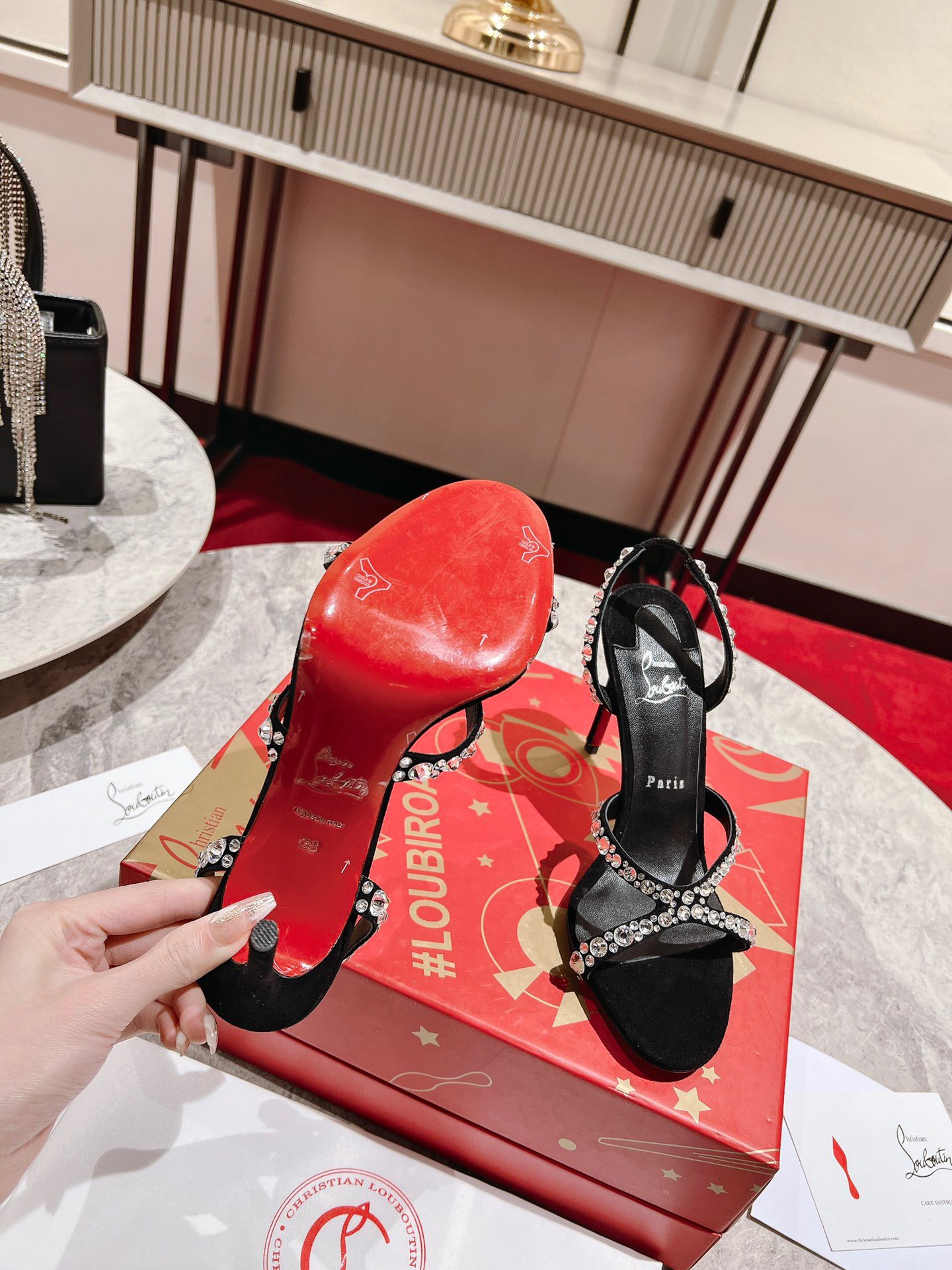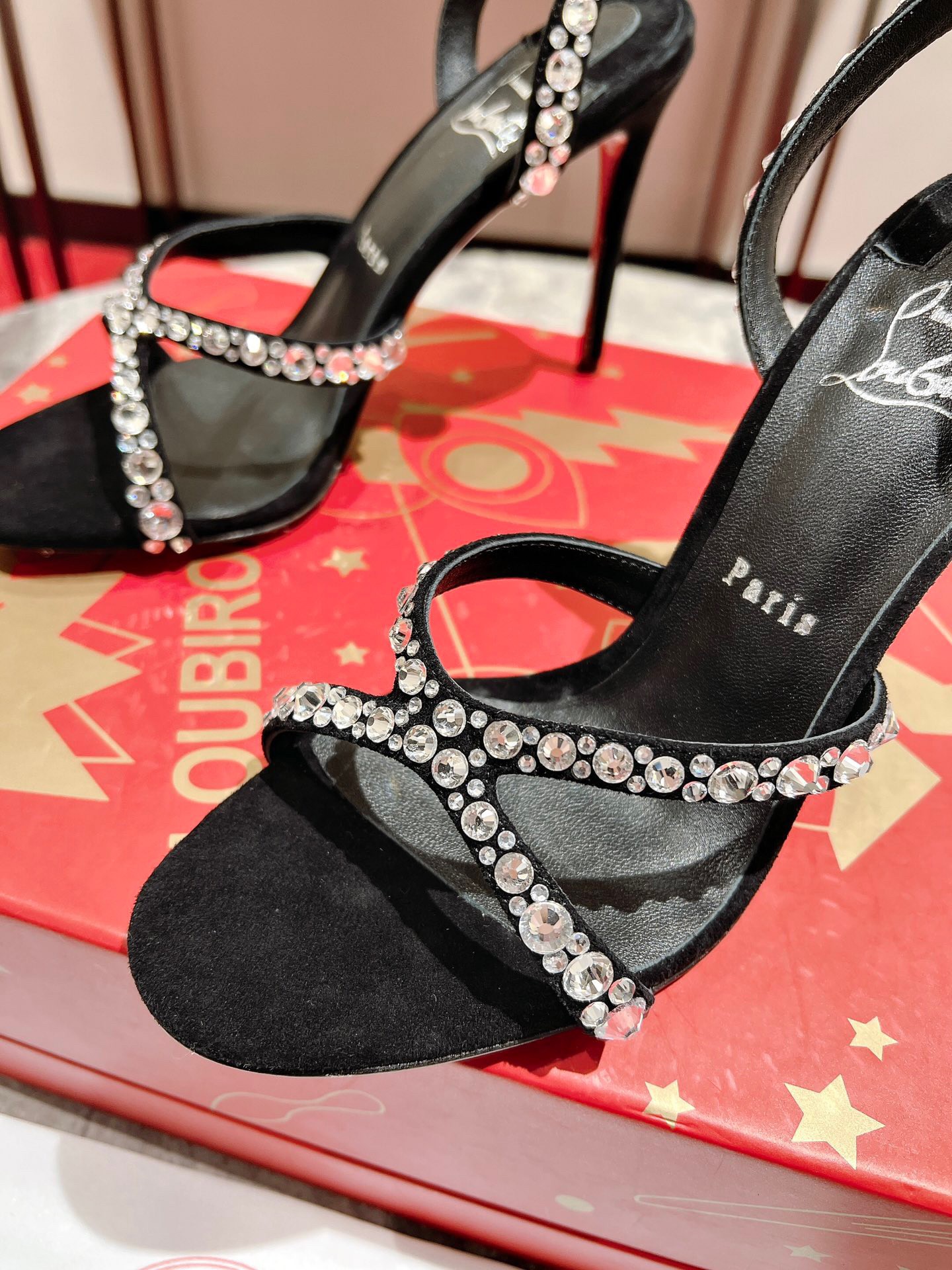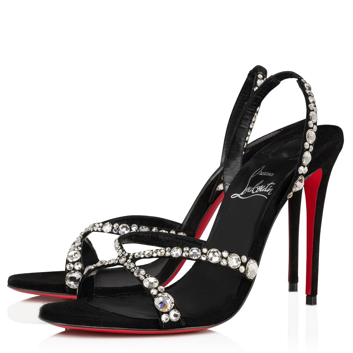 The Emilie strass is a sleek sandal that delicately reveals the foot. It has straps that cross over the front of the foot, showcasing Maison Christian Louboutin’s sophistication. Crafted entirely in black veau velours and featuring a 100 mm heel, this model is adorned with a myriad of strass in different sizes. The slender ankle strap is elasticated.