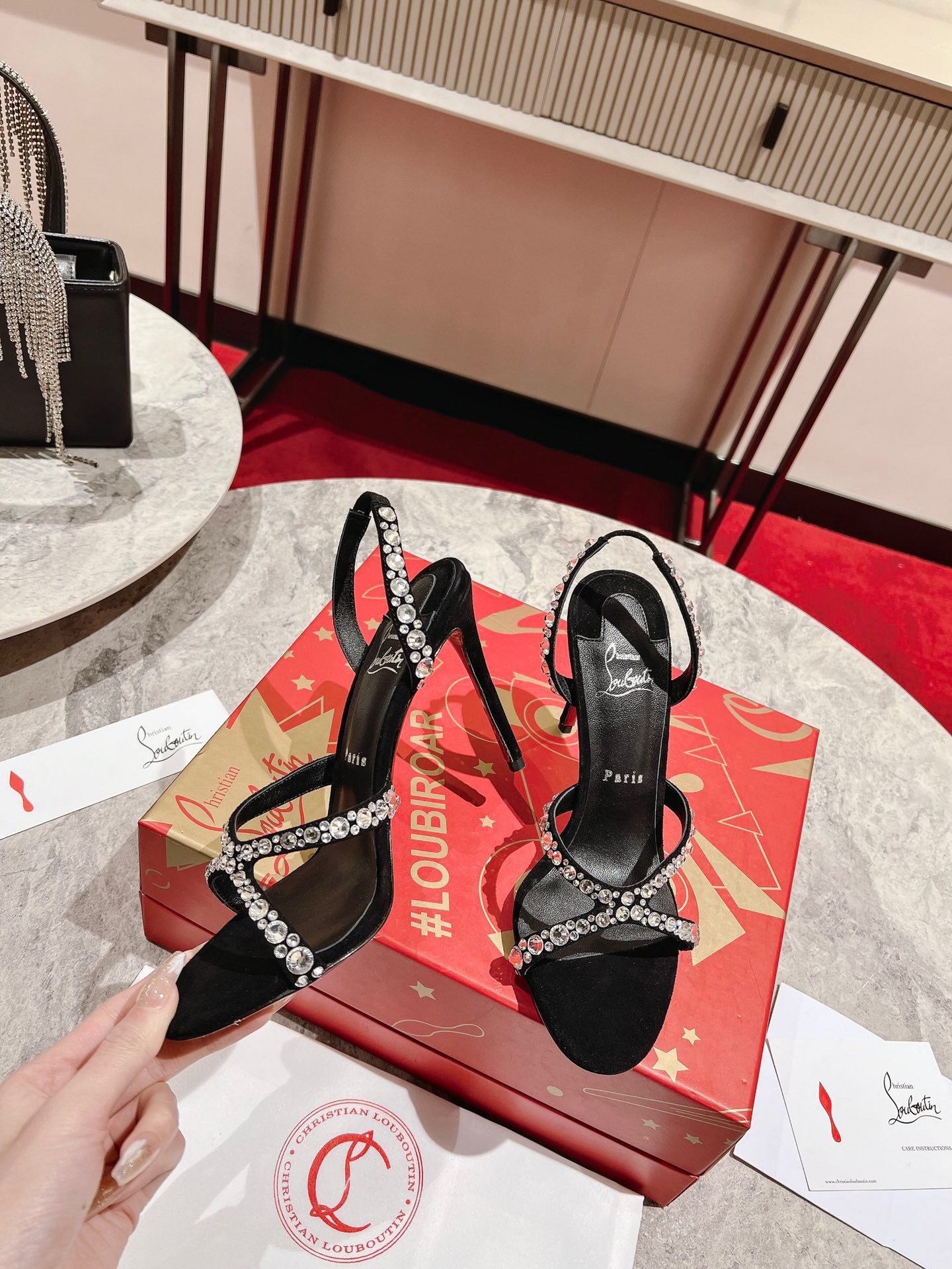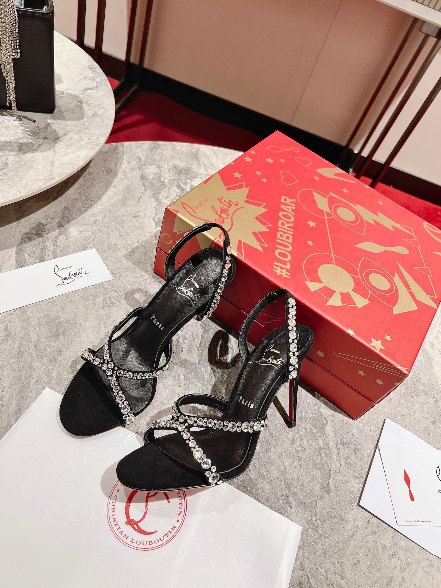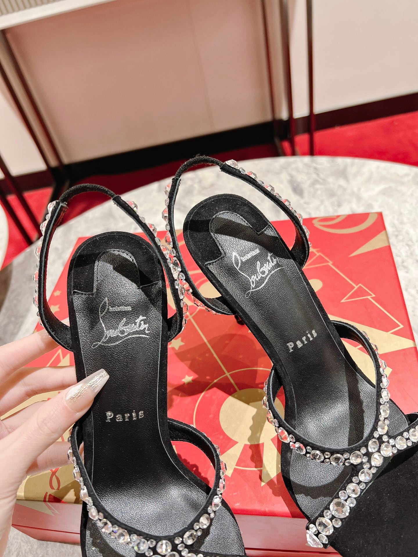 The Emilie strass is a sleek sandal that delicately reveals the foot. It has straps that cross over the front of the foot, showcasing Maison Christian Louboutin’s sophistication. Crafted entirely in black veau velours and featuring a 100 mm heel, this model is adorned with a myriad of strass in different sizes. The slender ankle strap is elasticated.