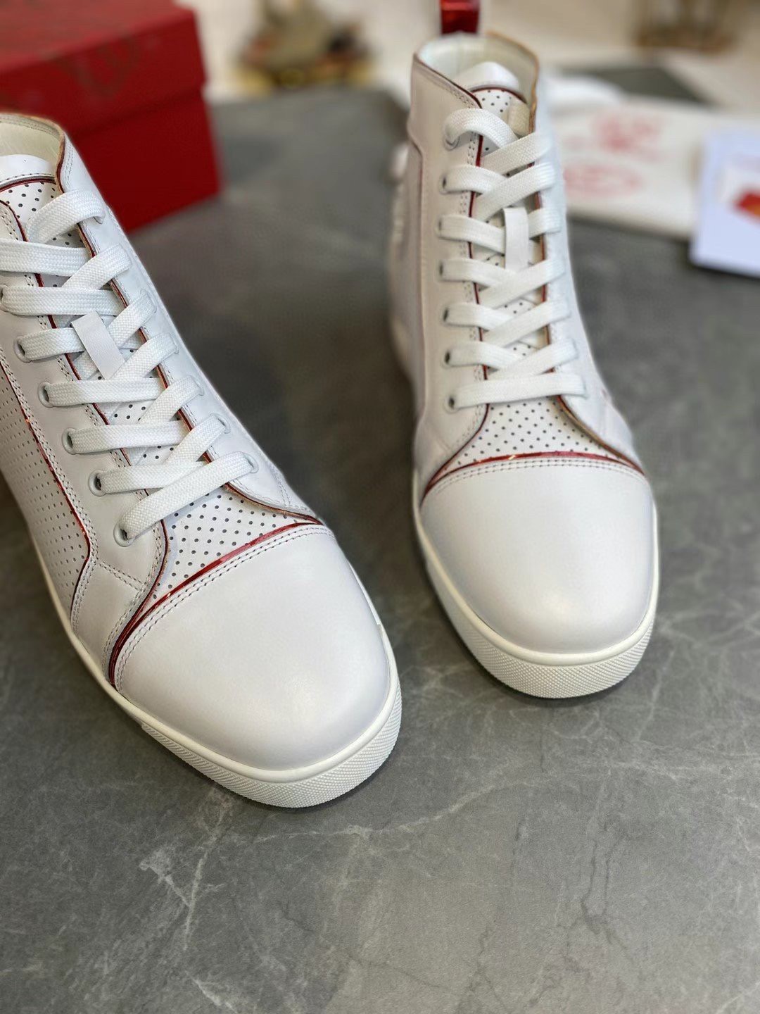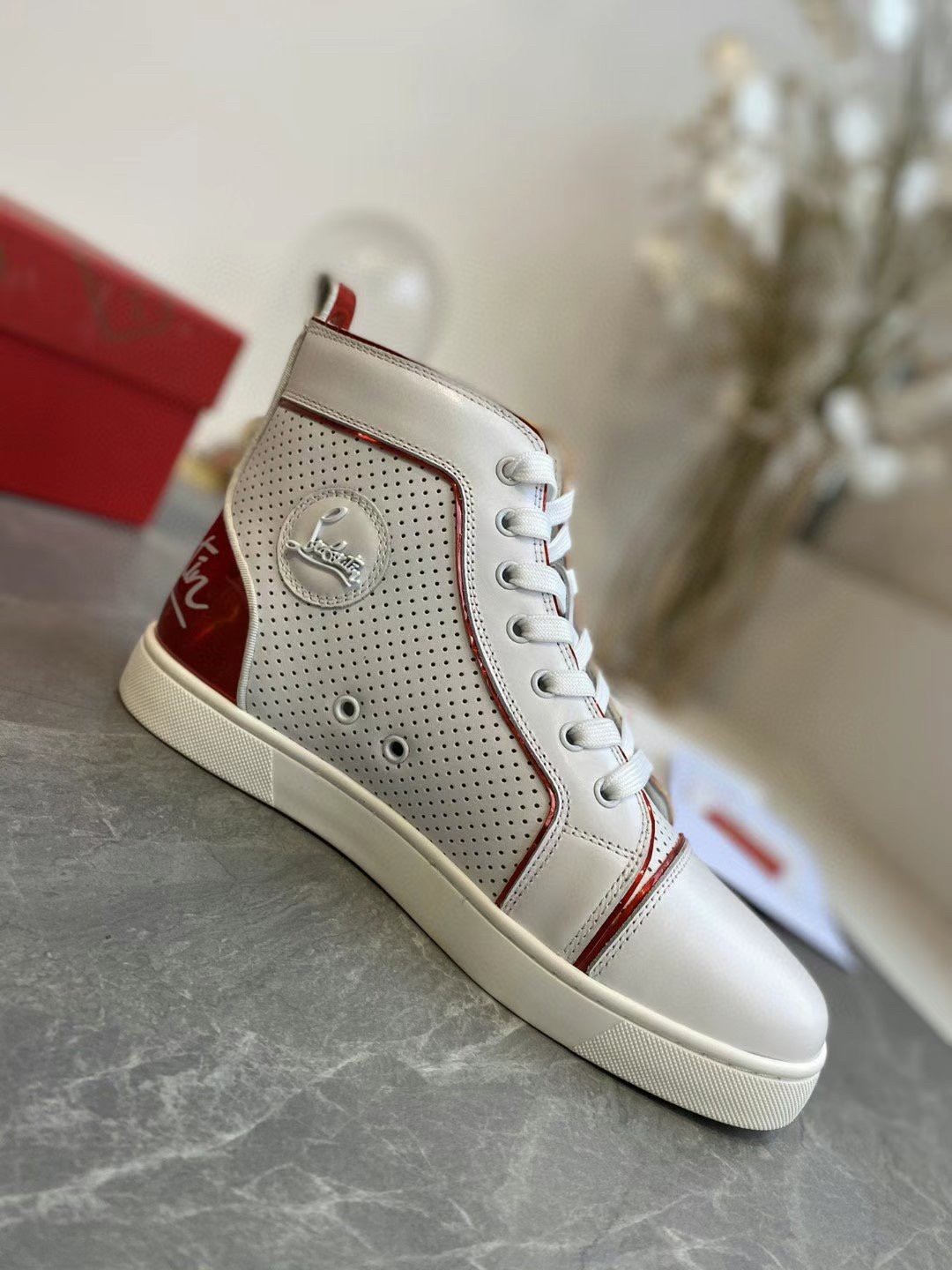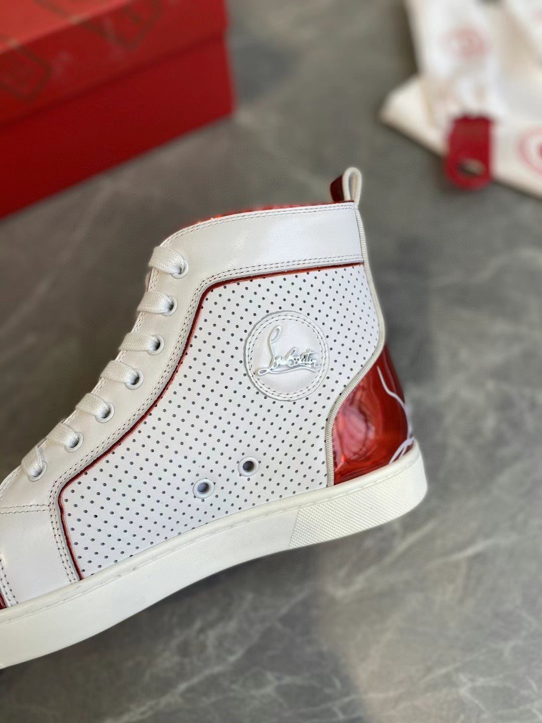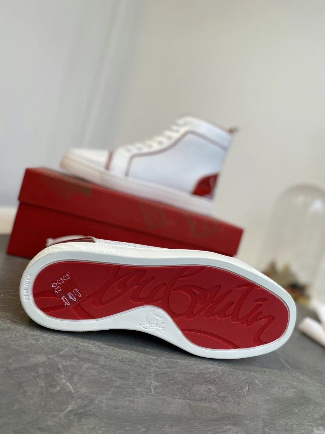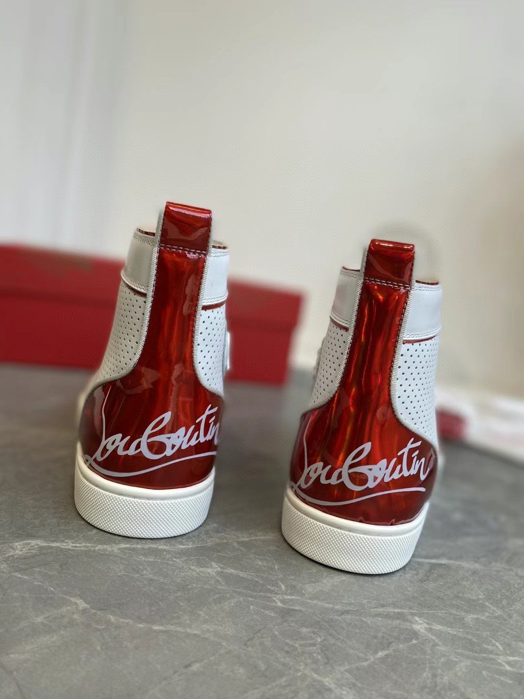 The Fun Louis Woman high-top sneaker is inspired by the world of basketball and mounted on a white rubber sole. The upper of this iconic model skilfully marries white perforated leather and Loubi red iridescent patent calfskin in a combination of elegant and sporty lines. Accented by delicate finishes, the counter is also adorned with the creator’s signature and a badge bearing his name.