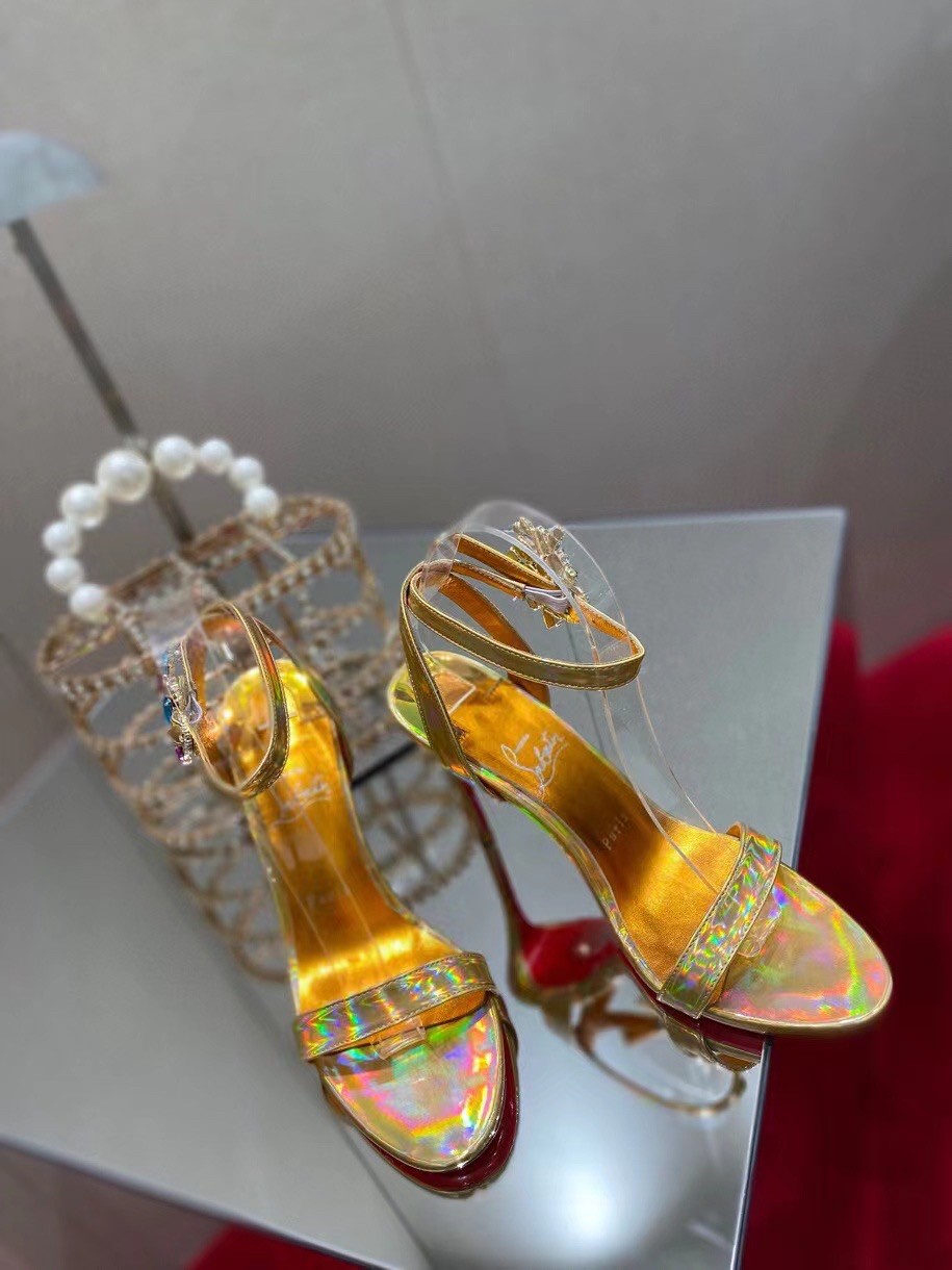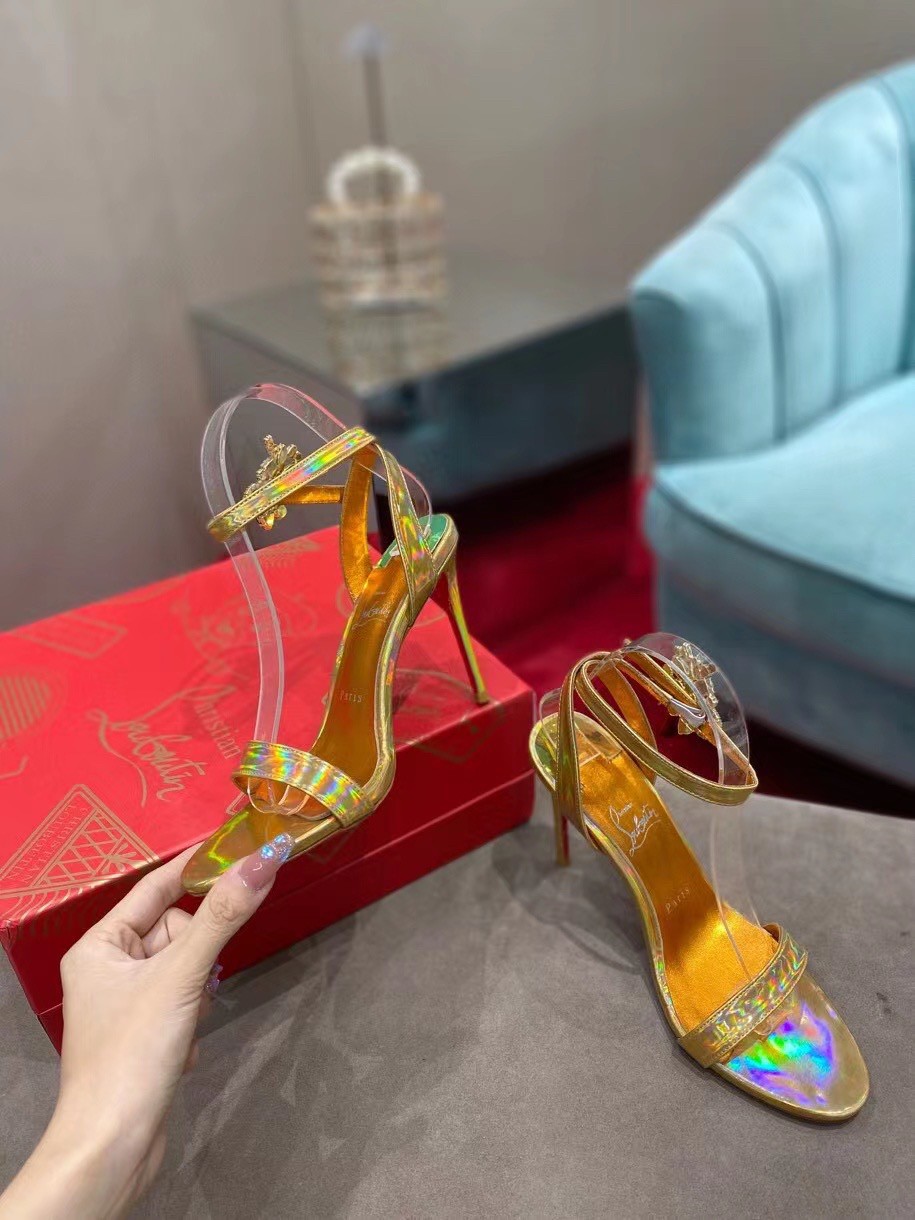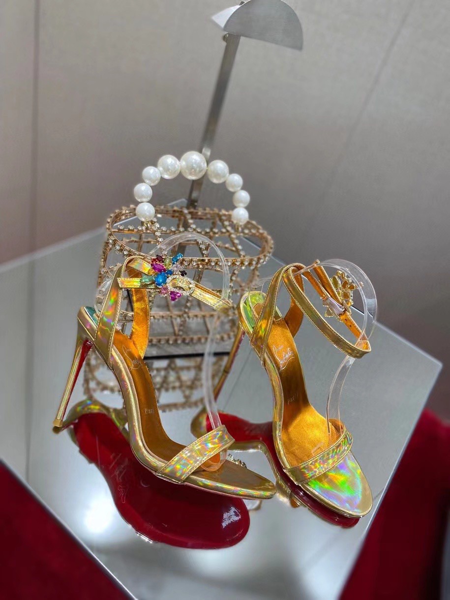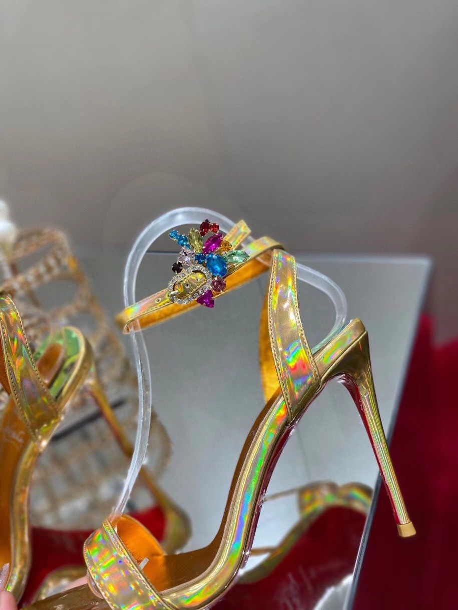 The Goldie Joli sandal is a refined shoe distinguished by its elegance and minimalist style. This Maison Christian Louboutin shoe is set on a 100 mm heel and is designed in patent calfskin leather. It has a crossed strap at the back which delicately envelops the ankle. The buckle is set with silver and multicolored rhinestones, creating a scintillating effect.