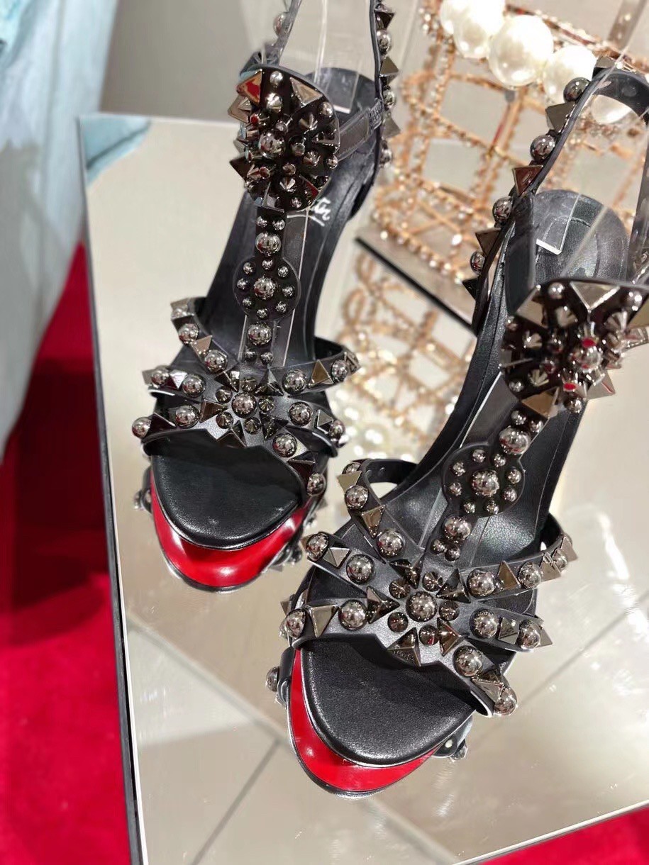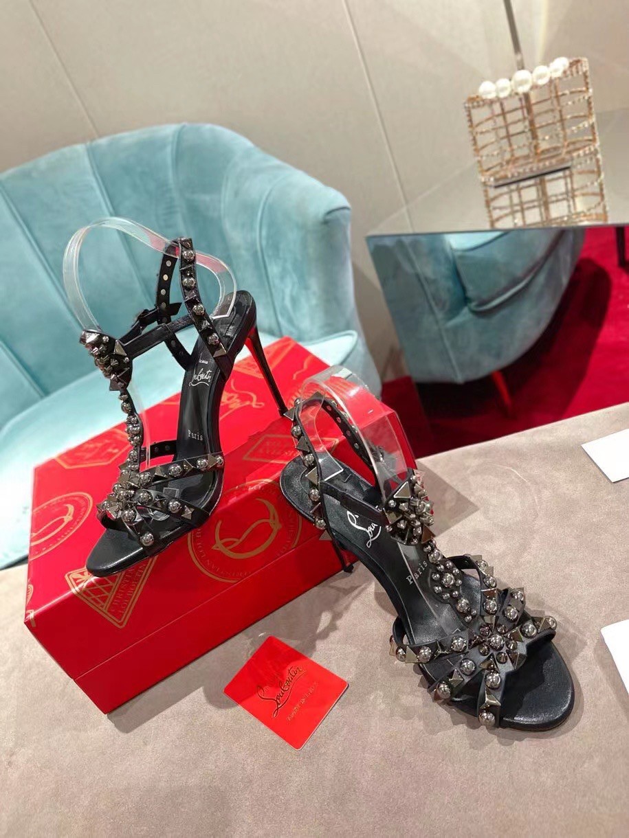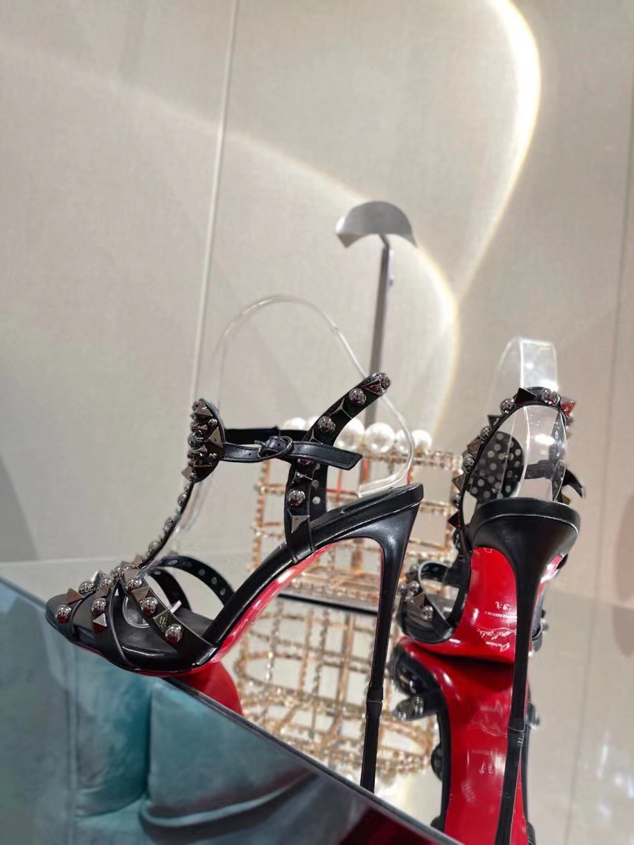 The Goldora sandal is sophisticated and refined and is distinguished by its modern style. This black leather model is set on a 100 mm heel and features crossover straps on the vamp. It is embellished with alternating round and pyramidal silver spikes, an emblematic signature detail of Maison Christian Louboutin, creating a luminous effect.