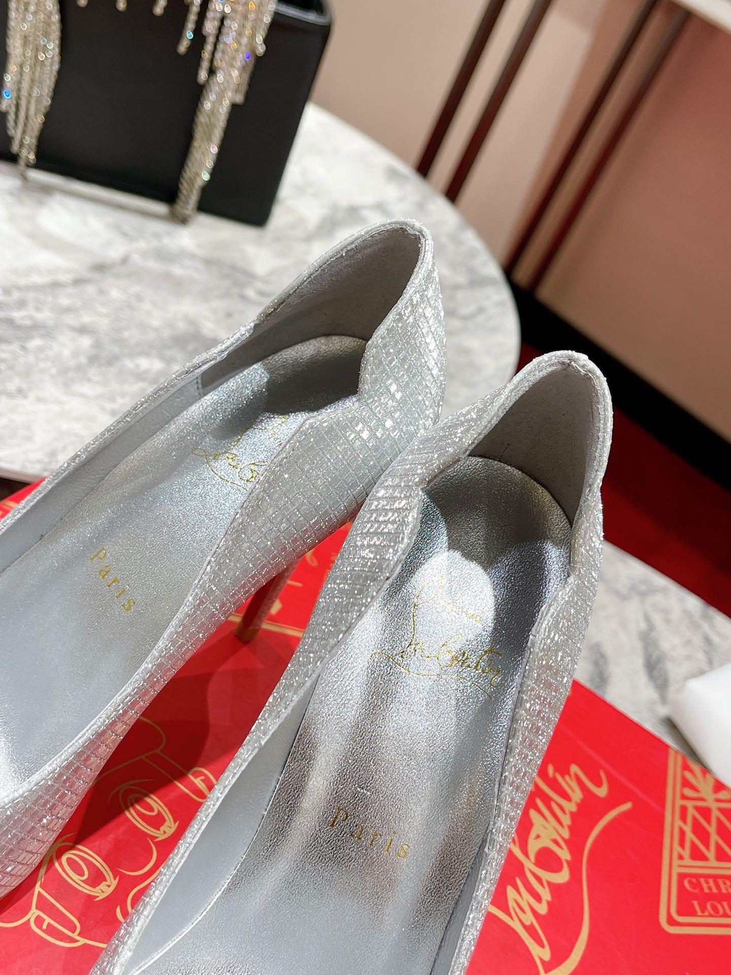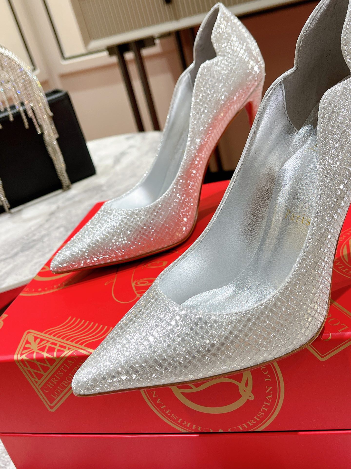 The Hot Chick pump is an iconic Maison Christian Louboutin design and stands out thanks to a wide, plunging vamp enhanced by a pointed toe and V-shaped notches under the ankle. Set on a 100 mm heel, the striking delicacy of its finishes highlight its tone-on-tone insole. This pump exudes sophistication thanks to its embossed silver sequin finish, for an elegant, timeless style.
