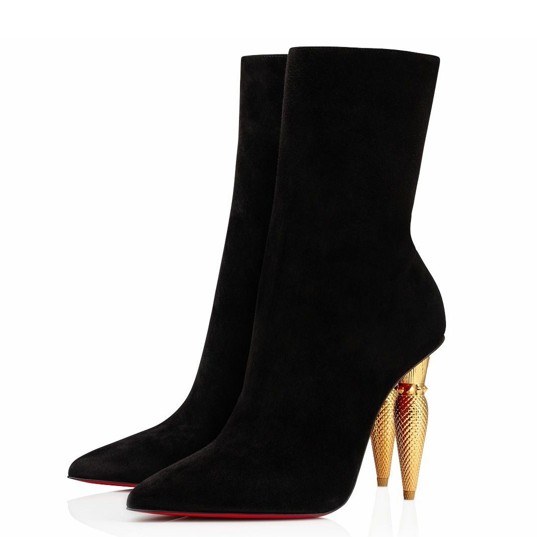 The Lipbooty boot showcases clean lines and timeless elegance. This model is part of the Loubi Mystery capsule inspired by designer Yaz Bukey’s Turkish origins and the board game, Clue. Crafted in black veau velours, it features a pointed toe and intricate details. This graphic boot has a 100 mm gold heel. A captivating design evoking Maison Christian Louboutin’s iconic red lipstick.