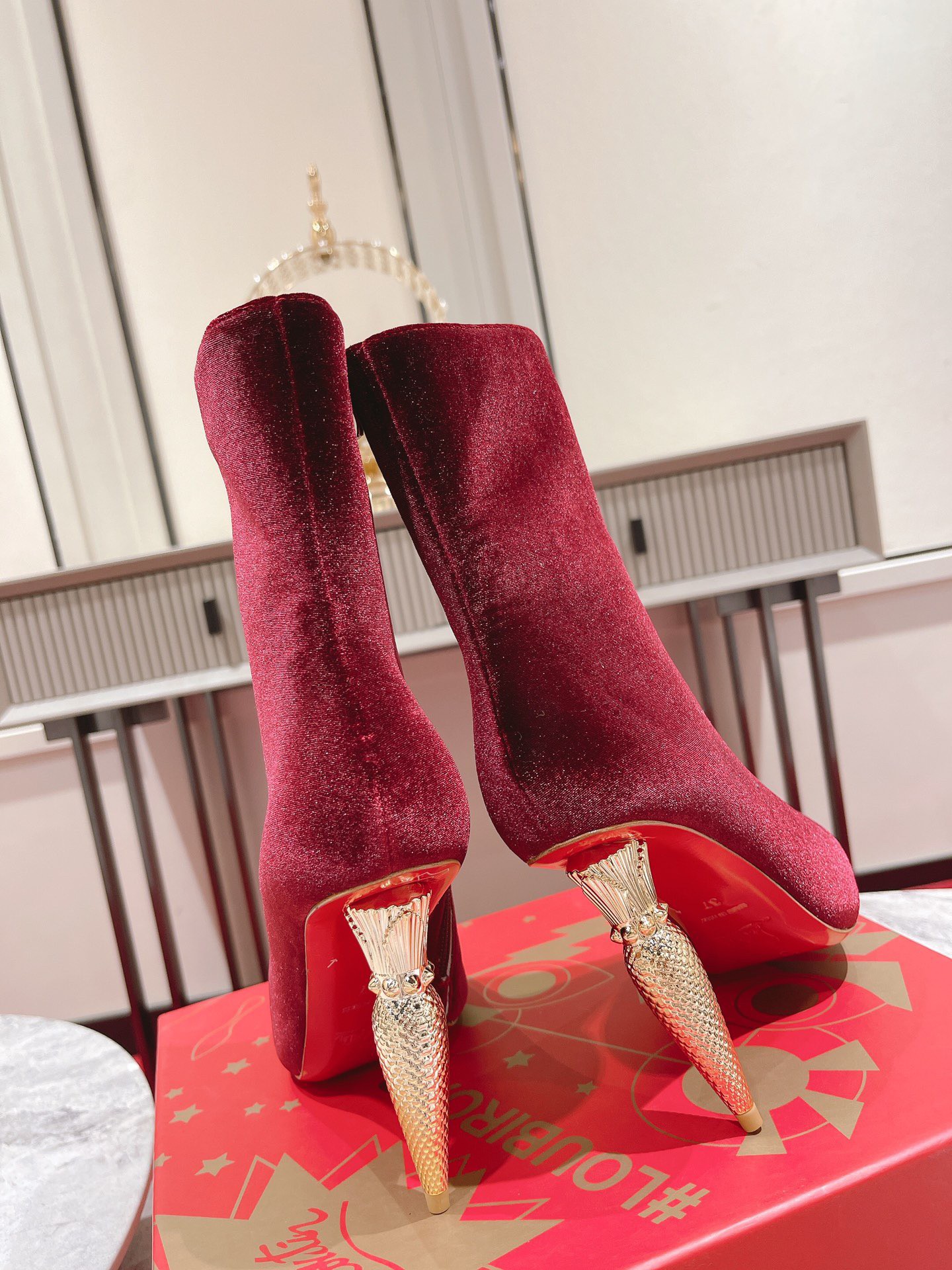 The Lipbooty boot showcases clean lines and timeless elegance. Crafted in Galata red veau velours, it features a pointed toe and intricate details. This graphic boot has a 100 mm gold heel. A captivating design evoking Maison Christian Louboutin’s iconic red lipstick tube. This model is an online exclusive.