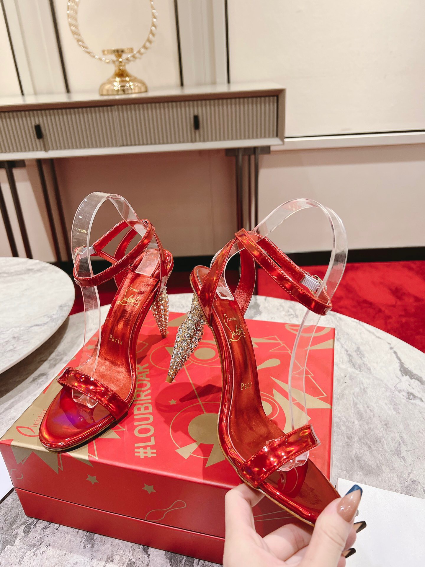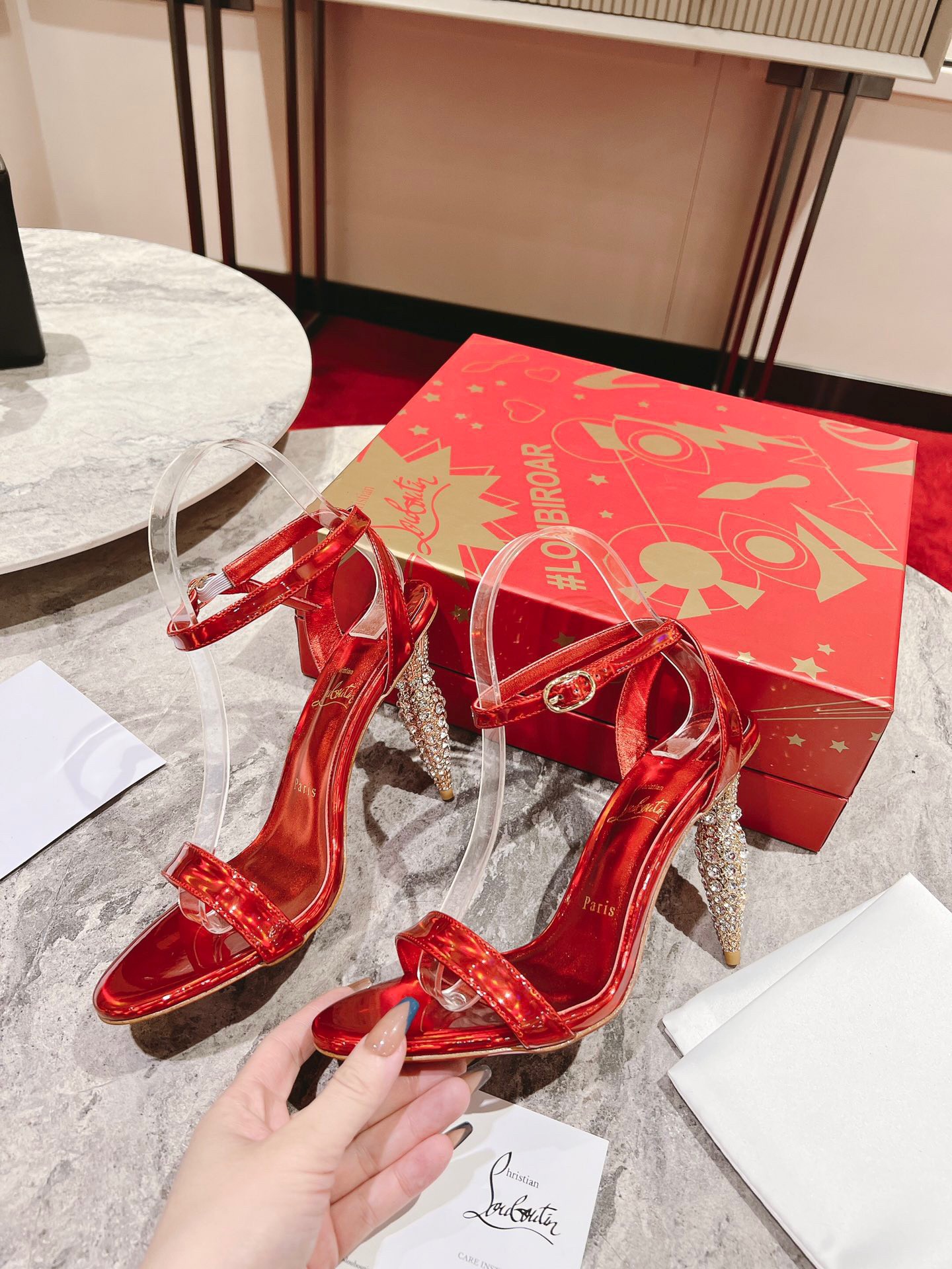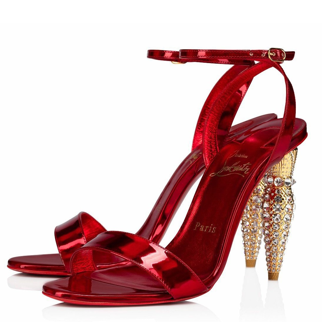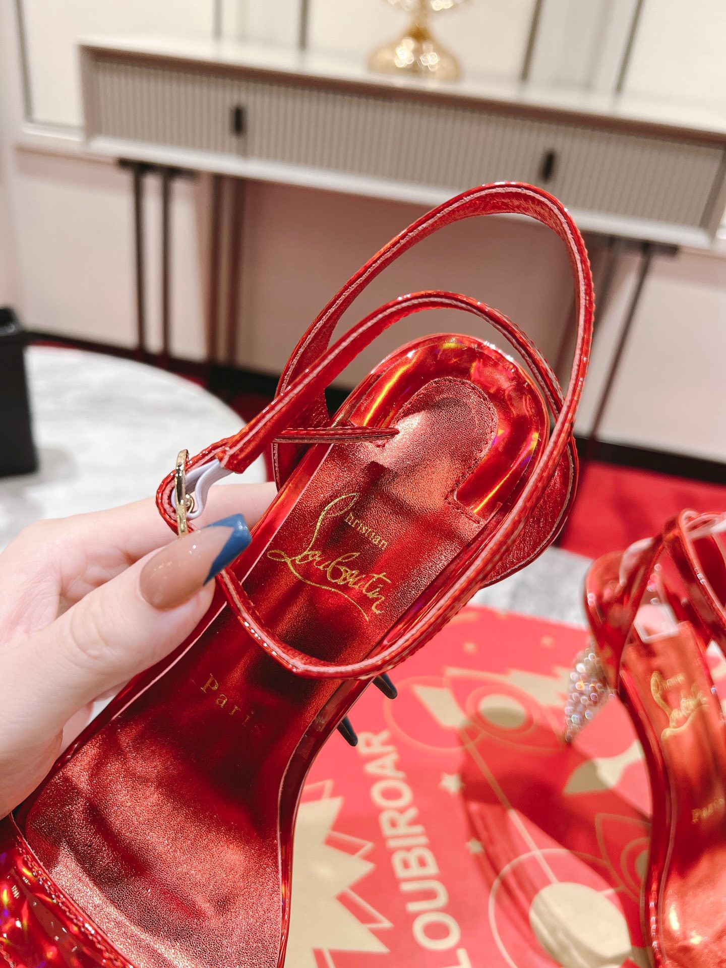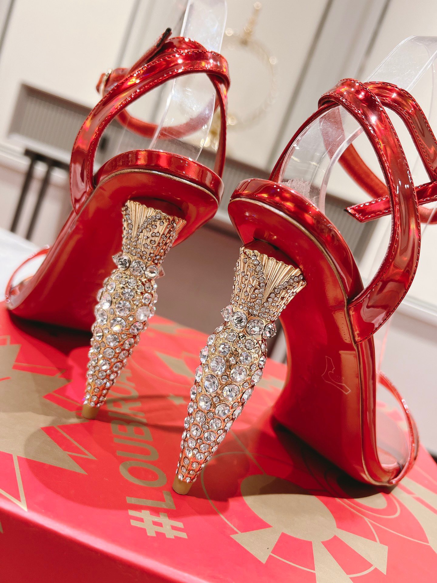 The sophisticated Lipstrass Queen daringly reveals the foot. It is crafted in iridescent Loubi red patent calf leather and features a strap across the toe and a slender ankle strap. This graphic style has a 100 mm gold heel. A captivating design enhanced with hand-placed strass, evoking Maison Christian Louboutin’s iconic red lipstick inspired by Egyptian columns.