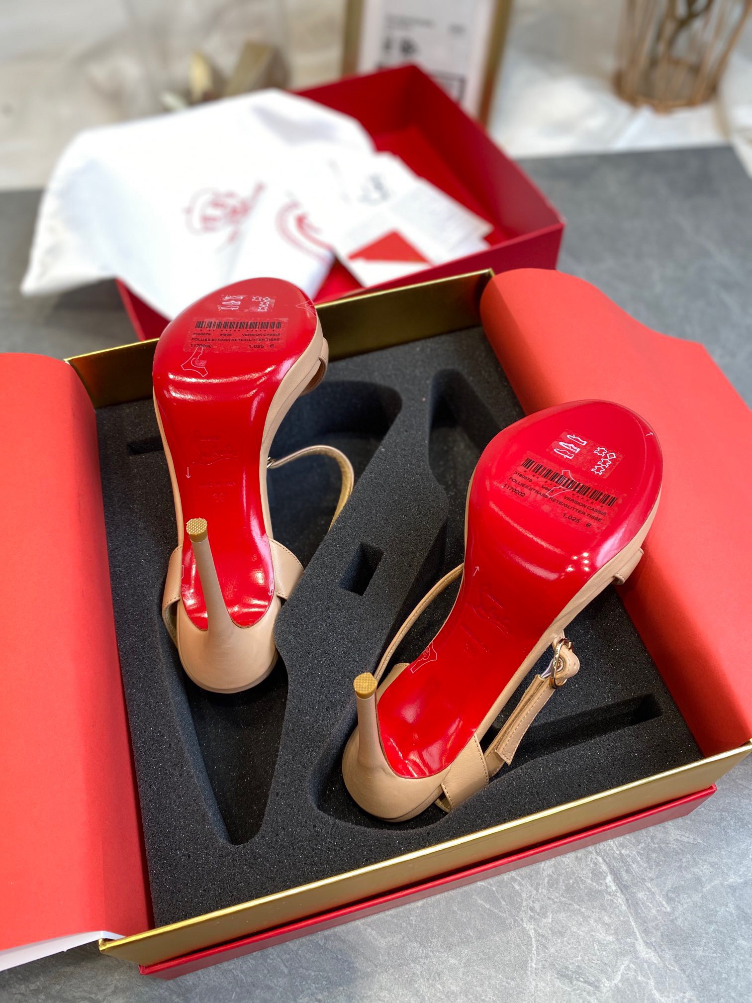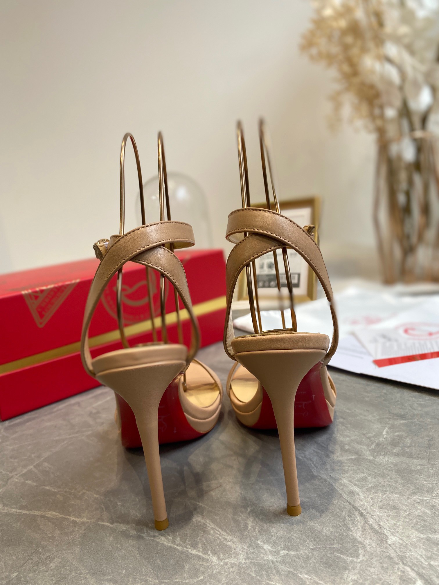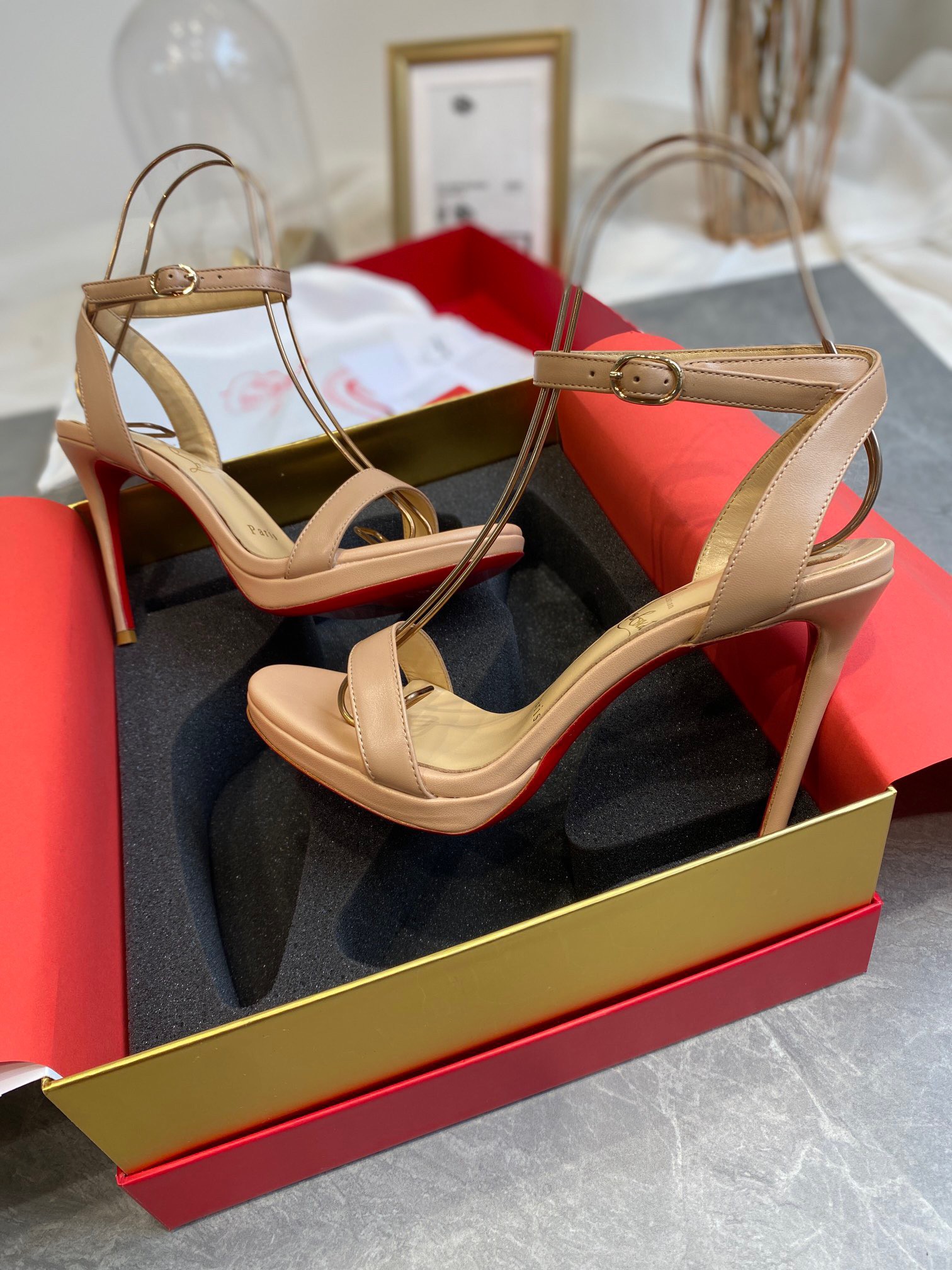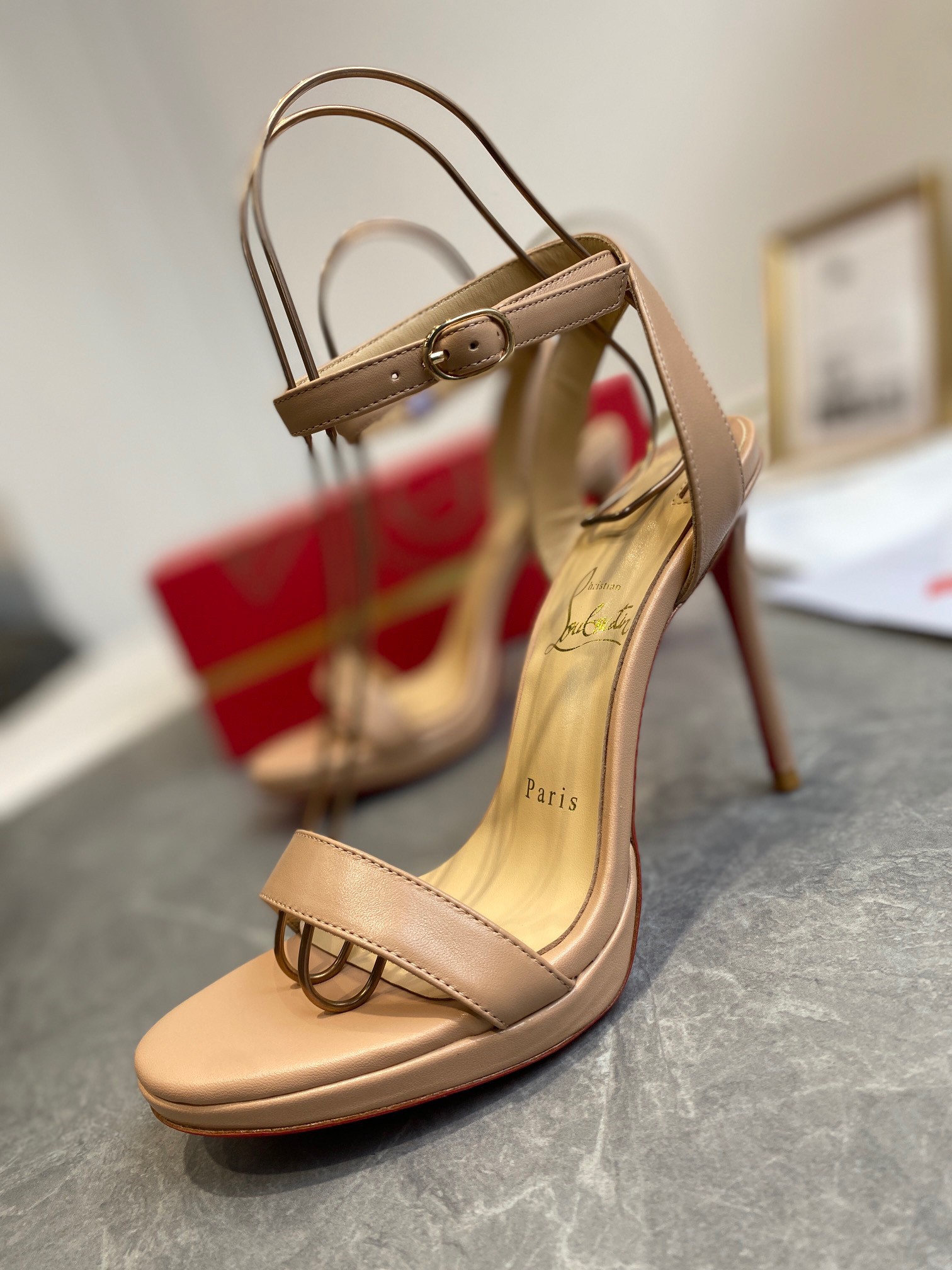 A slim platform and lofty 120mm wrapped stiletto add leg-lengthening lift to Christian Louboutin’s Loubi Queen in nappa leather. The open toe sandal is an elegant minimalist look that finds inspiration in traditional French cabaret. A graceful ankle strap, recalling the world of beautiful dancers and choker necklaces, is anchored with two thin straps reaching around and under the naked heel for added glamour.