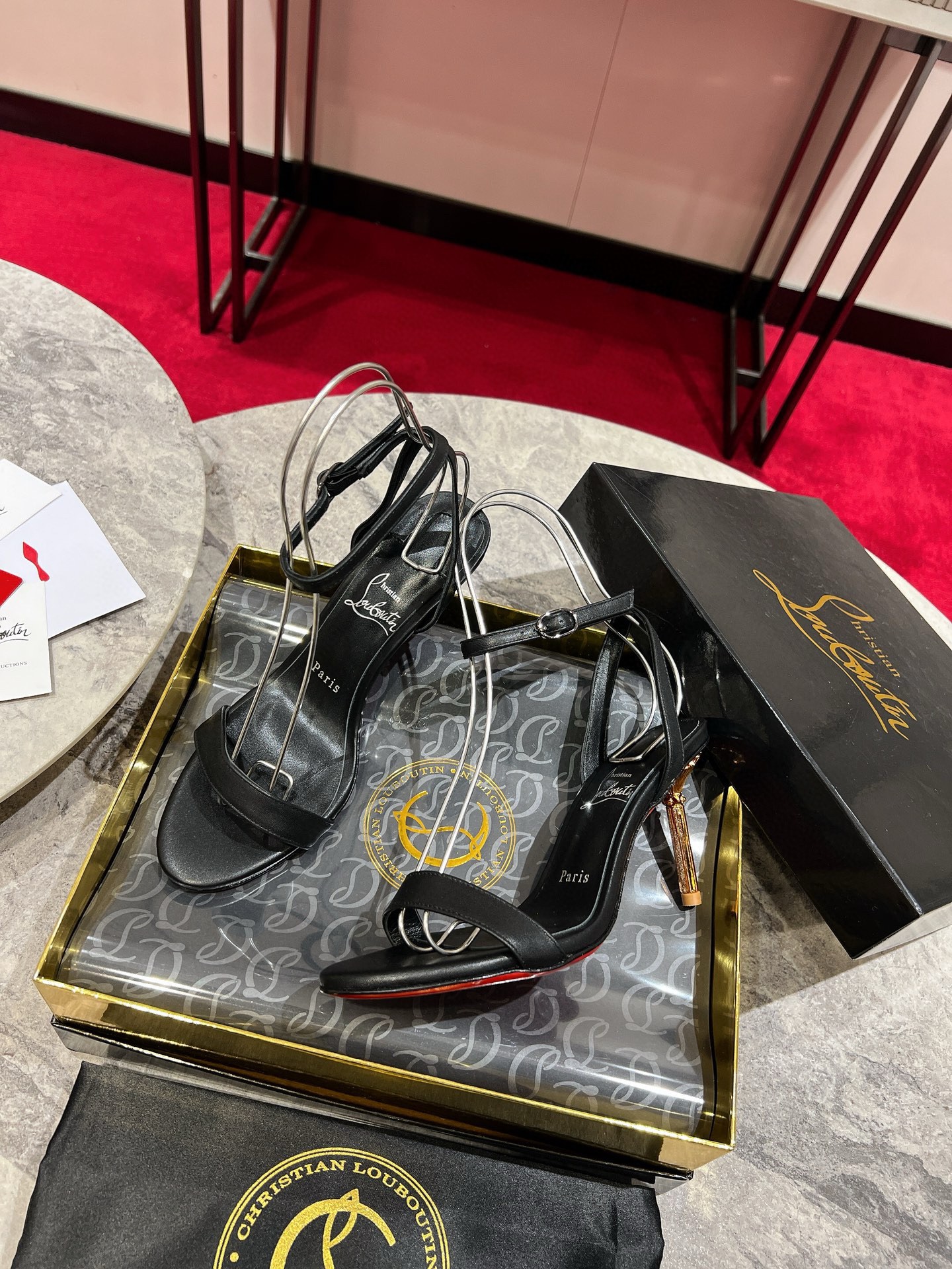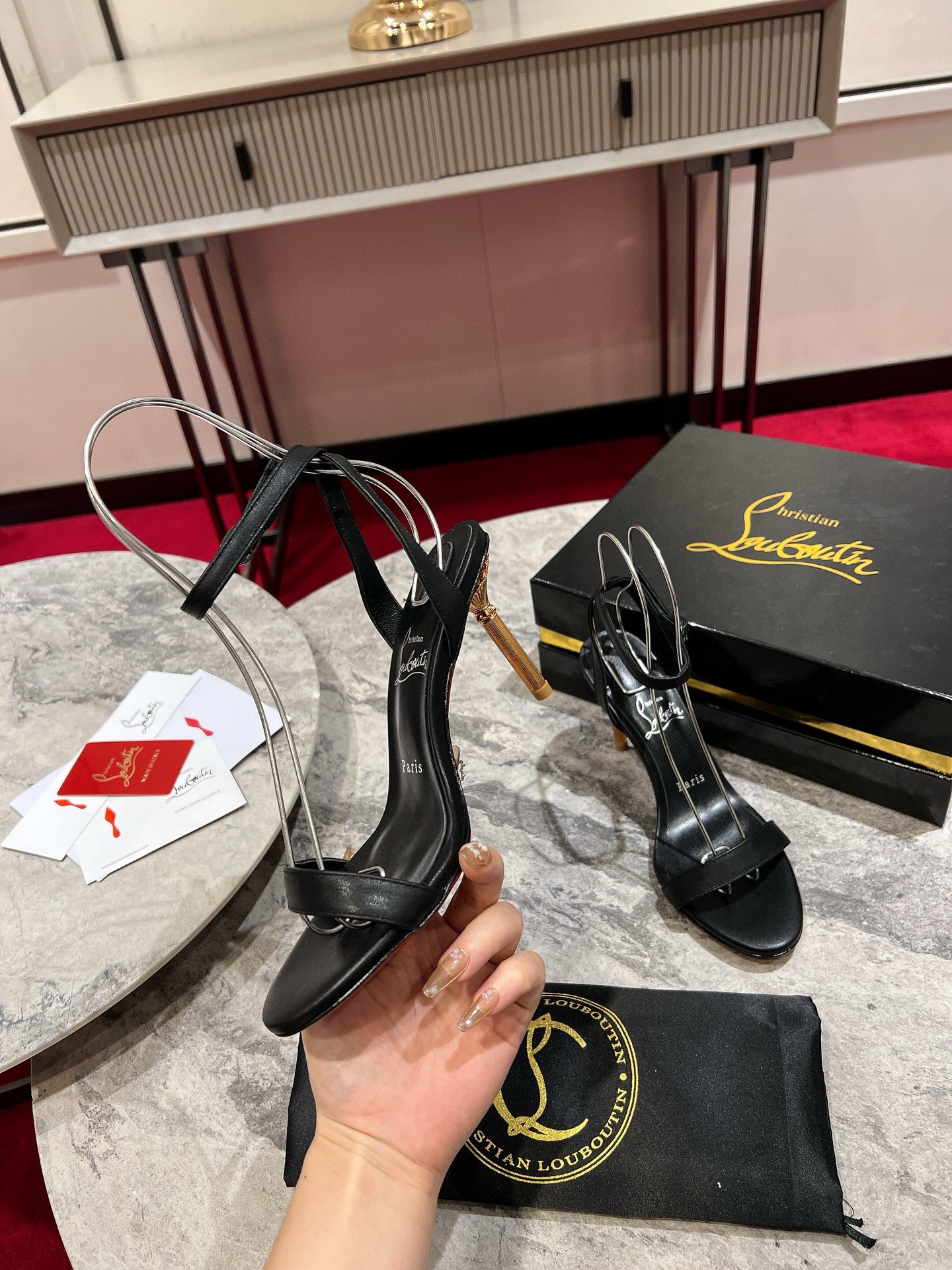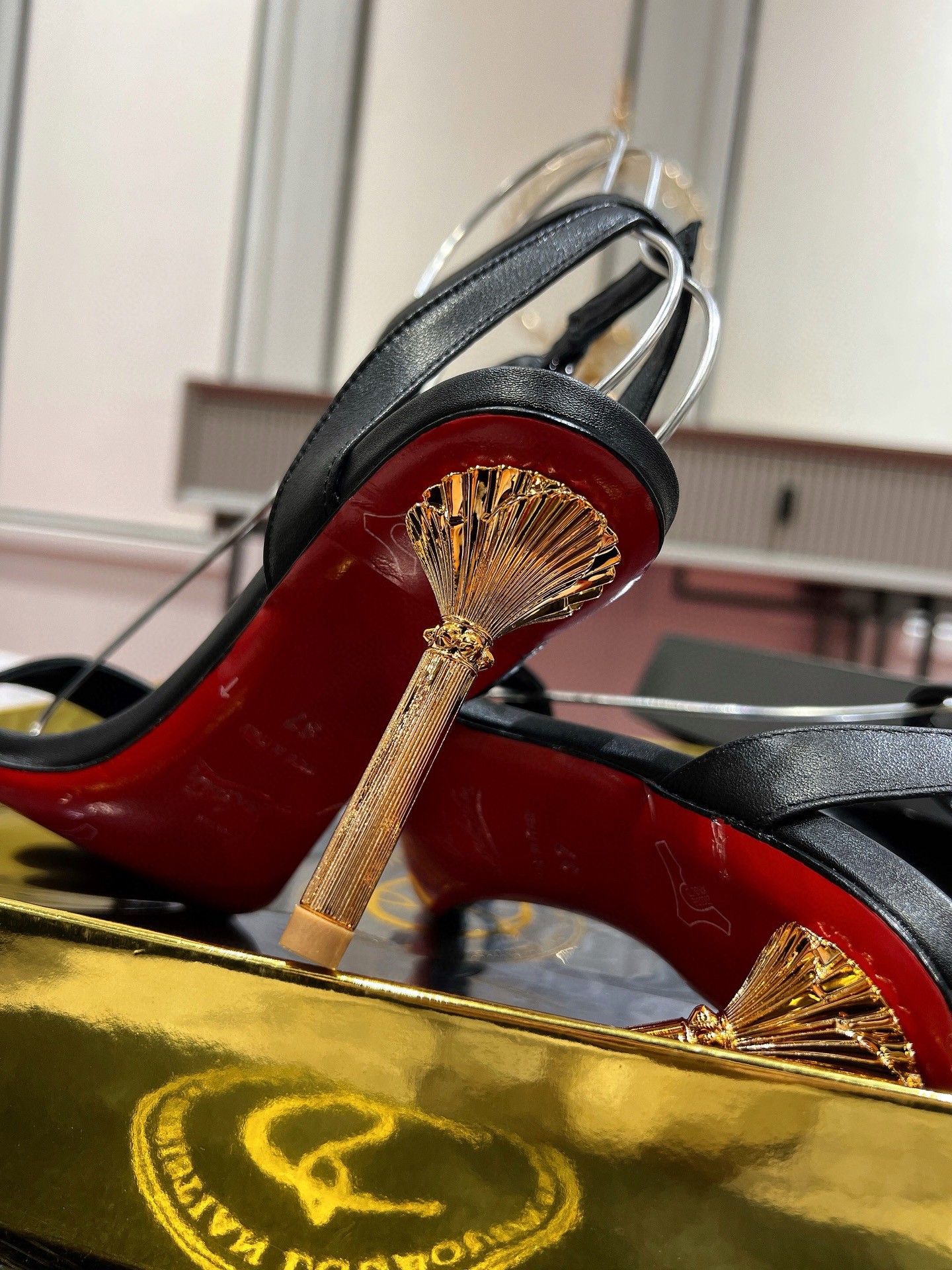 The Mascasandal is a like a jewel, packed with creative details. This sandal is crafted in black calf leather and features an 85 mm heel inspired by Maison Christian Louboutin’s mascara, evoking ancient columns. It has a slender strap around the ankle and a sophisticated low-cut vamp.