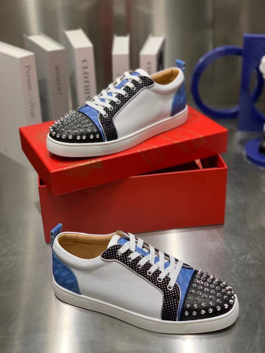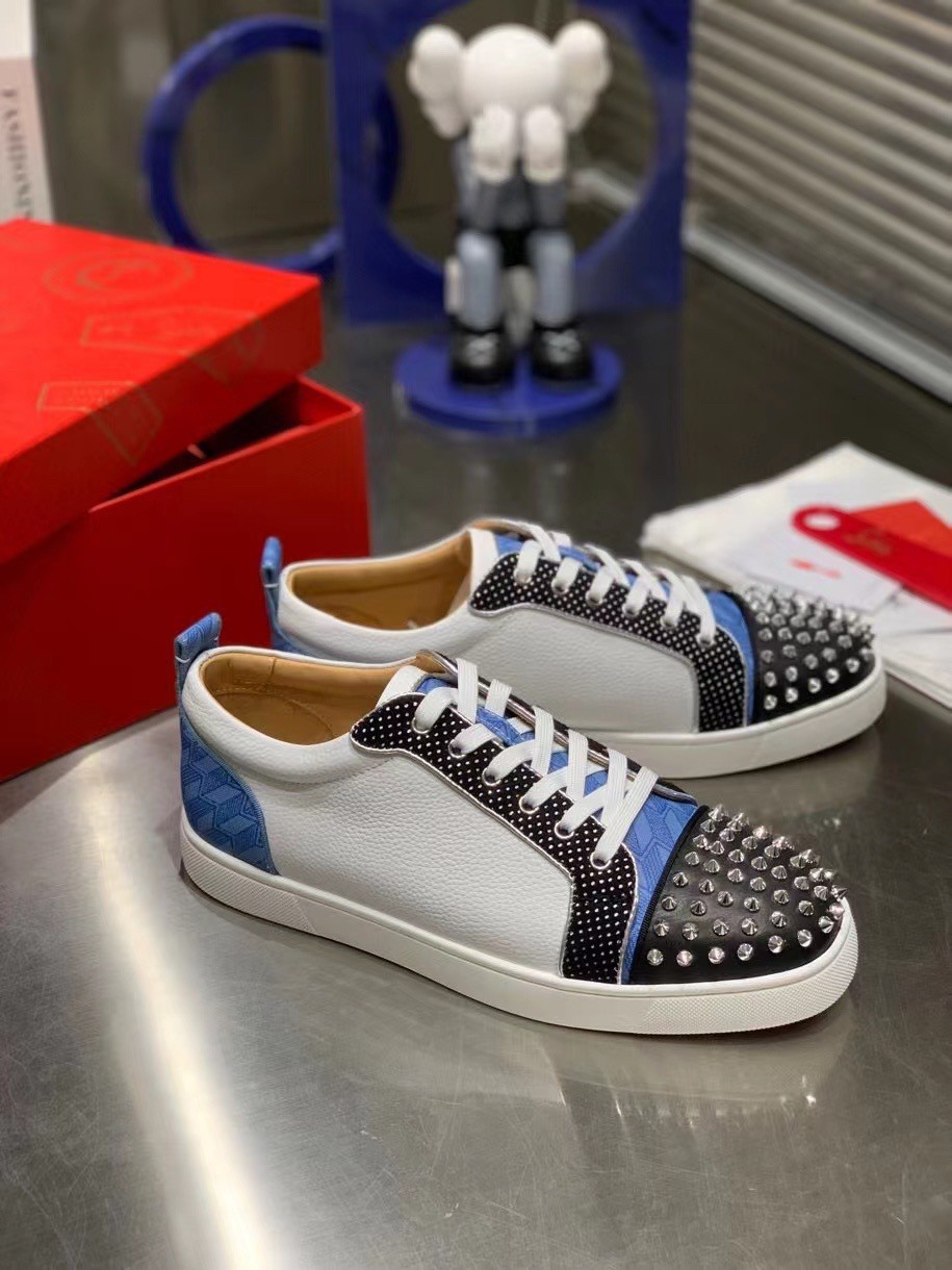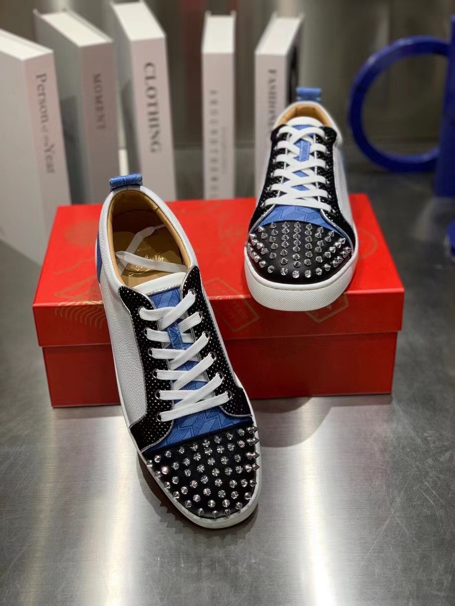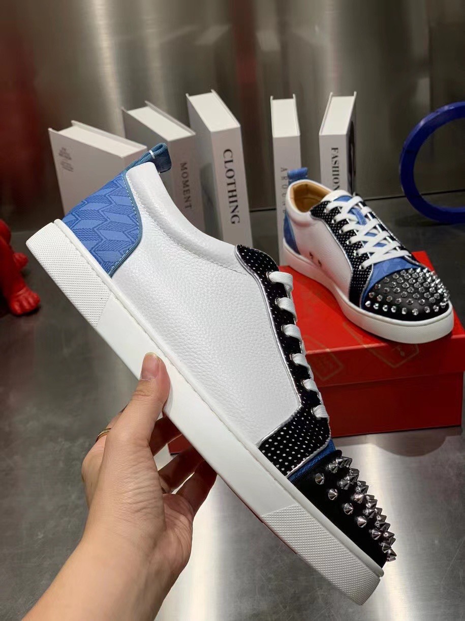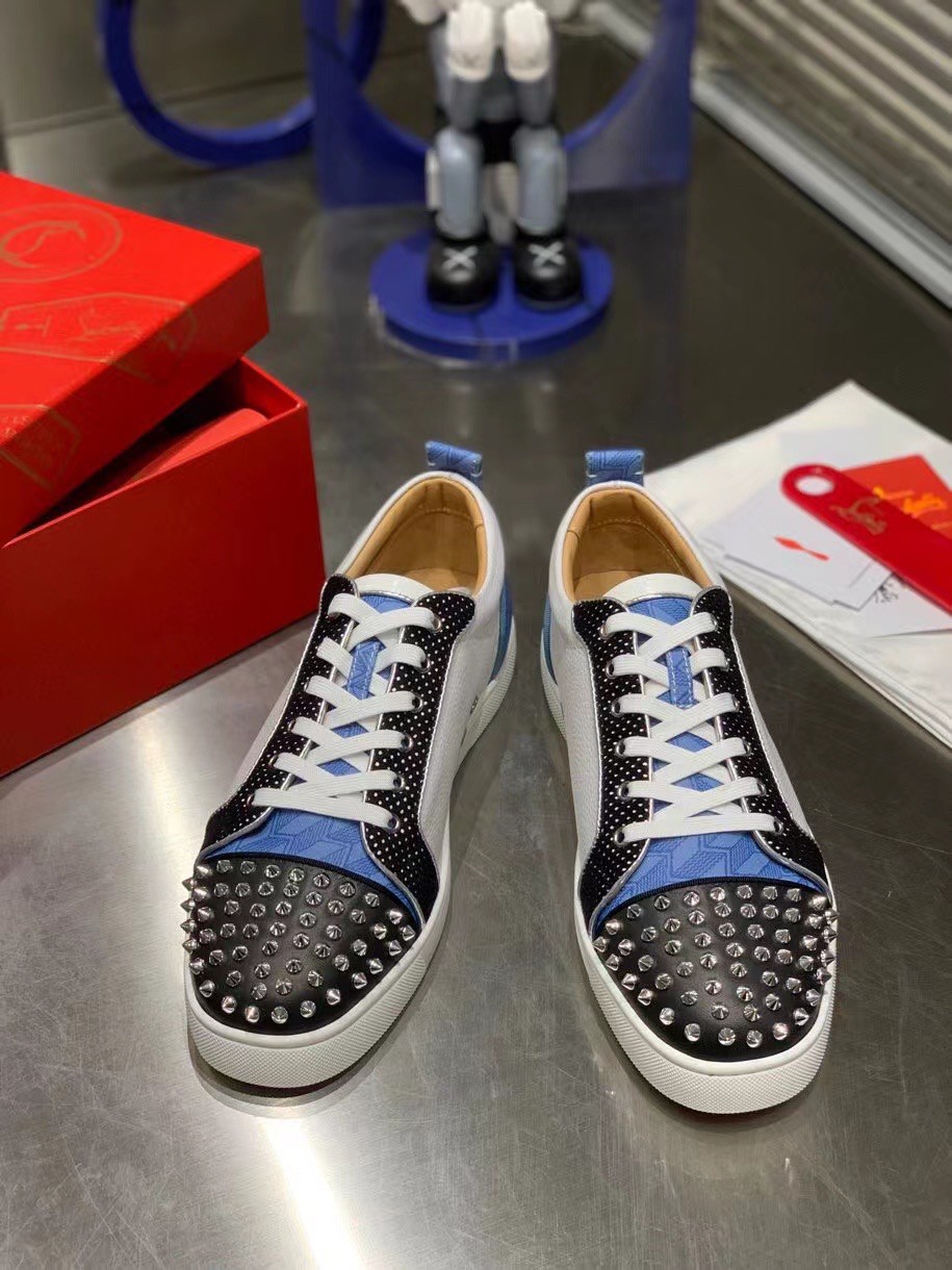 The Louis Junior Spikes Orlato low-top sneaker is inspired by the world of basketball and is mounted on a white rubber sole. With elegant and sporty lines, the vamp plays with textures, combining black and white calfskin with a plumetis fabric and a blue neoprene with a geometric pattern. It is enhanced with a discreet trim and the toe sports the Maison’s signature silver spikes.