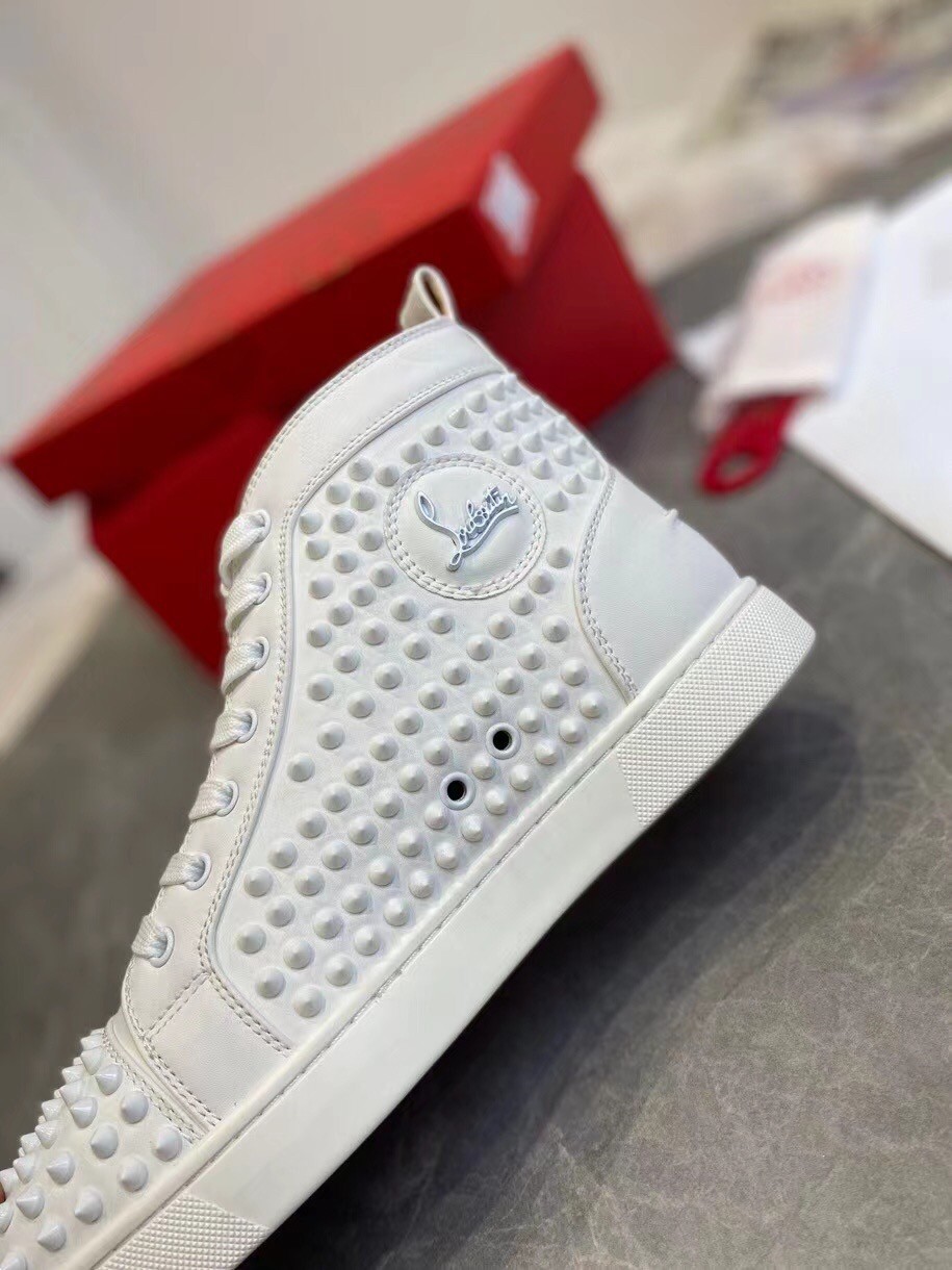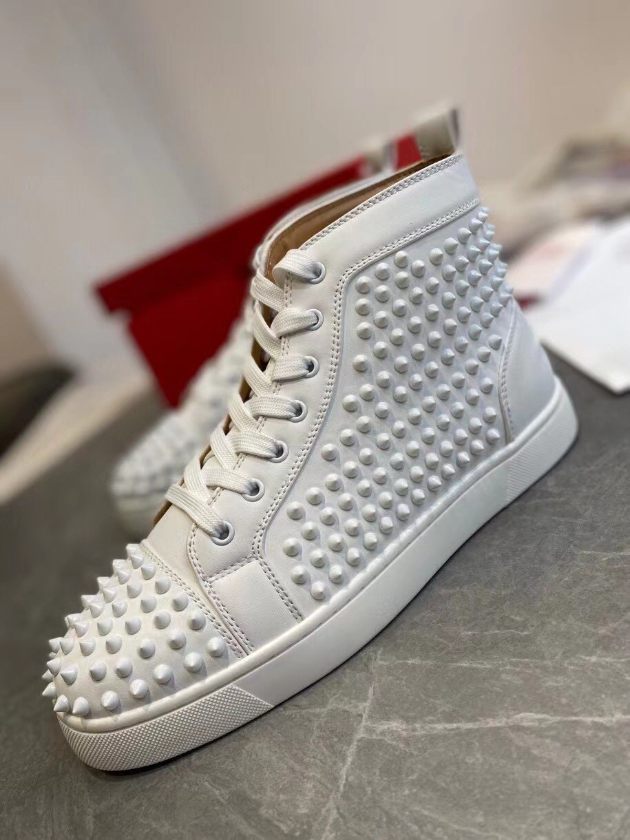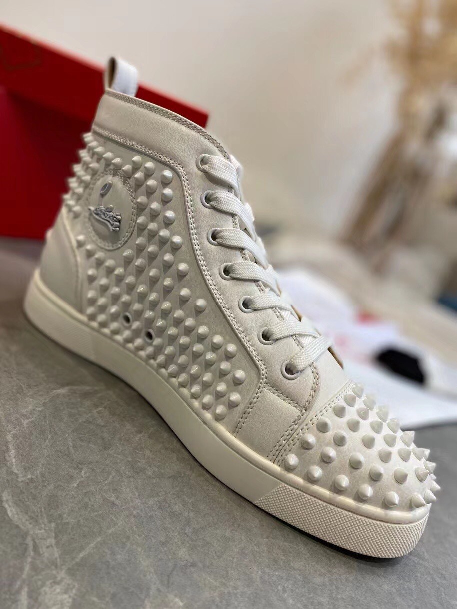 Christian Louboutin’s white calfskin Louis high-top sneakers are decorated with a covering of tonal signature spikes on the upper. The sophisticated and minimalist pair, with topstitching detail and a further stitched scar on the back counter, made their debut in 2009 and the designer has since been coming up with new iterations. They feature a deep toe box and work seamlessly with all of your on or off-duty looks.