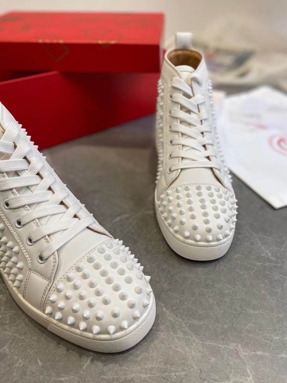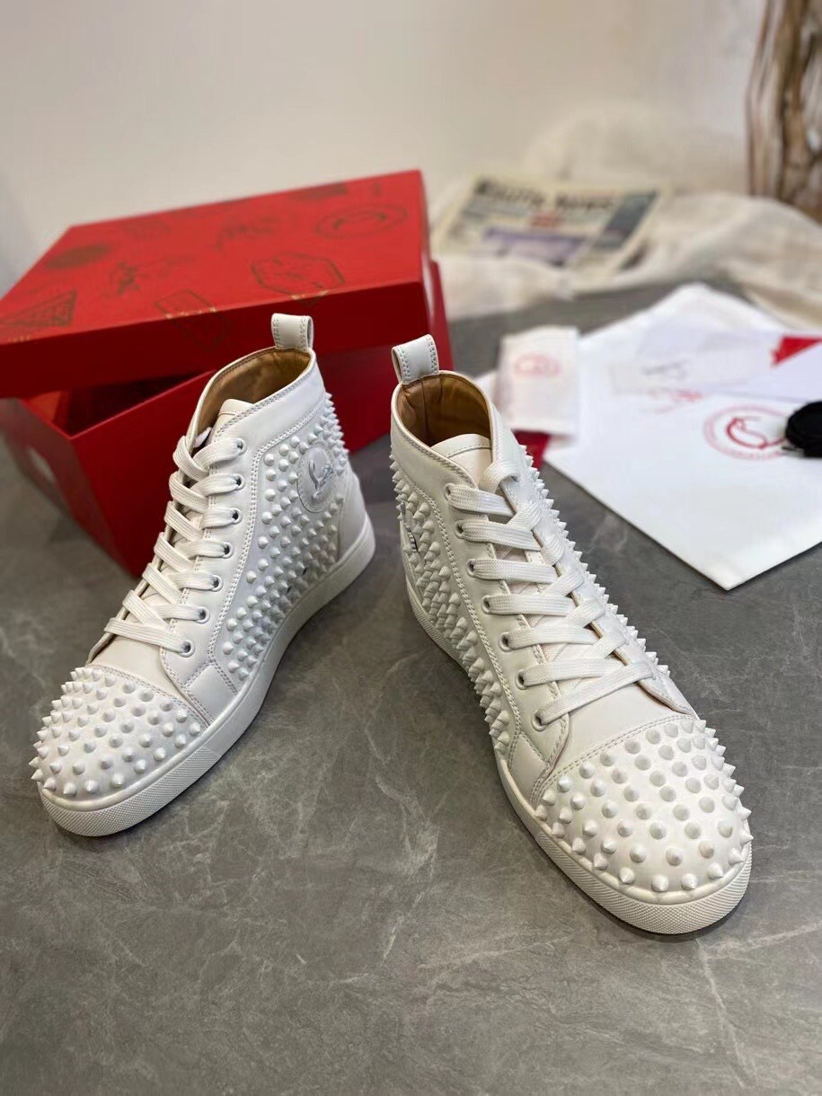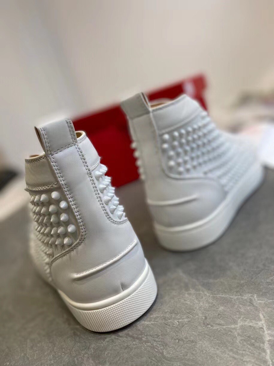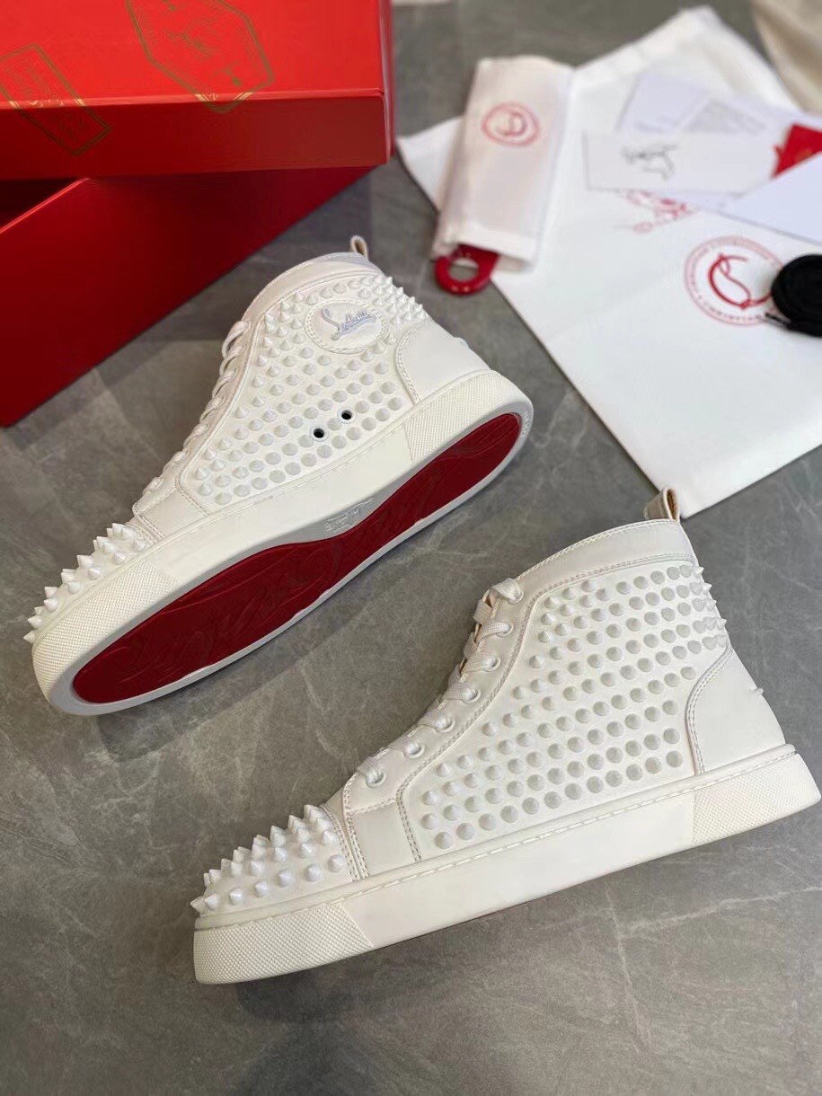 Christian Louboutin’s white calfskin Louis high-top sneakers are decorated with a covering of tonal signature spikes on the upper. The sophisticated and minimalist pair, with topstitching detail and a further stitched scar on the back counter, made their debut in 2009 and the designer has since been coming up with new iterations. They feature a deep toe box and work seamlessly with all of your on or off-duty looks.