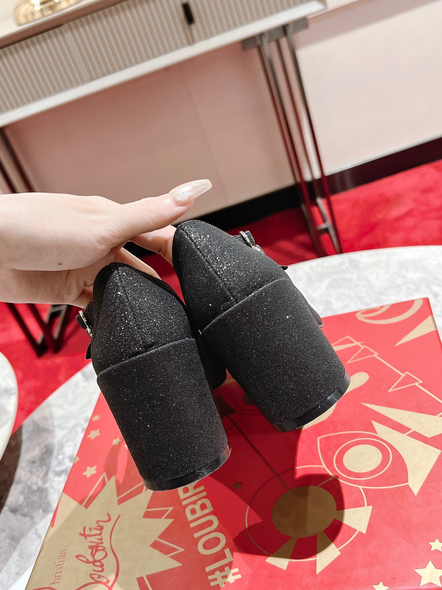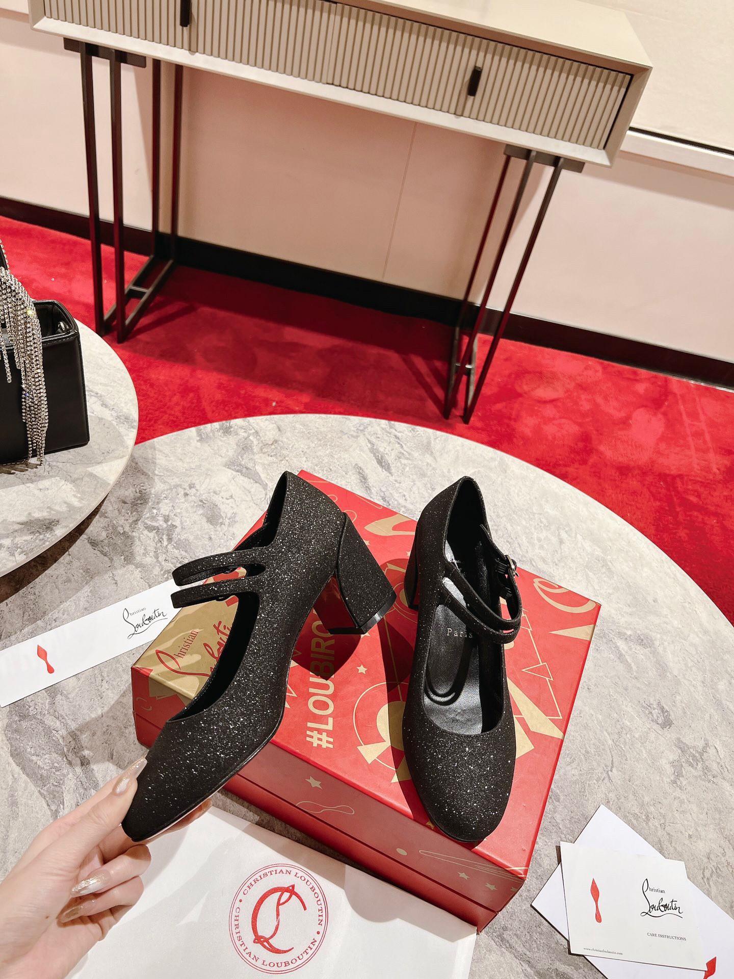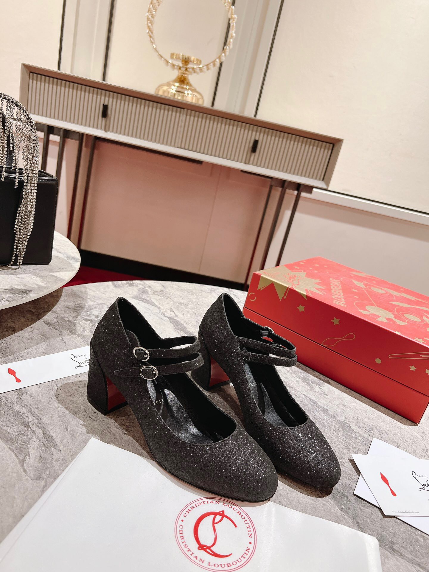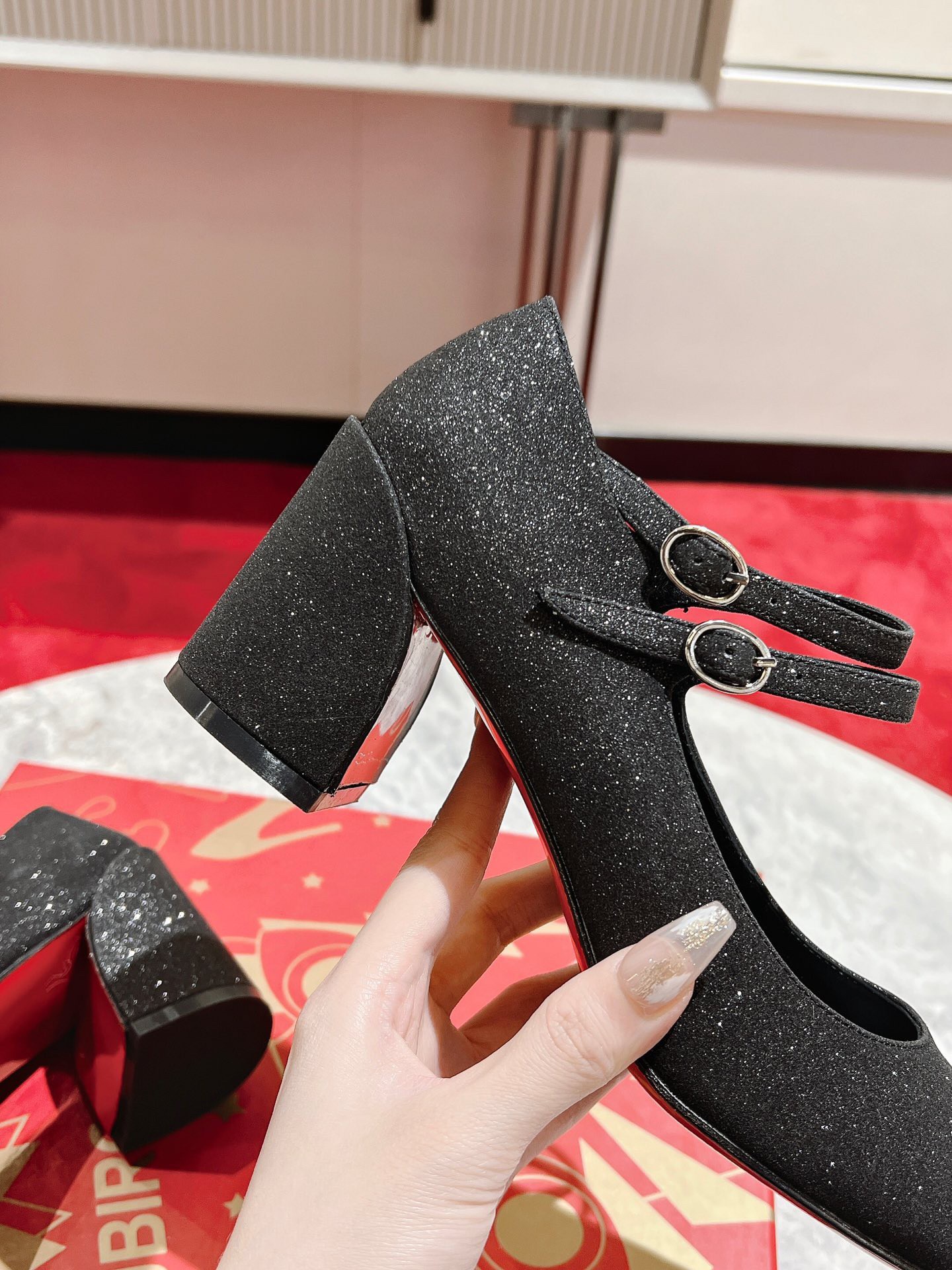 The slender Miss Jane pump features a square, angled 55 mm heel. Crafted in glitter leather, it has a rounded toe and Maison Christian Louboutin’s signature daring low-cut vamp. Enhanced with discreet finishing touches, it has two slim straps with a metallic clasp, delicately adorning the foot.