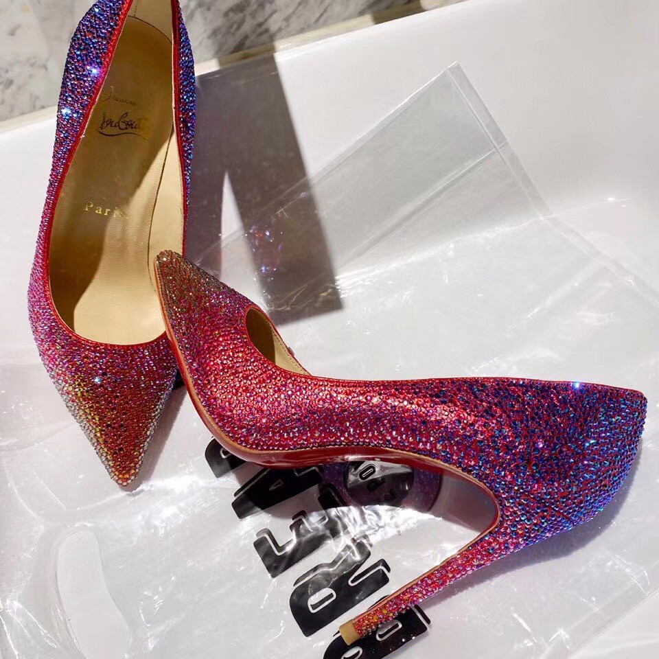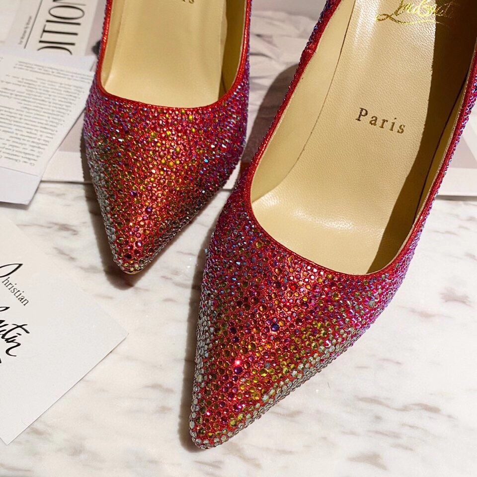 An iconic model, the Kate pump is cloaked in Red Veau Velours with hand-placed strass from toe to tip highlighting its elegant curves. Mounted on a 100mm heel, it raises the slender silhouette with accuracy, revealing with each step the savoir-faire of the Maison Christian Louboutin.