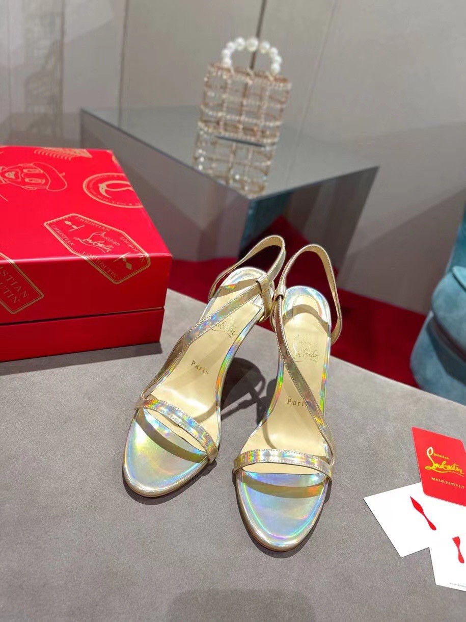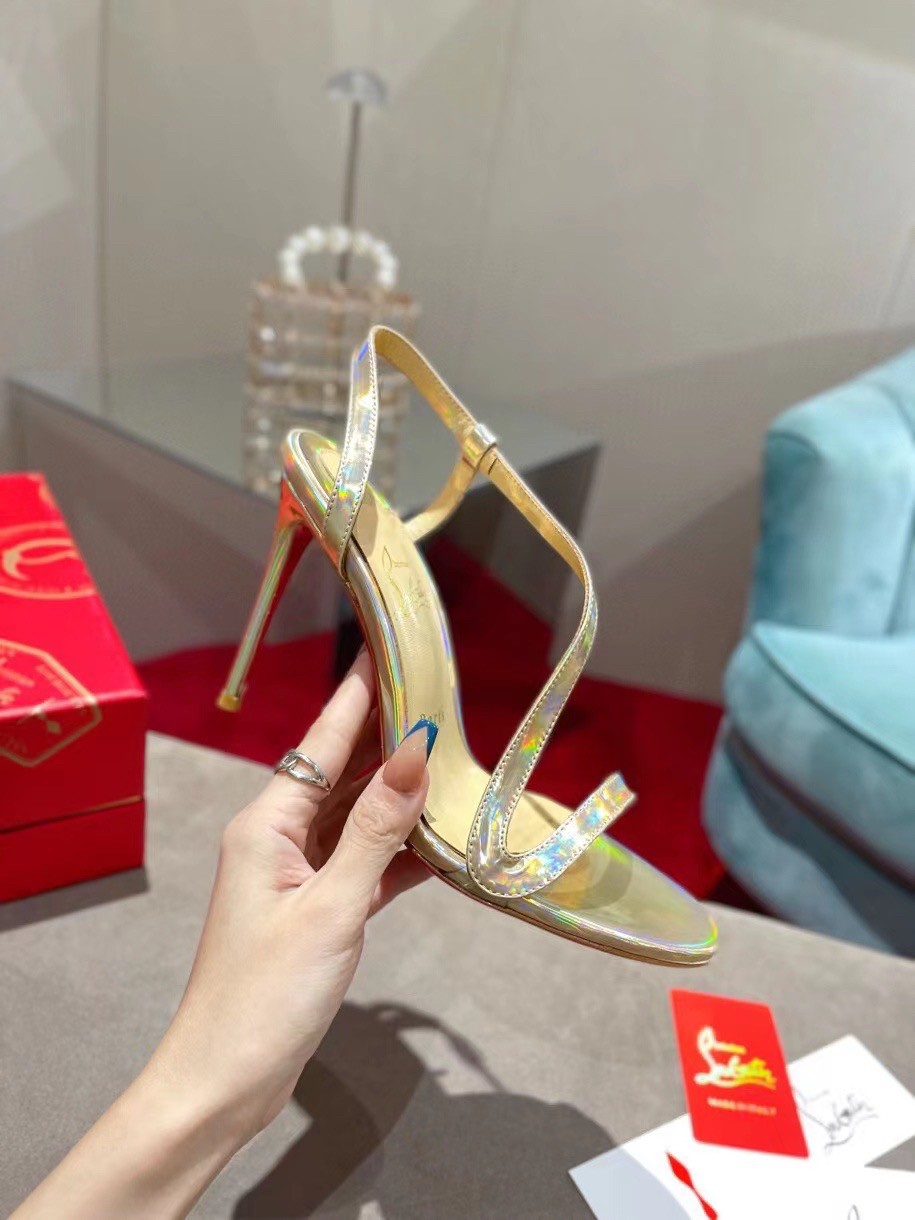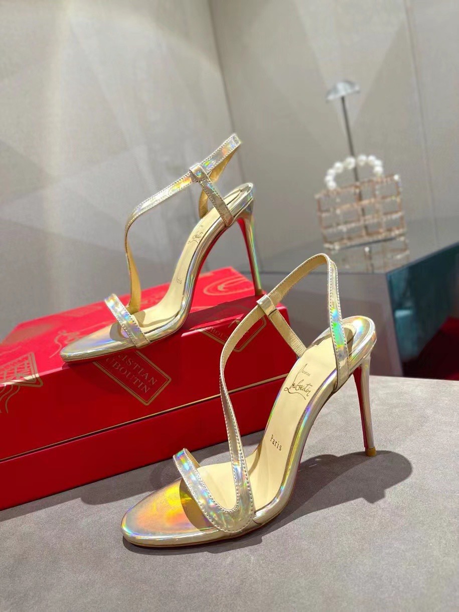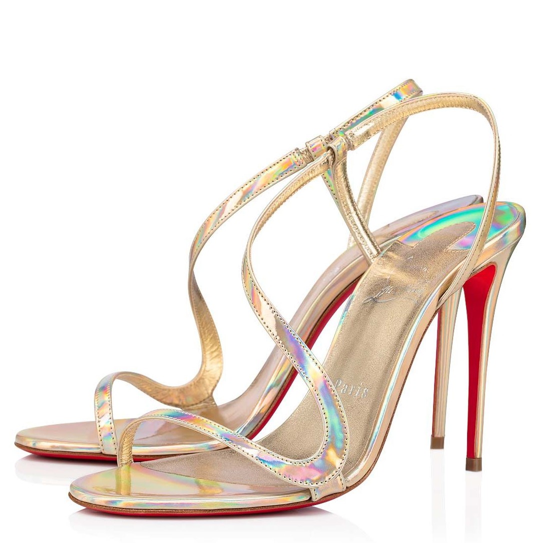 Simplicity and refinement are combined in the Rosalie, a contemporary take on the classic stiletto sandal. The upper incorporates an innovative design, formed of a narrow strap with a two-piece construction, supported by a post strap. Starting in a sling-back, this strap winds around the foot, ending in a wavy design over the toe. This version comes in Patent Psychic, with cosmic iridescent tones, and a slender 100-mm stiletto heel.