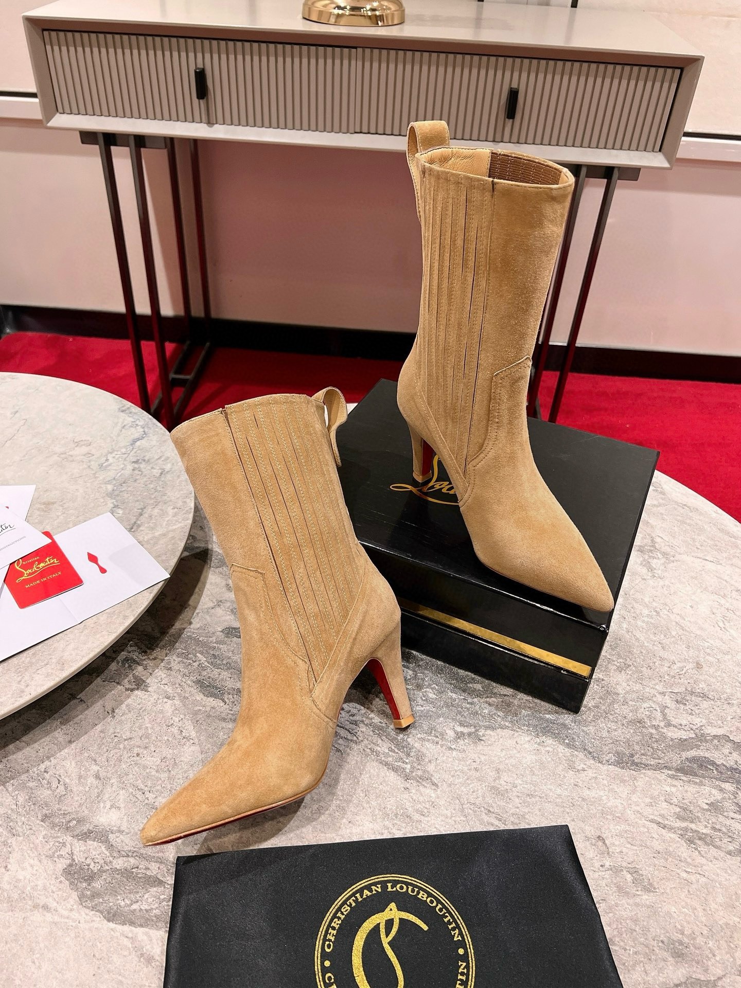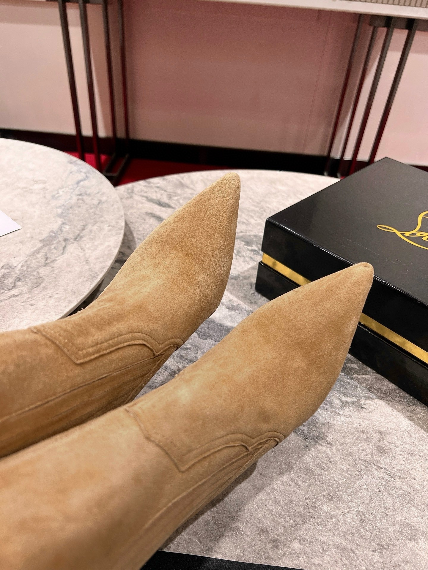 The Santiagag ankle boot has an innovative Wild West-inspired design. This model is crafted in Lionne brown veau velours and features a pointed toe and elasticated panels covered by strips of leather. It is set on an 85 mm heel and is adorned with a silver Maison Christian Louboutin signature spike.