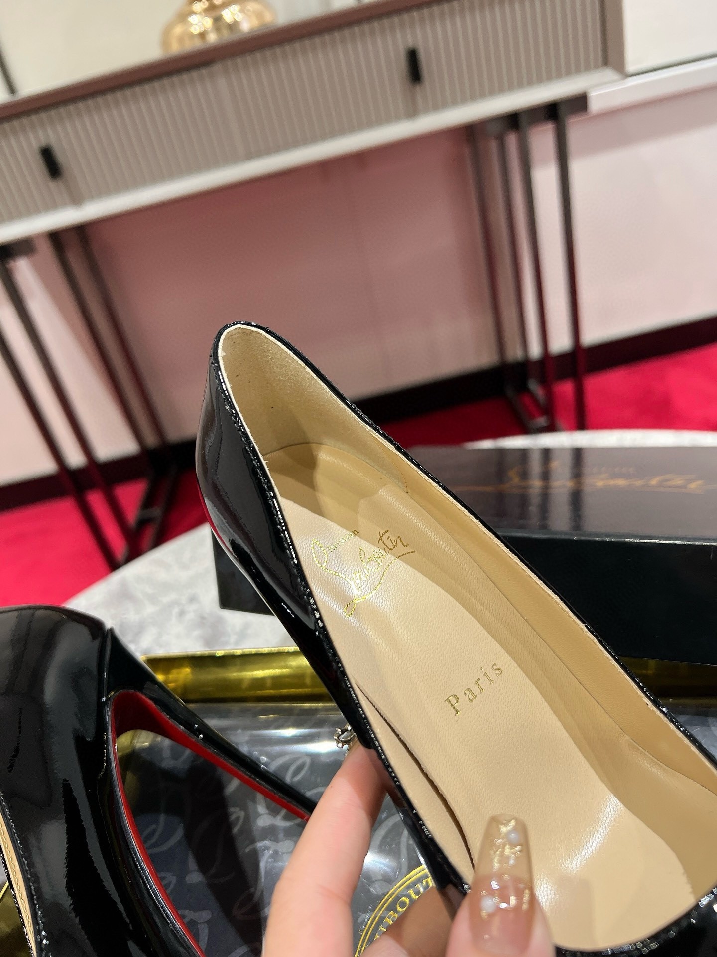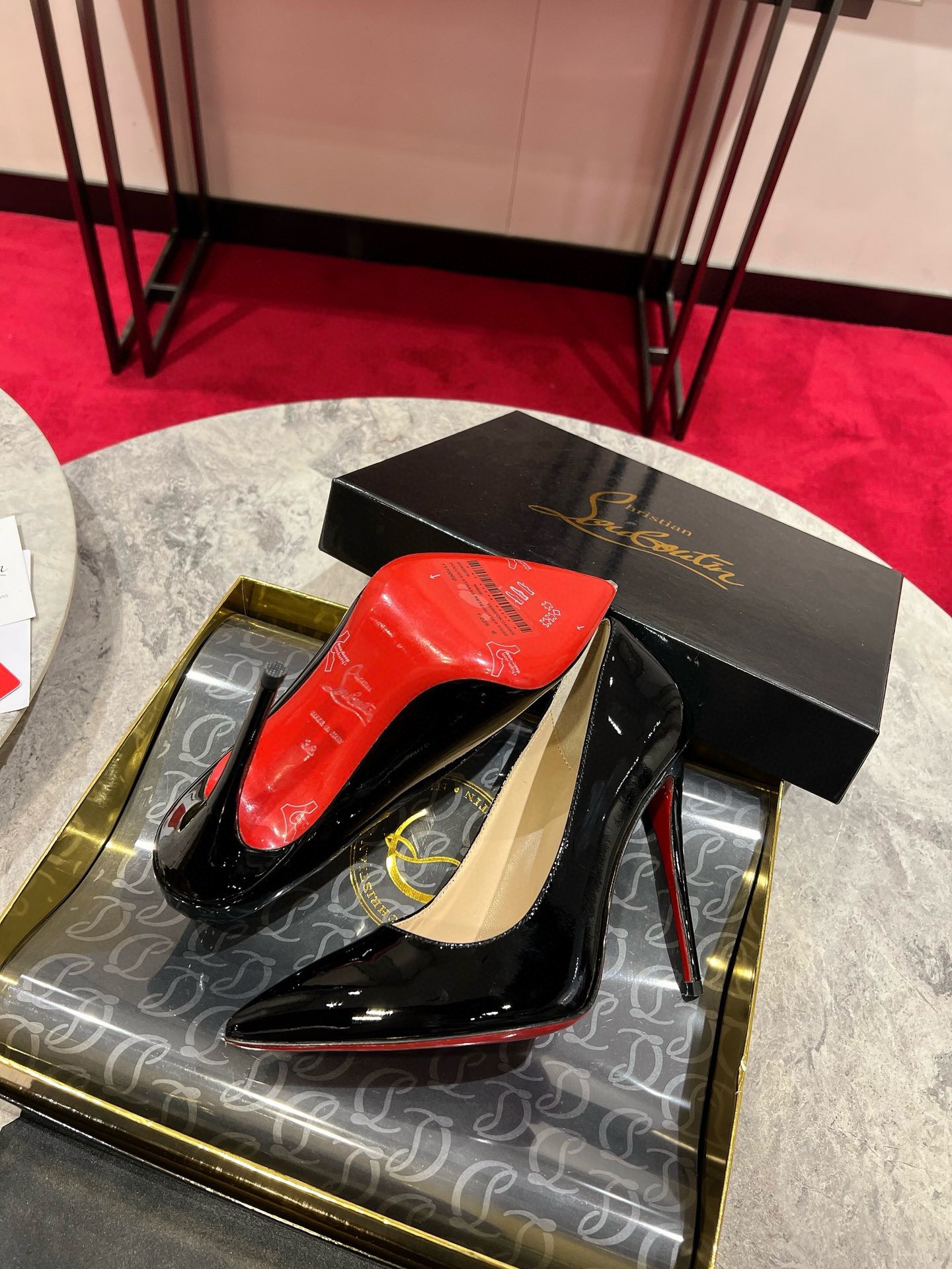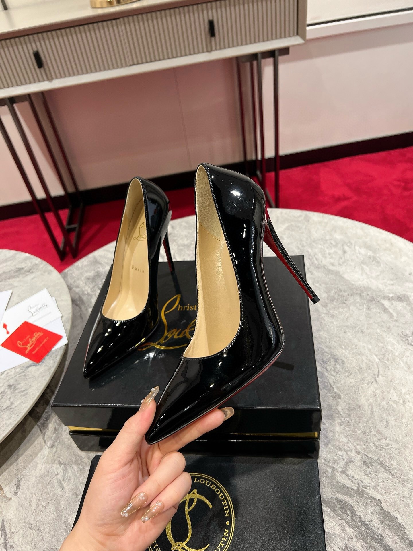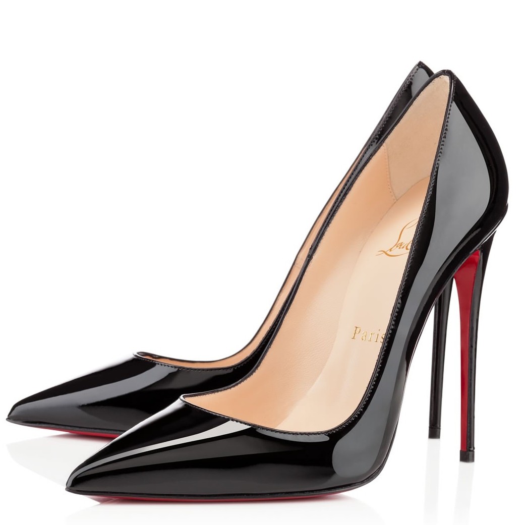 The So Kate iconic pump with timeless elegance brilliantly combines discretion and sophistication. Its glossy patent calfskin features a sculpted upper that extends its lines to the iconic bold cut. It sits easy atop a slender 120 mm heel to give you confidence, underlining Maison Christian Louboutin know-how.