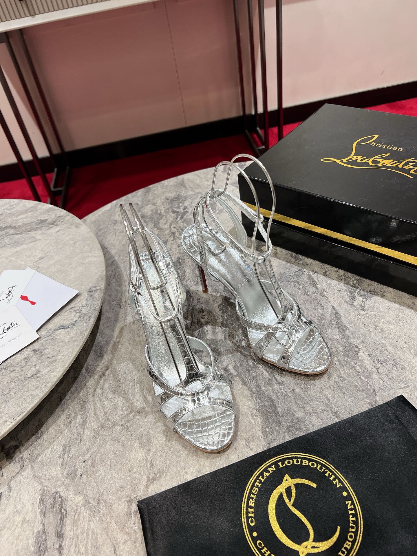 With its plunging vamp, the Tangueva sandal elegantly reveals the foot. This Maison Christian Louboutin model is crafted in iridescent silver calf leather with a textured scale effect. It sits on a 100 mm heel with a small platform and has straps at the front creating a graphic effect. This sophisticated model has a metallic clasp on the side.