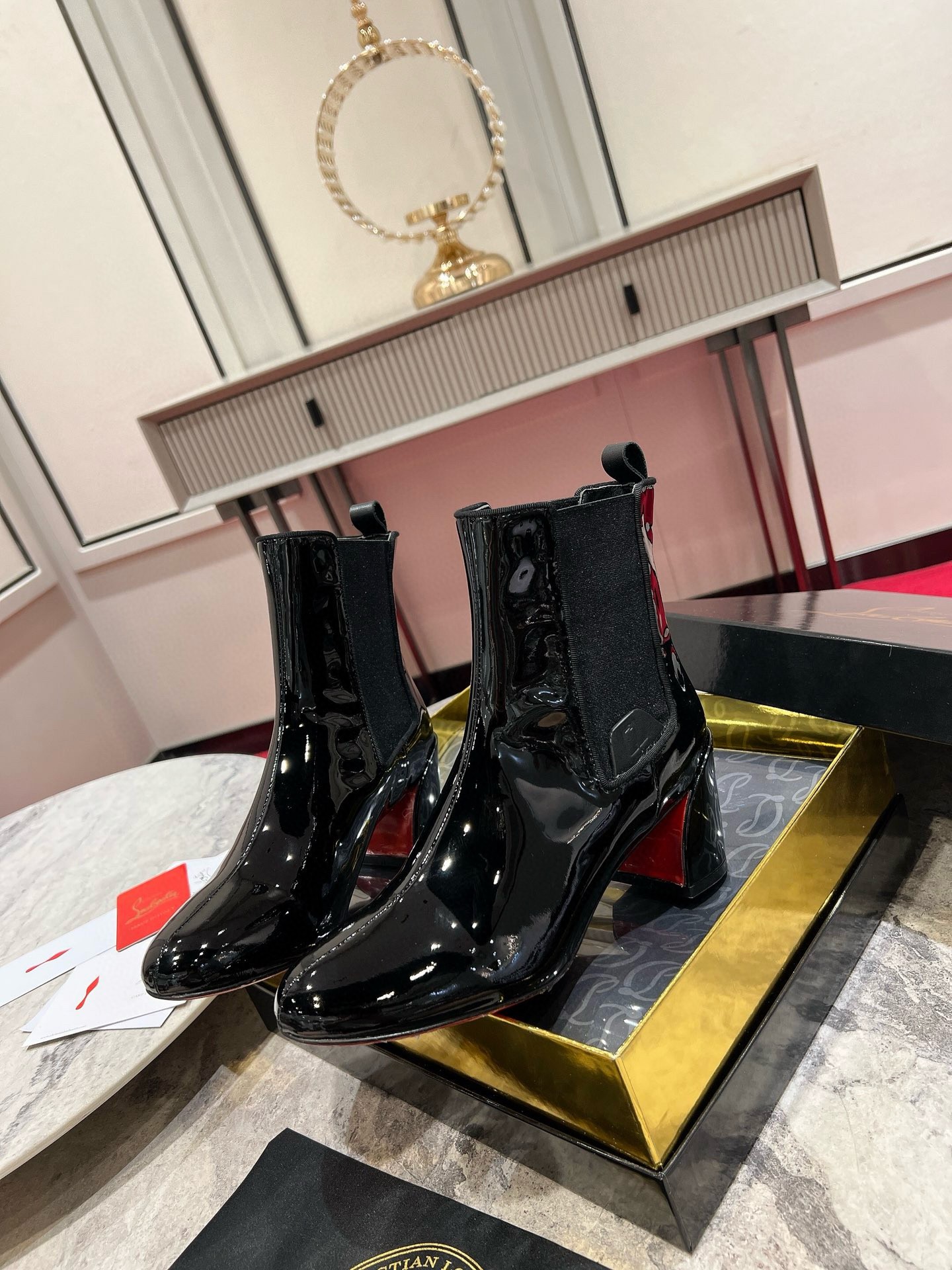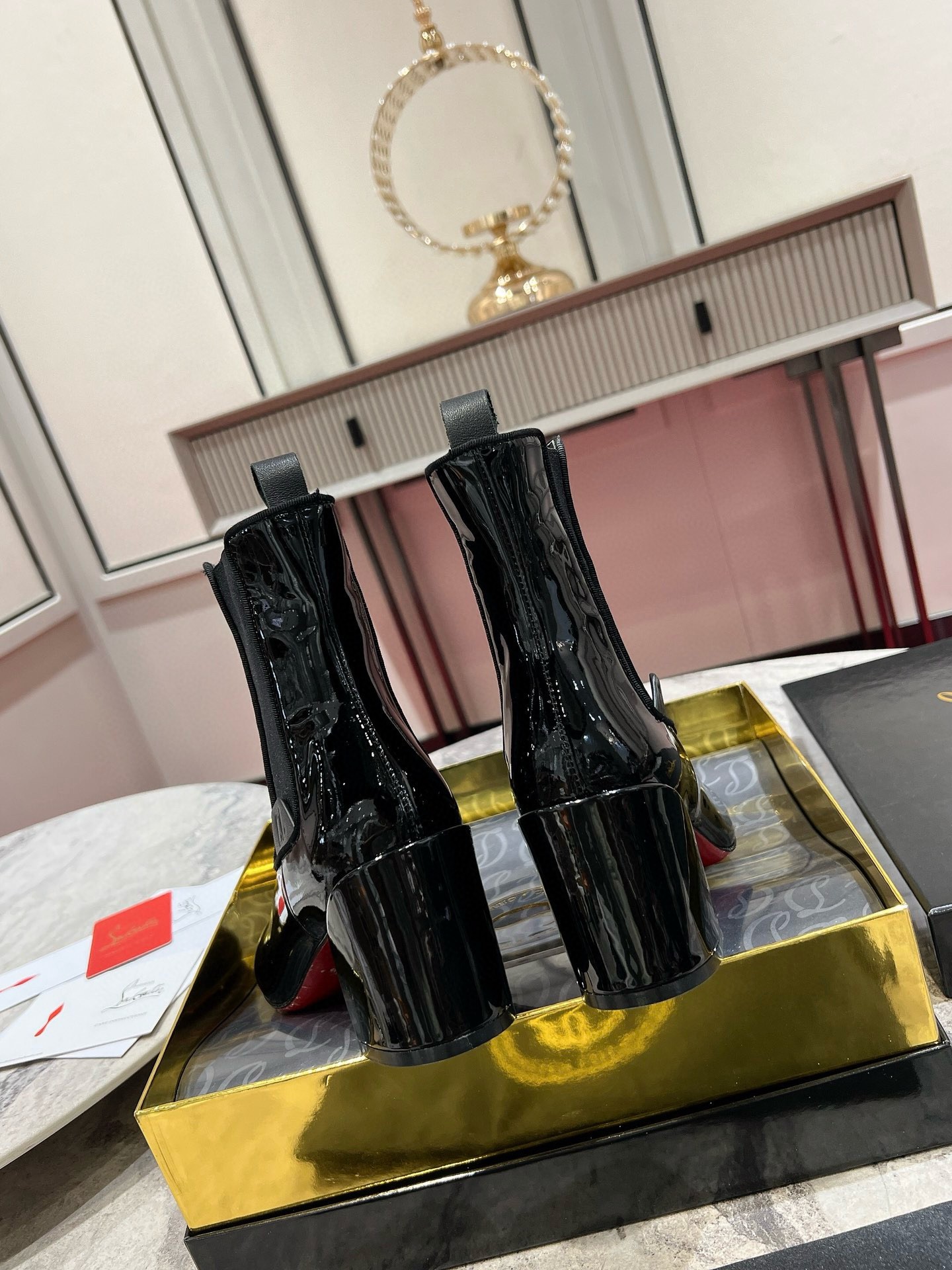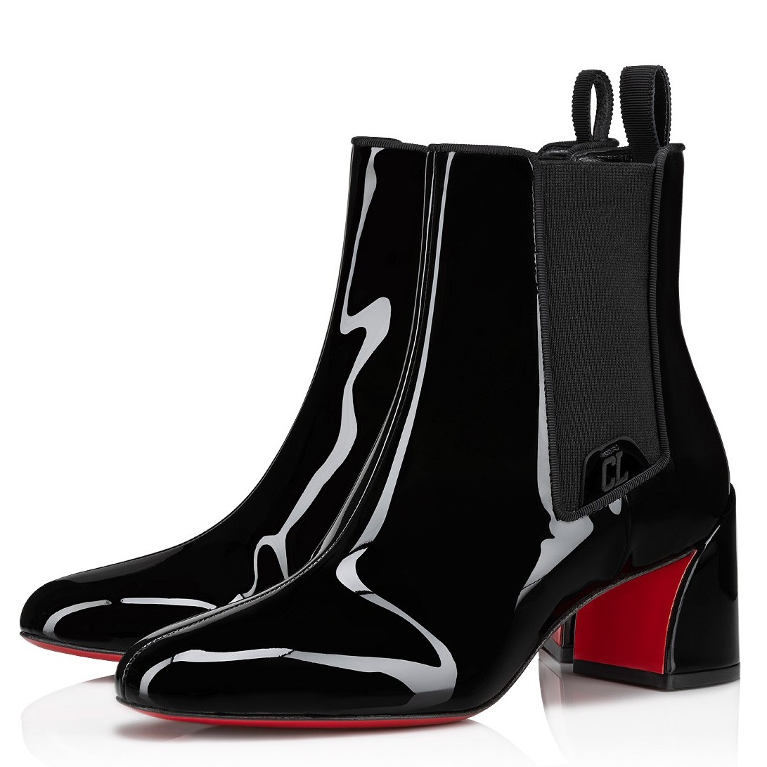 Showcasing the timeless codes that are synonymous with Maison Christian Louboutin, the Turelastic boot is crafted in glossy black patent soft, supple leather. It features a chunky asymmetric 55 mm heel, revealing that iconic flash of red sole. The sides have elastic panels making this boot easy to pull on and off and a small CL logo tab adorns the outer side.