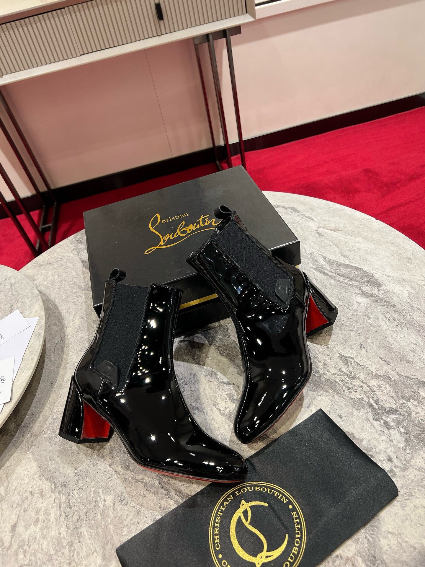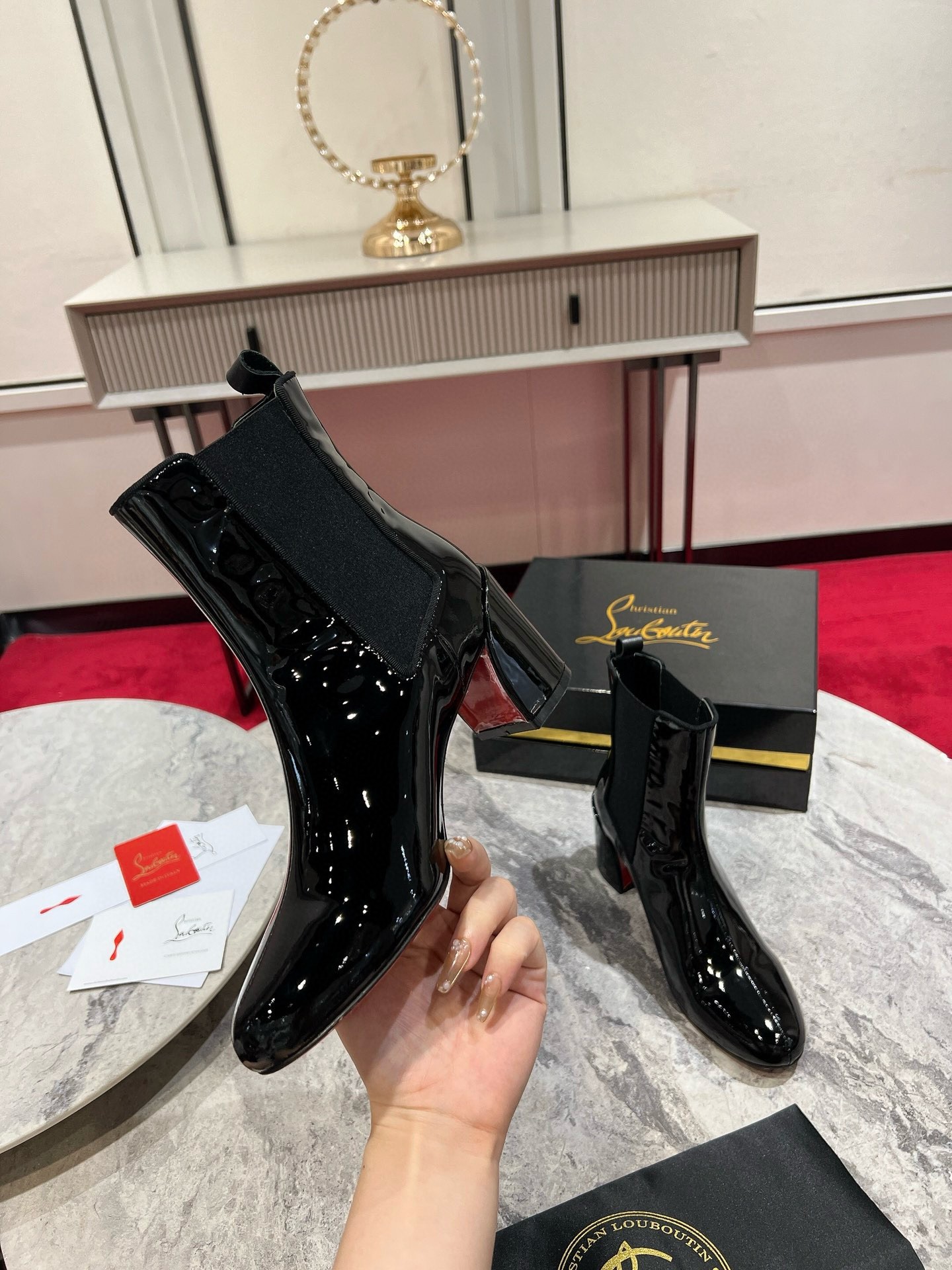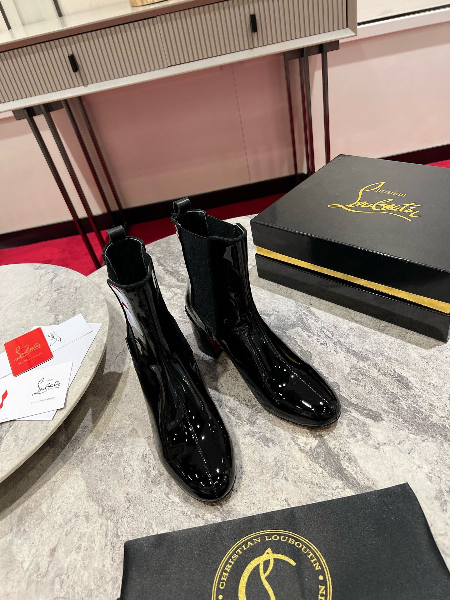 Showcasing the timeless codes that are synonymous with Maison Christian Louboutin, the Turelastic boot is crafted in glossy black patent soft, supple leather. It features a chunky asymmetric 55 mm heel, revealing that iconic flash of red sole. The sides have elastic panels making this boot easy to pull on and off and a small CL logo tab adorns the outer side.