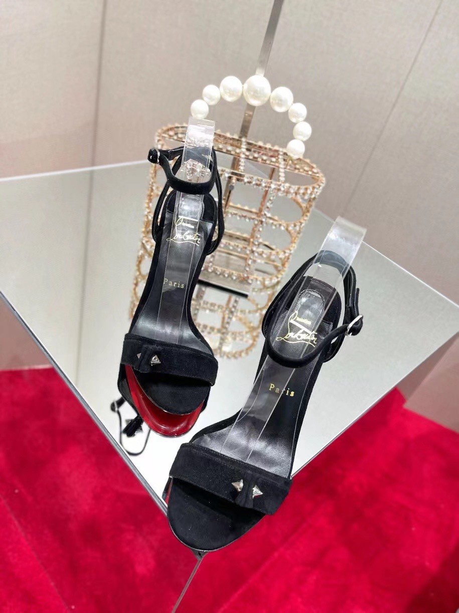 The timeless Umberta sandal dresses the foot with elegance and refinement. This model is set high on a 100 mm heel and is designed in black calfskin suede. The strap is pleated and embellished with two Maison Christian Louboutin signature silver spikes. This shoe is fitted with a fine strap that gracefully encircles the ankle and offers irresistibly sophisticated style.